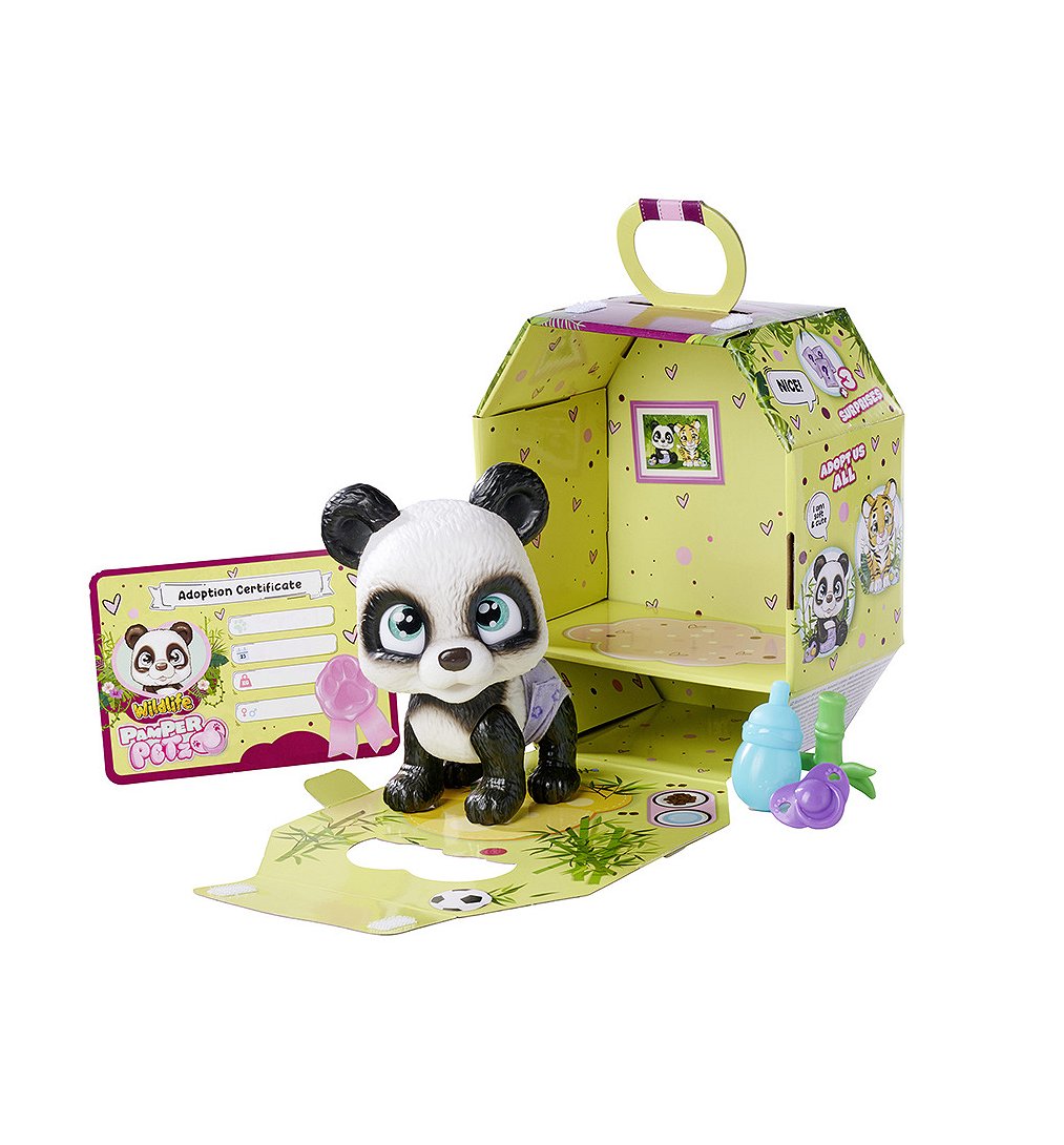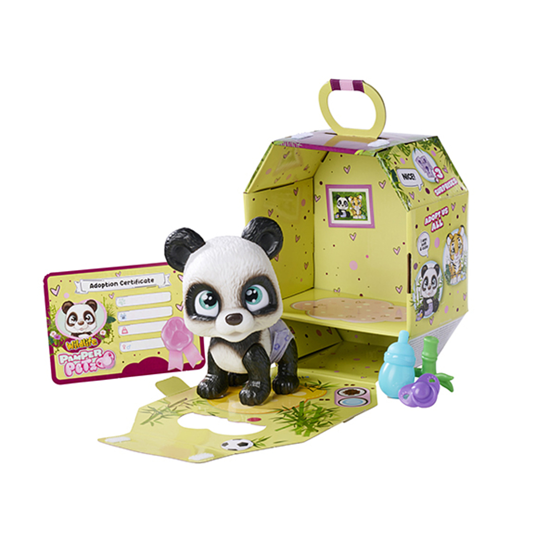 Pamper Petz Panda. Ce joli panda boit son biberon et fait ensuite pipi dans sa couche. La couche change de couleur quand il fait pipi.