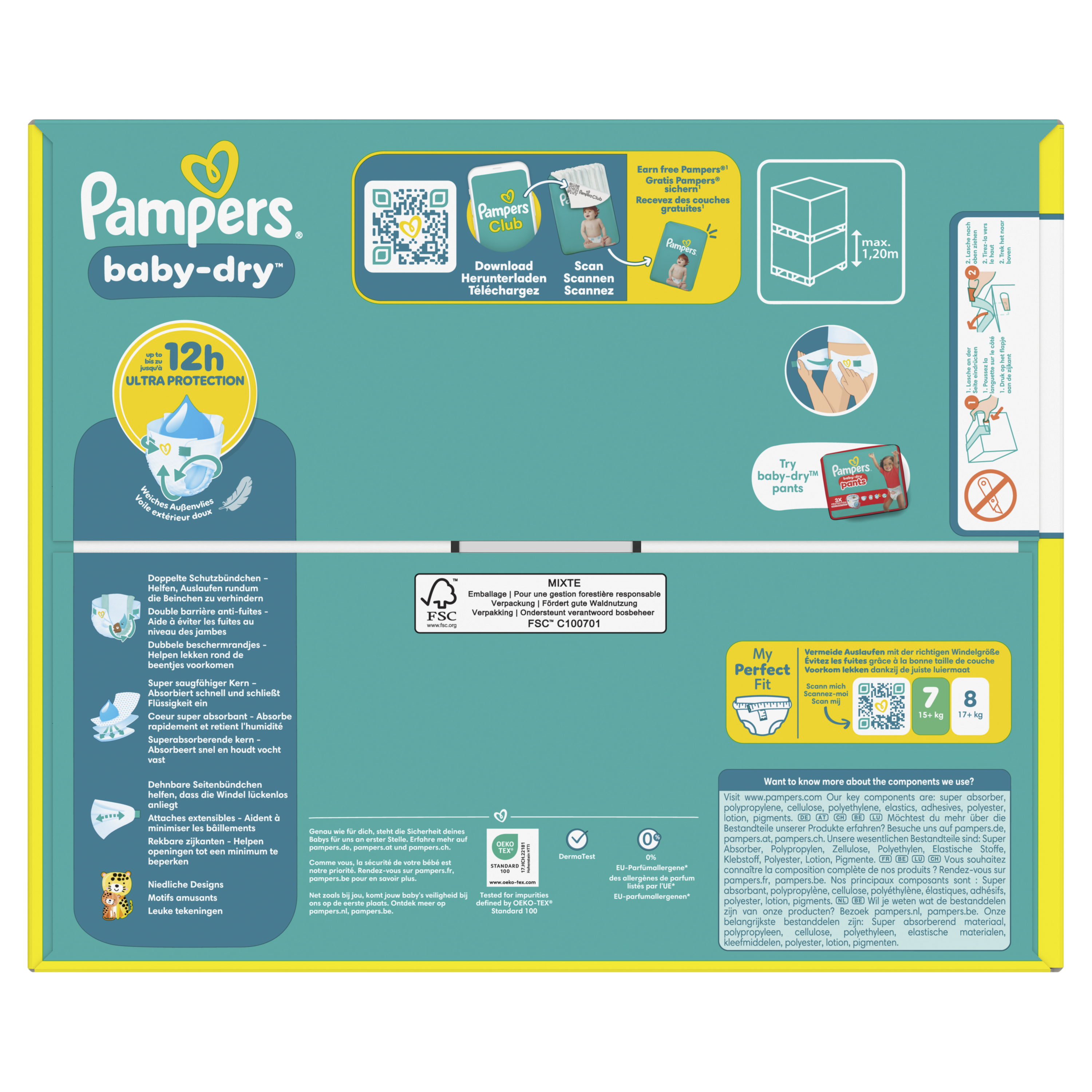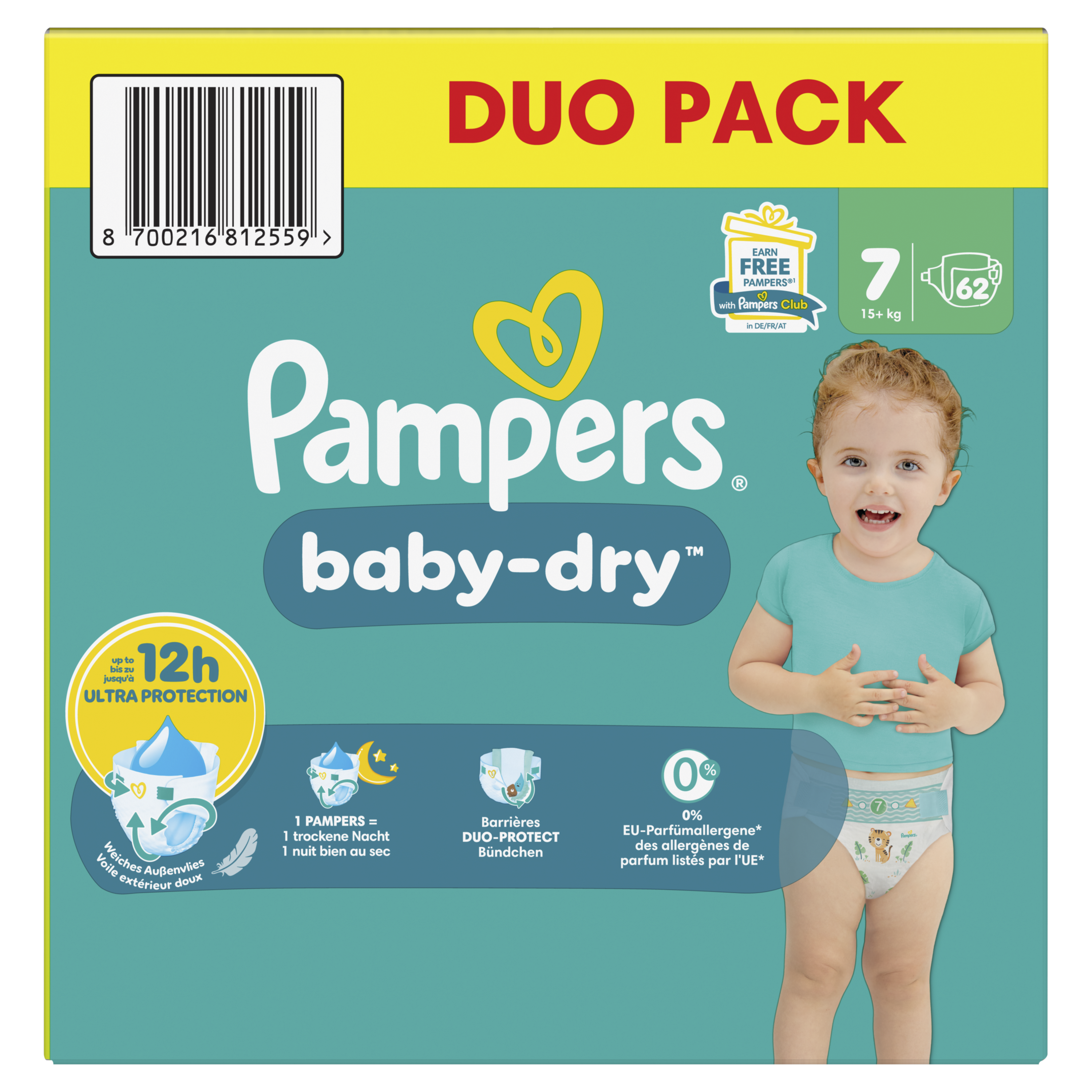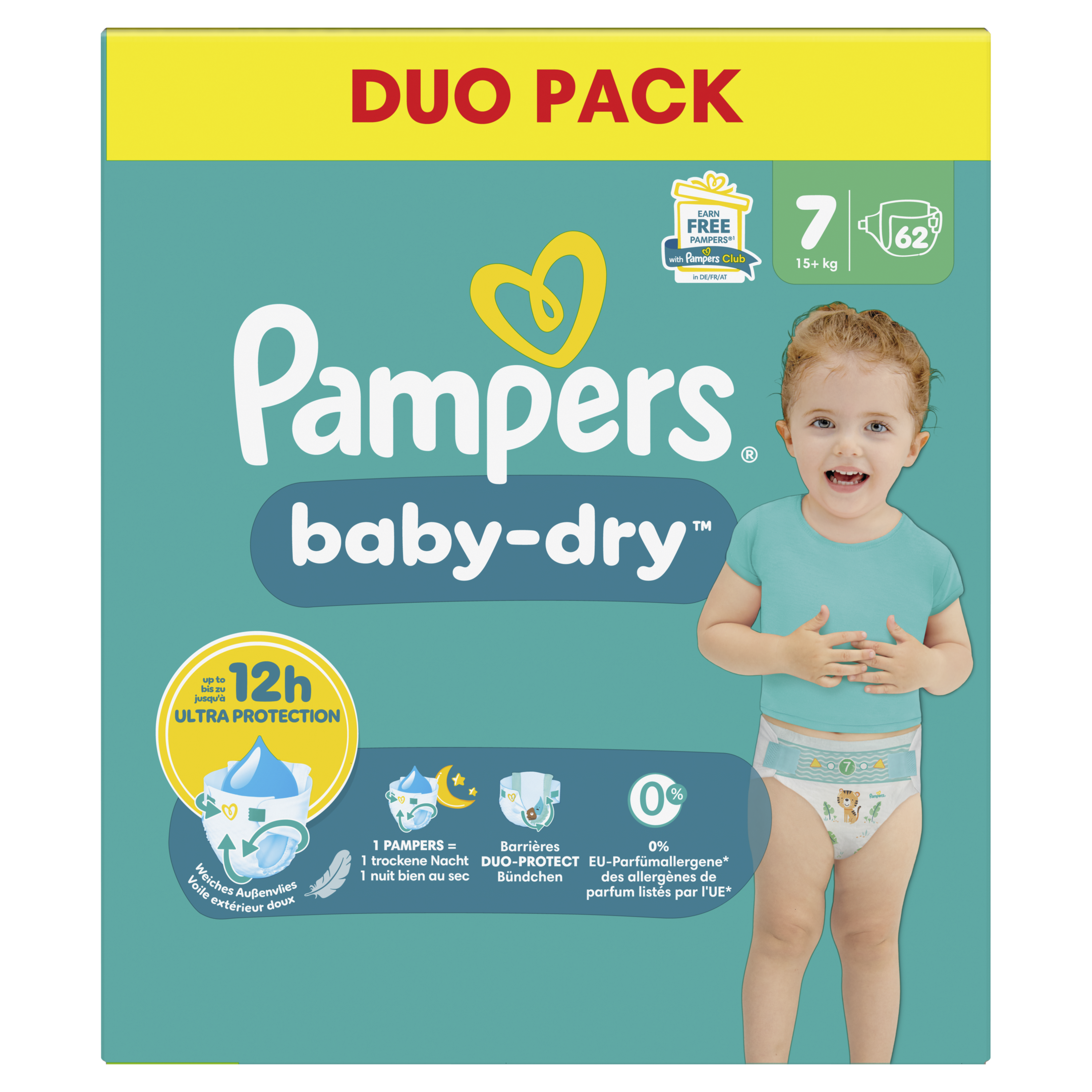 | Libellé | Pampers Baby-Dry Taille 7 62 Couches 15kg+ |