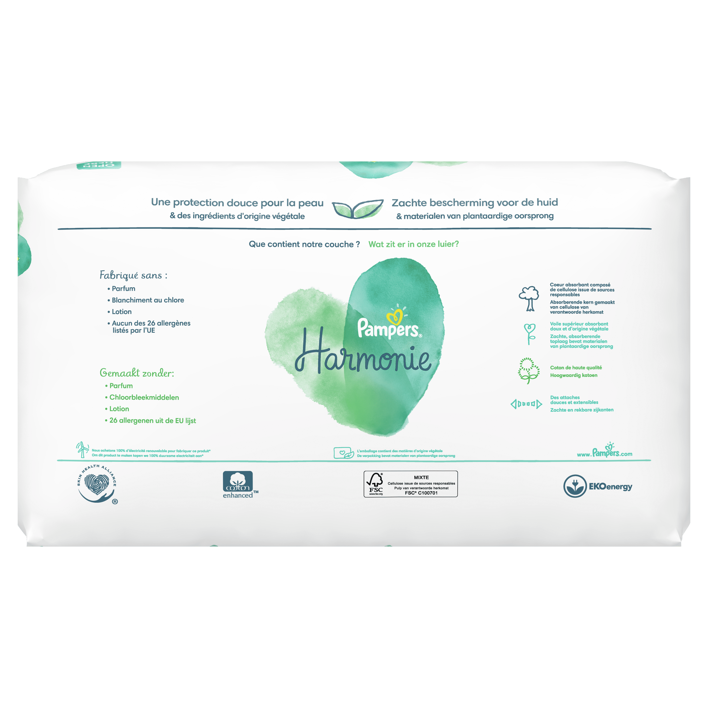 Protection douce pour la peau. Avec des ingrédients d’origine végétale. Les couches Pampers Harmonie sont conçues à base de coton de haute qualité, de fibres douces d’origine végétale et d’autres composants soigneusement sélectionnés. Elles sont hypoallergéniques*, testées dermatologiquement et douces sur la peau de votre bébé. Sans parfum, lotion, ni aucun des 26 allergènes listés par l’U.E., elles garantissent jusqu’à 12h bien au sec, pour que chaque parent soit rassuré de la qualité Pampers. Elles arborent d’adorables imprimés et sont dotées d’un indicateur d’urine Pampers très pratique : vous et votre bébé allez l’adorer. Les Pampers Harmonie sont conçues à partir de cellulose issue de sources gérées de façon responsable et certifiées par le label indépendant Standard 100 d’Oeko-Tex, l’une des certifications les plus exigeantes au monde. Si vous souhaitez en savoir plus sur la composition des produits Pampers, visitez pampers.fr *conçues pour minimiser le risque d’allergies.