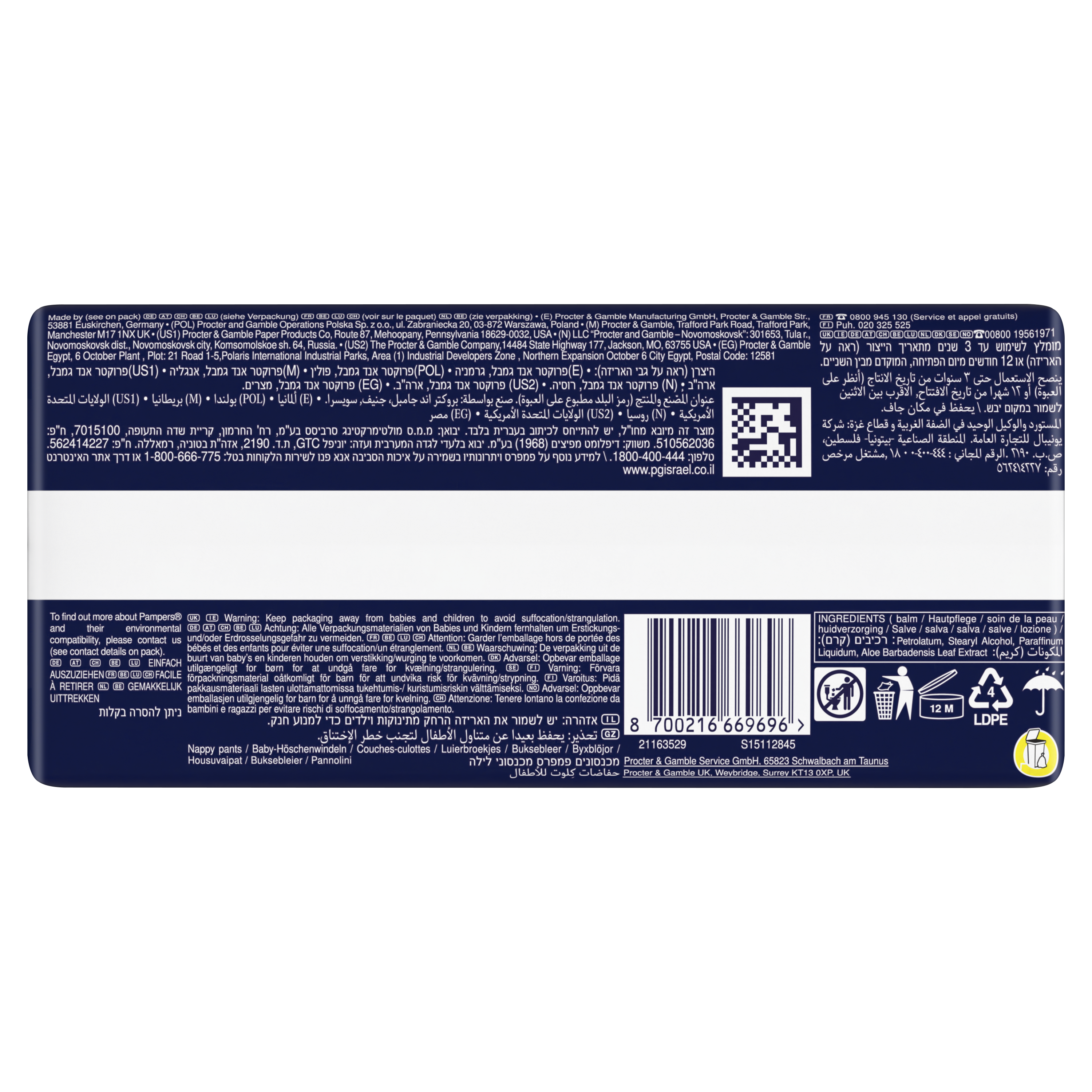Offrez à votre bébé la meilleure protection Pampers pour la nuit avec les couches-culottes Pampers Night Pants : grâce à leur cœur absorbant elles sont le produit Pampers le plus absorbant pour une nuit jusqu'à 100% sans fuites. Elles sont également dotées d'une ceinture 360° qui s'adapte aux mouvements de votre bébé dans la nuit et d'une poche Stop & Protect qui aide à éviter les fuites à l'arrière de la couche-culotte. Comme toutes nos couches-culottes, les Pampers Night Pants sont faciles à changer : faciles à enfiler en un seul geste, faciles à retirer en déchirant les côtés, et faciles à jeter en les enroulant grâce à la bande adhésive. Comme pour vous, la sécurité de votre bébé est notre priorité : Les couches-culottes Pampers Night Pants sont approuvées dermatologiquement et contiennent 0% d'allergènes de parfum listés par l'UE (comme réglementé par la réglementation cosmétique de l'UE N° 1223/2009). Elles sont testées et certifiées Standard 100 par OEKO-TEX. Vous souhaitez en savoir plus sur la composition de nos produits ? Visitez pampers.fr