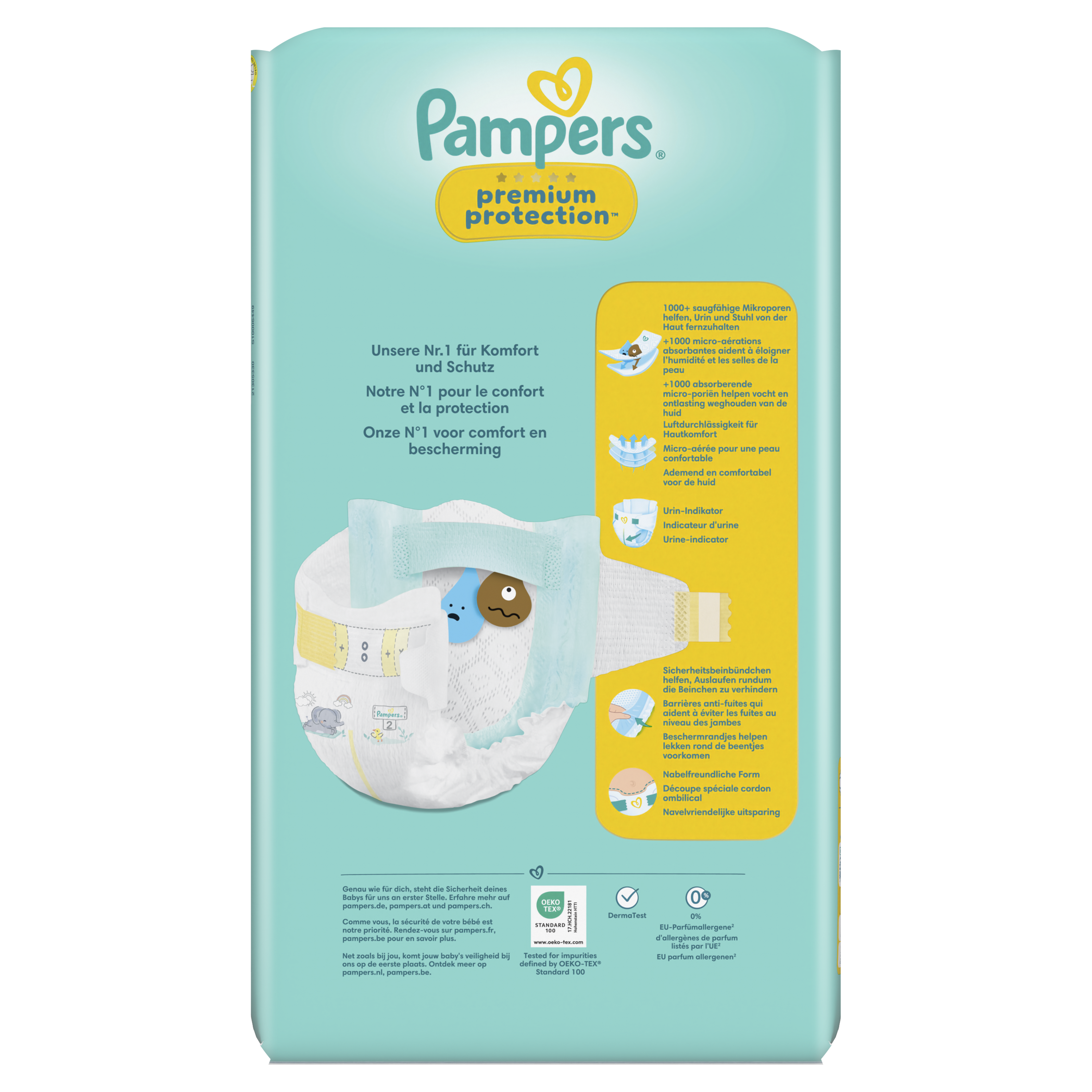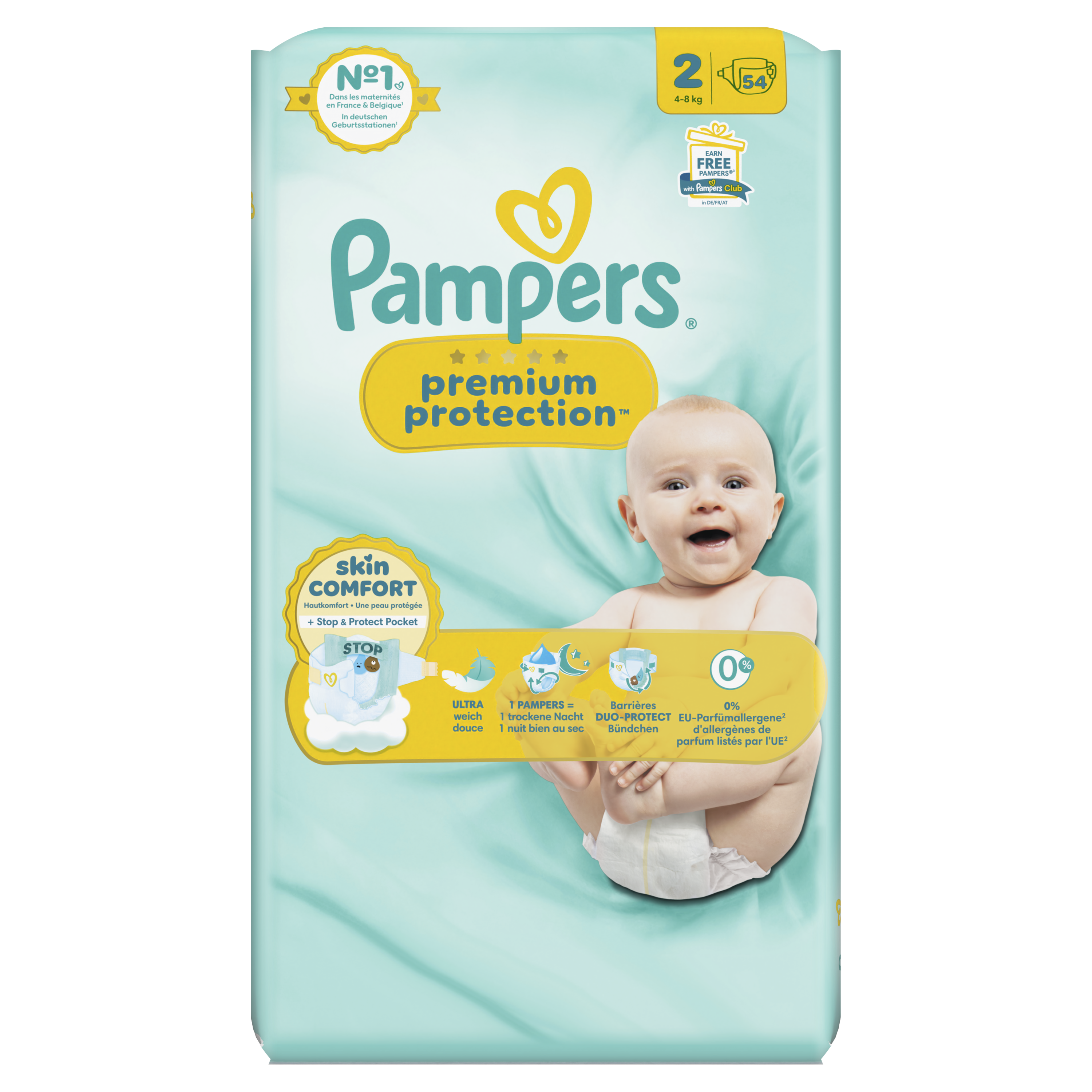 DOUBLE PROTECTION : pour la peau et contre les fuites. Les couches Pampers N°1 pour le confort et la protection des peaux sensibles - testées et approuvées par des bébés. Nous avons conçu la couche Pampers N°1 spécialement pour la peau délicate des nouveau-nés. C'est également notre couche N°1 contre les fuites. Les couches Pampers Premium Protection offrent notre meilleure protection, grâce à 1) une ABSORPTION INSTANTANÉE, avec plus de 1 000 micro-alvéoles absorbantes qui éloignent instantanément l'humidité et les selles molles de la peau et les capturent au cœur de la couche, pour protéger la peau et la garder bien au sec. 2) POCHE UNIQUE STOP & PROTECT pour capturer les fuites à l'arrière de la couche. 3) Des MATIÈRES ULTRA-DOUCES pour envelopper votre bébé dans un nuage de confort et de protection. Et 4) notre technologie unique Comfort Fit avec un système d'attaches superposables et une découpe spéciale cordon ombilical. Les couches Pampers Premium Protection, le choix N°1 des maternités en France*, sont 100% sûres pour la peau de votre bébé. Elles sont testées dermatologiquement et ne contiennent aucun des allergènes de parfum listés par l'UE (comme réglementé par la réglementation cosmétique de l'UE N°1223/2009). Pas étonnant que les nouveau-nés approuvent.