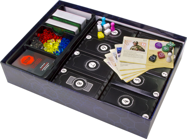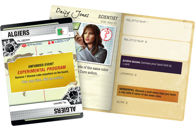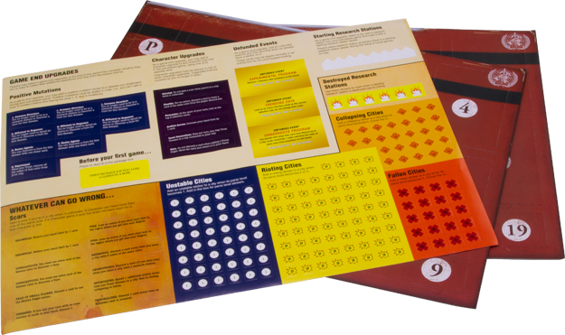 | La boîte contient | 1 plateau 5 cartes Personnage 4 pions 6 stations de recherche 4 marqueurs Remède 3 marqueurs 96 cubes Maladie 48 cartes Propagation 61 cartes Joueur 4 aides de jeu 1 règle 60 cartes Legacy, 5 dossiers... Et plusieurs surprises |