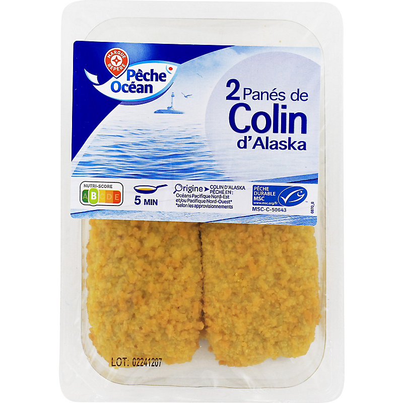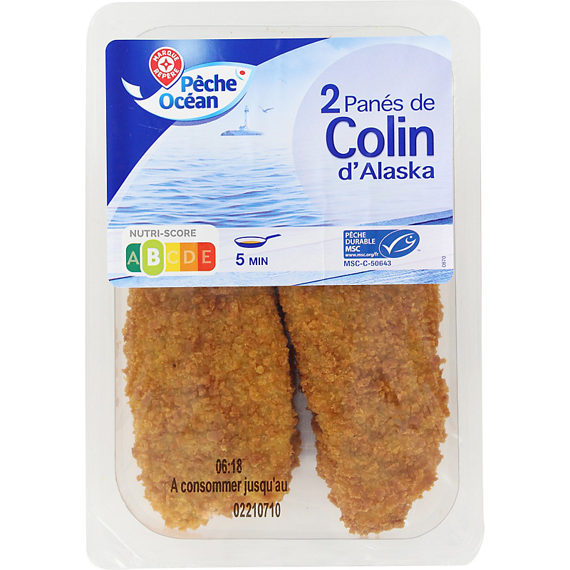 Ingrédients : Chair de colin d'Alaska MSC 59 % ; chapelure de blé (farine de blé, levure, sel, épices) ; eau ; huile de tournesol ; farine de blé ; crème légère (crème, stabilisant : carraghénanes) ; amidon de manioc ; fibre de blé ; épaississant : E461 ; sel ; oignon en poudre ; poivre.