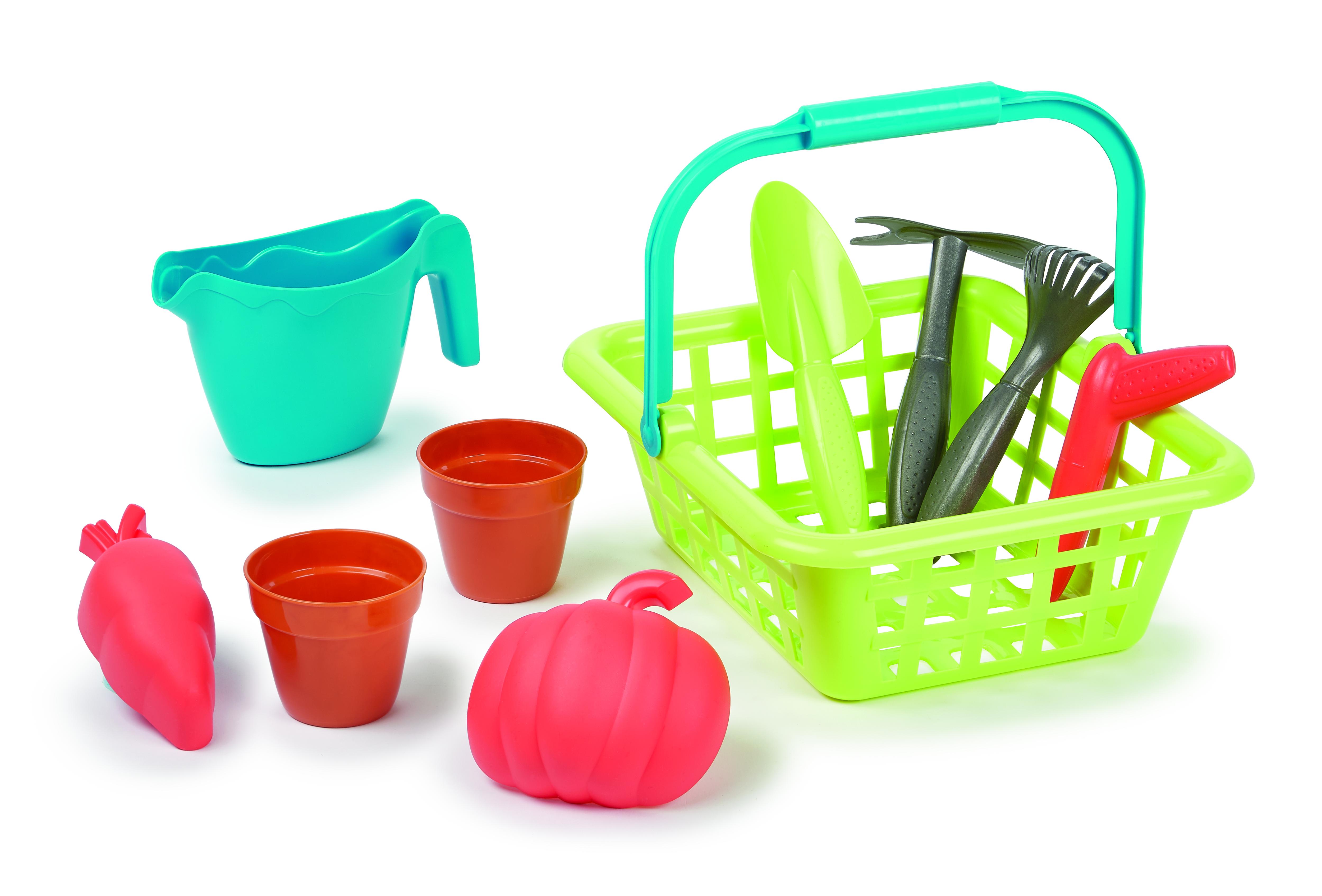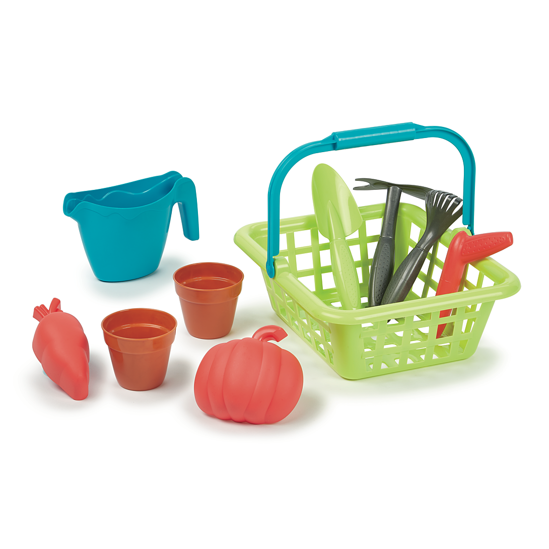 Ce panier de jardinier contient 2 pots de fleurs, 2 moules à sable en forme de légumes du jardin, une pelle, une pioche, un râteau, un plantoir et un arrosoir. En tout 9 accessoires. Origine France Garantie. Conseillé dès 18 mois.