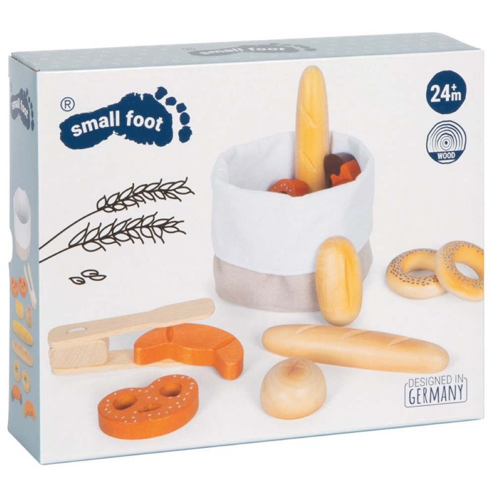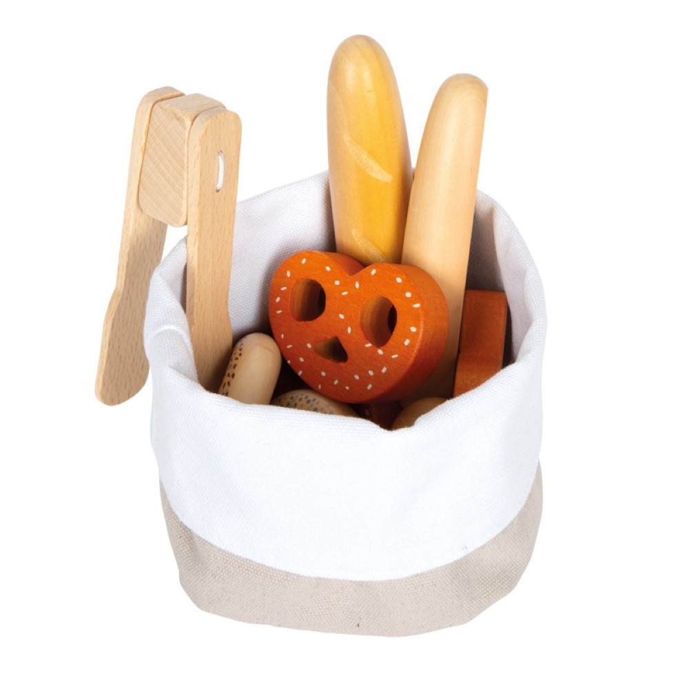 Parfait pour préparer le petit déjeuner ! Deux croissants, deux beignets, un pain de blé et de seigle, deux baguettes et deux bretzels, le tout en bois.