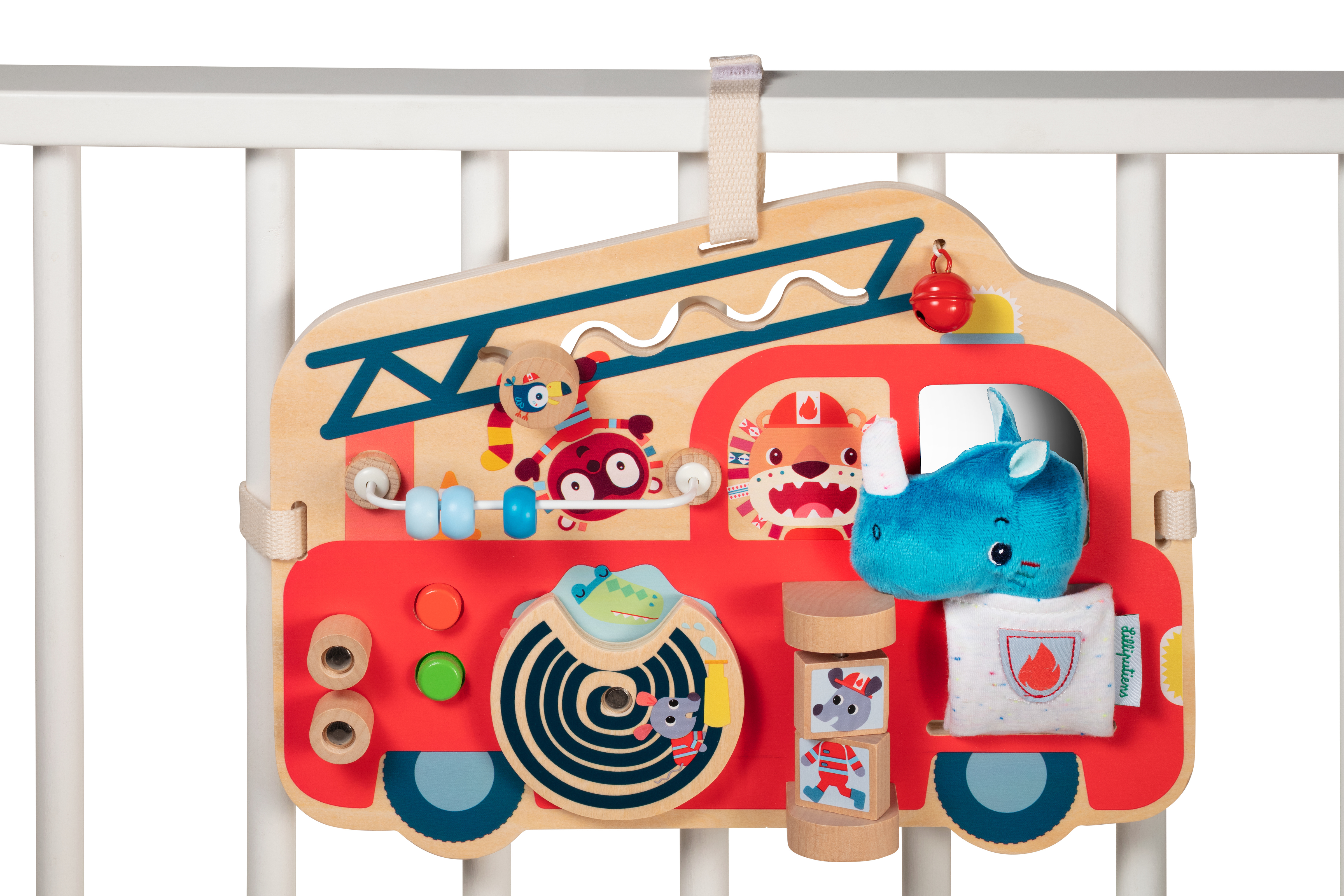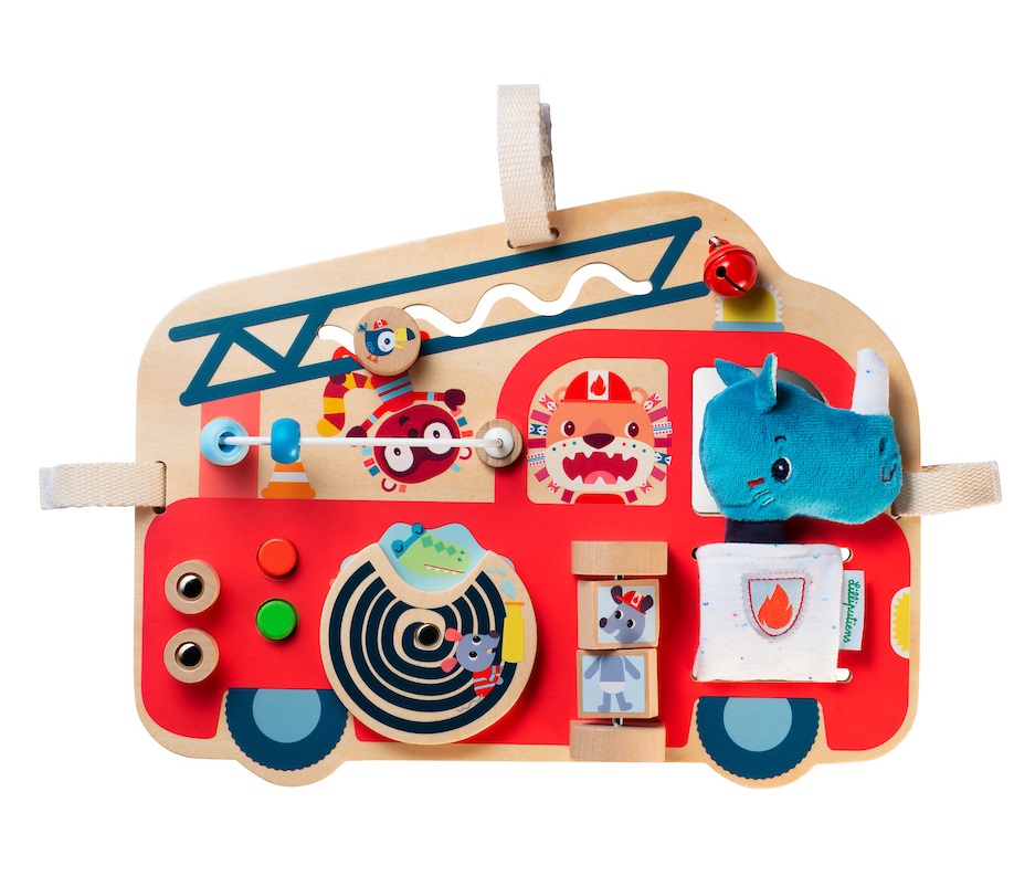 Ce panneau en bois représentant un camion de pompiers est riche en activités et matières pour stimuler les petits dans leurs découvertes. Se fixe facilement au parc grâce aux rubans velcro.