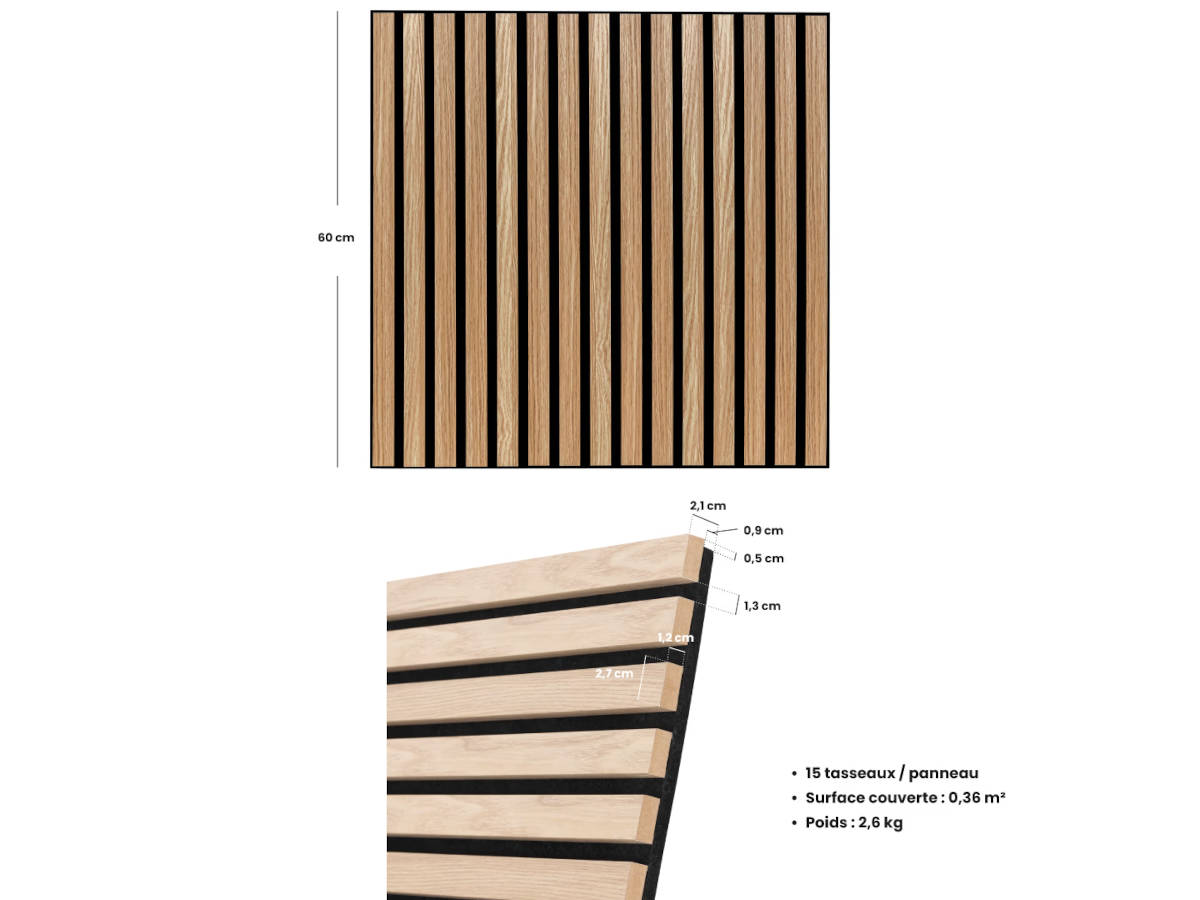 Apportez une touche naturelle et élégante à votre intérieur avec le panneau décoratif tasseaux bois d'Atmosphera. Grâce à son effet chêne clair et son design moderne, il s'adapte à tous les styles d'intérieur, tout en apportant une note chaleureuse et créative à votre pièce.Ce panneau de 60x60 cm couvre 0,36 m' et se distingue par ses tasseaux en MDF plaqués avec un papier texturé effet bois. Les 15 tasseaux répartis sur le panneau créent un visuel raffiné et tendance, tandis que la feutrine noire intégrée permet une meilleure isolation acoustique (coefficient d'absorption acoustique de 0,8/1 aw), améliorant l'ambiance sonore de votre pièce.Le montage est un jeu d'enfant : fixez-le verticalement ou horizontalement selon vos préférences. Le panneau est découpable pour s'adapter à toutes les configurations de mur. Visserie ou colle non incluses. Vous pourrez le monter seul, et sa simplicité de pose permet de rénover en un clin d'œil sans grands travaux.Pour conserver l'aspect naturel et élégant de votre panneau, il suffit de l'essuyer régulièrement avec un chiffon doux. Pour la feutrine, passez un aspirateur pour éliminer la poussière sans abîmer le tissu. Évitez l'exposition à l'humidité pour garantir la longévité du produit.H. 60 cm x L. 60 cm x P. 2,1 cm Surface couverte : 0,36 m' Poids : 2,6 kg Couleur : Beige Dimensions (L x l x H) : 60 x 2,1 x 60 cm Marque : ATMOSPHERA Matière(s) : MDF Univers : Moderne