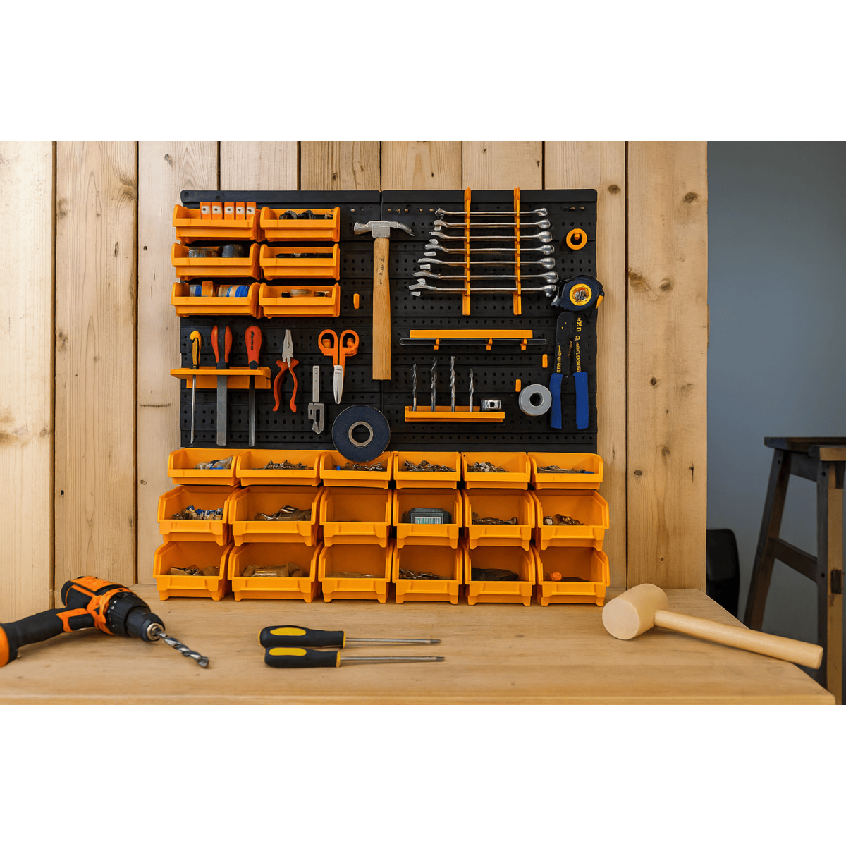 Il comprend 4 panneaux muraux robustes, 27 bacs de rangement de tailles variées, 2 porte-outils pratiques, 2 porte-clés et 38 crochets assortis, permettant une configuration personnalisée et modulaire adaptée à vos besoins.