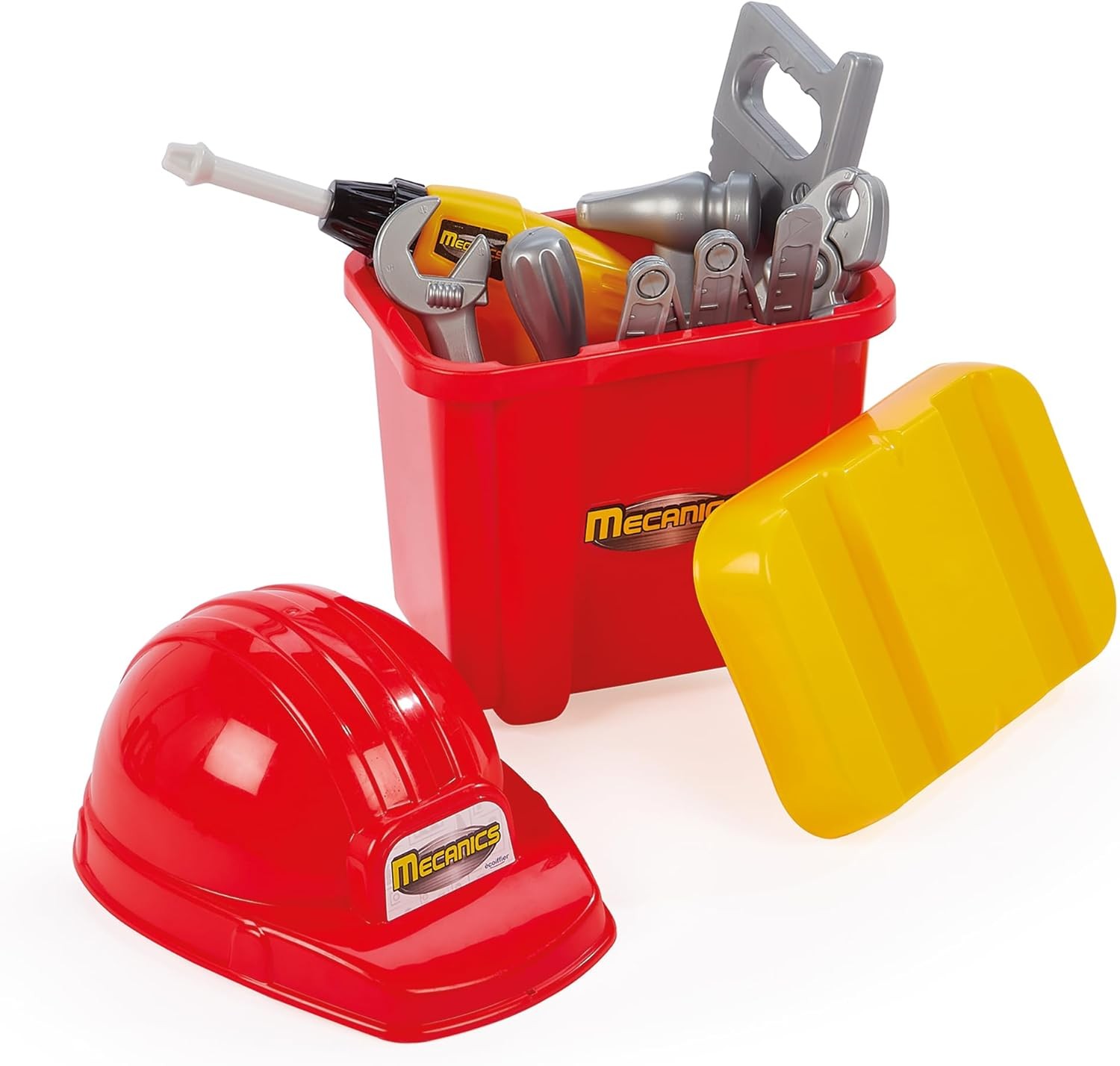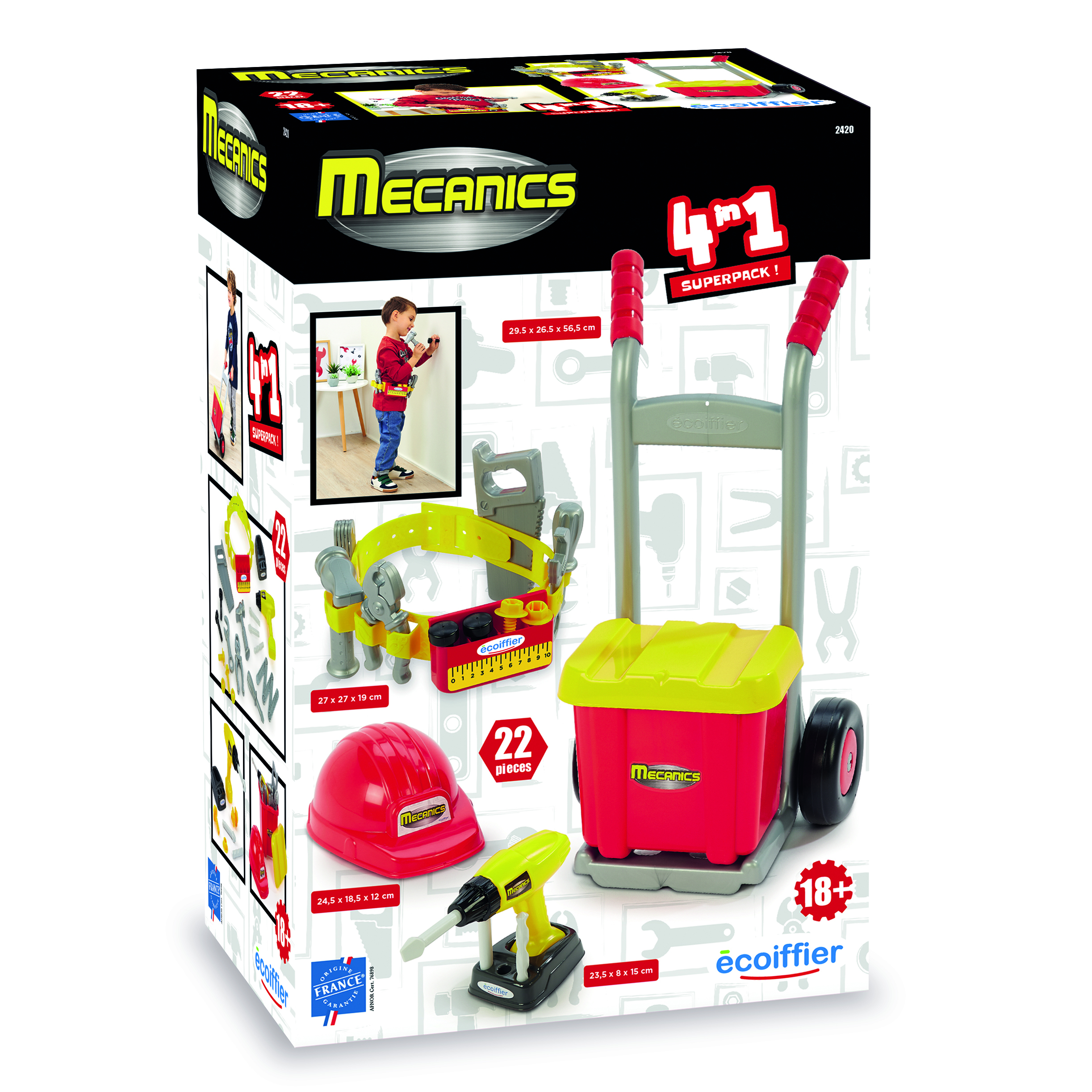 Ensemble complet du petit bricoleur composé d’un diable et de sa caisse à outils, d’une perceuse, d’un casque et d’une ceinture avec ses outils inclus pour élaborer de grands travaux à la maison. Dès 18 mois. Origine France Garantie.