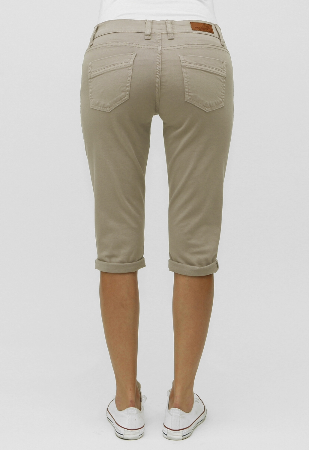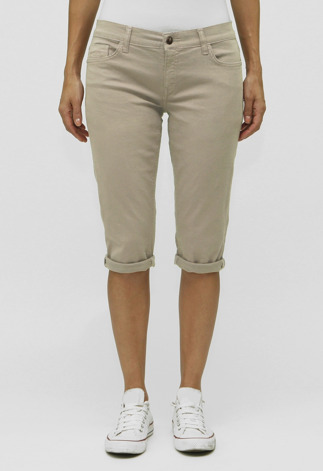 Pantacourt, taille normale, coupe slim, bas avec revers, gabardine stretch, 74% polyester 24% élasthanne 2%.Le mannequin porte une taille 38.