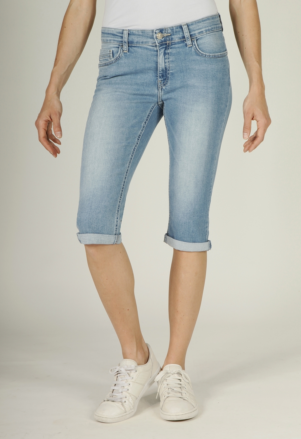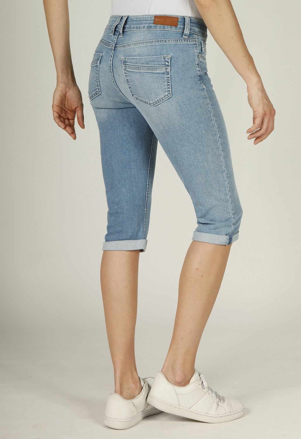 Pantacourt taille normale, coupe slim, bas à revers, denim stretch stone washed brossé blanchi. Longueur d'entrejambe : 41,5 cm pour une taille 38. Le mannequin porte une taille 38.