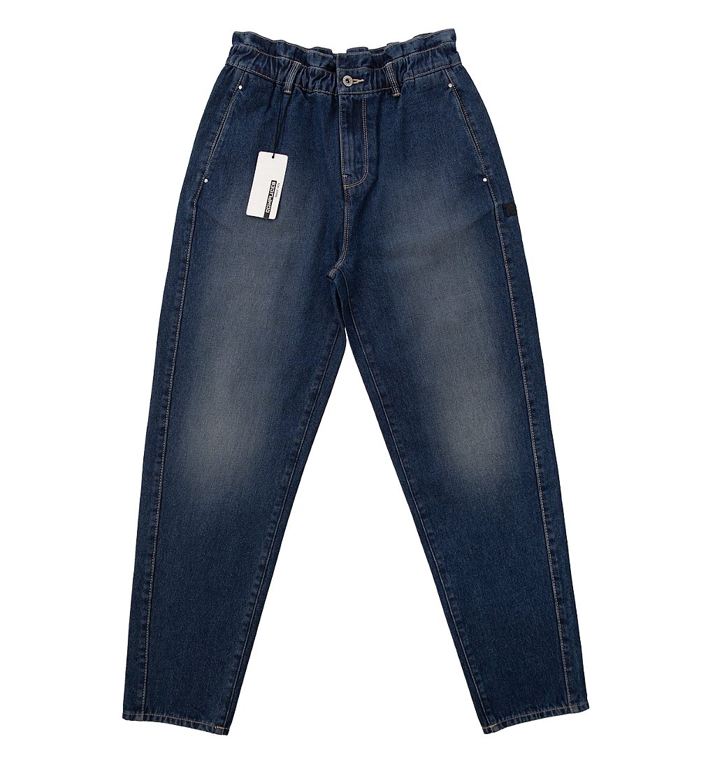 jean à taille haute elastiquée avec plis-rigide - poches devant chino et poches arriére plaquées-fermeture zip-1 étiquette tissée-rivets -badge ton sur ton -découpe sur les deux cotés-coupe ample carotte