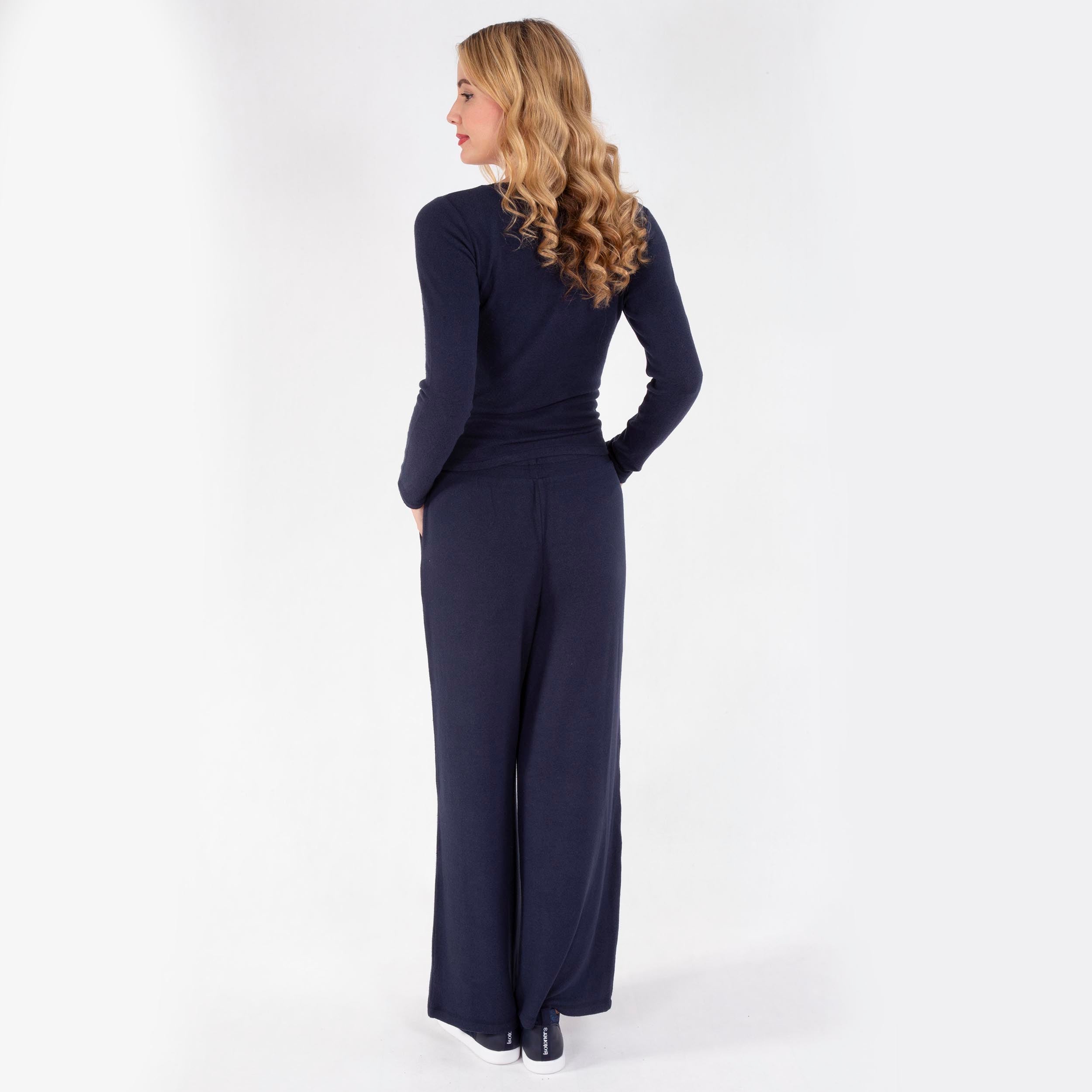 Ce pantalon large pour femme marine est le must have de la saison grâce à son toucher incroyablement doux puisque que ce pantalon est composé majoritairement de viscose ECOVERO™. Ce pantalon large femme allie grand confort et élégance grâce à ses poches, sa taille haute élastiquée et son cordon satiné réglable à la taille. La mannequin mesure 177 cm et porte une taille 34/36.