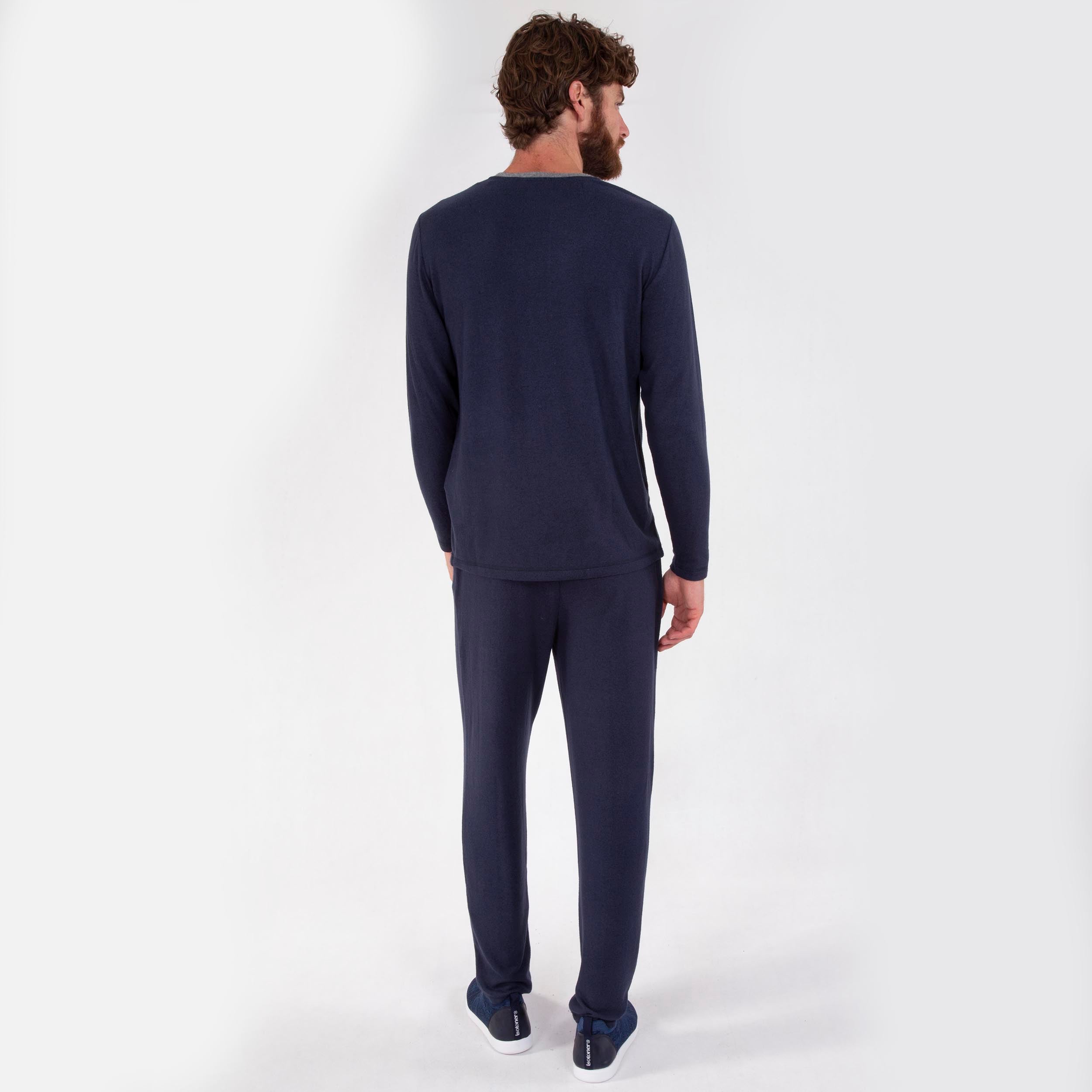 Ce pantalon pour homme marine chiné saura vous accompagner pour vos journées cocooning. Grâce à sa taille élastiquée et à sa matière composée majoritairement de viscose ECOVERO™, ce pantalon pour homme vous offre un confort inégalé. Le mannequin mesure 188 cm et porte une taille M.