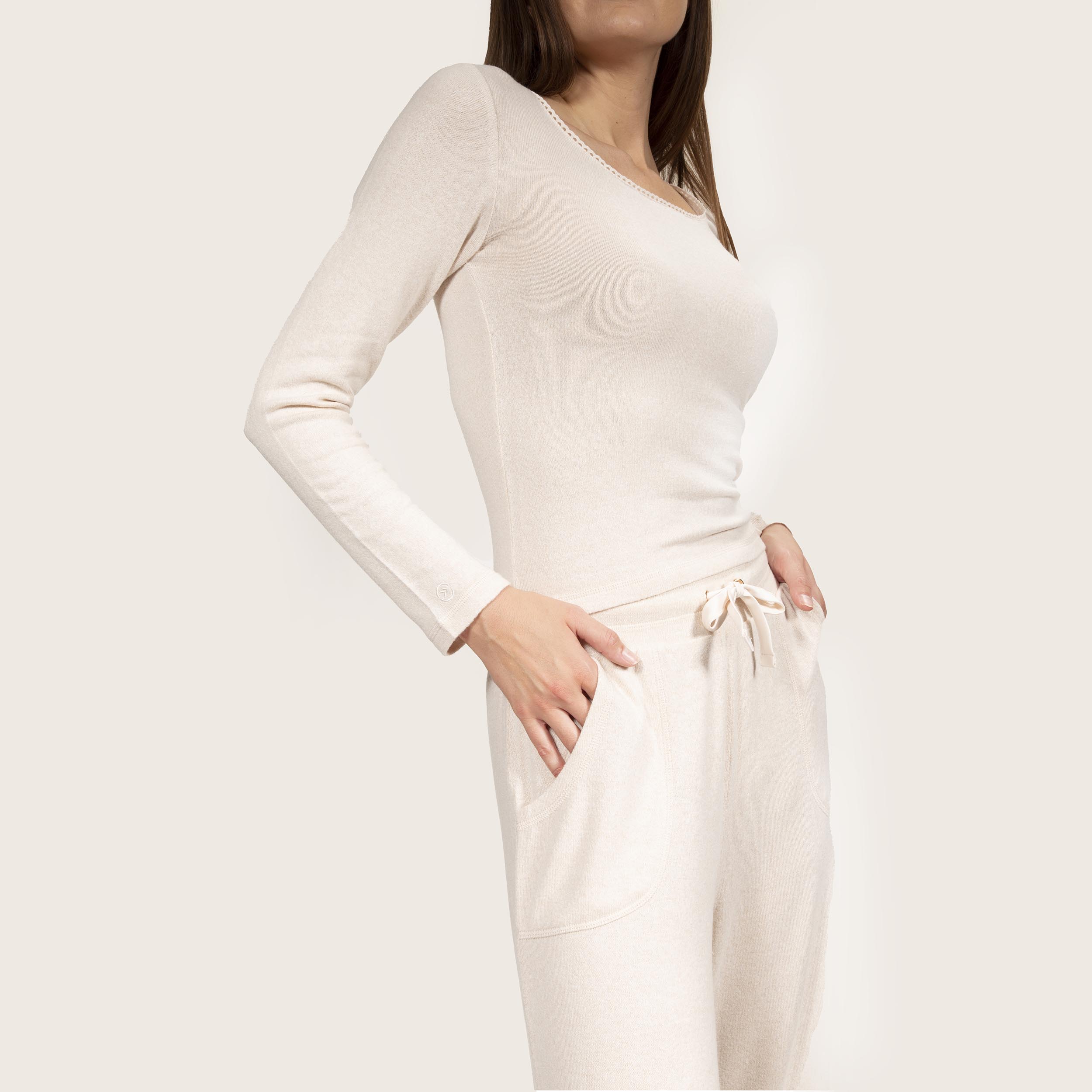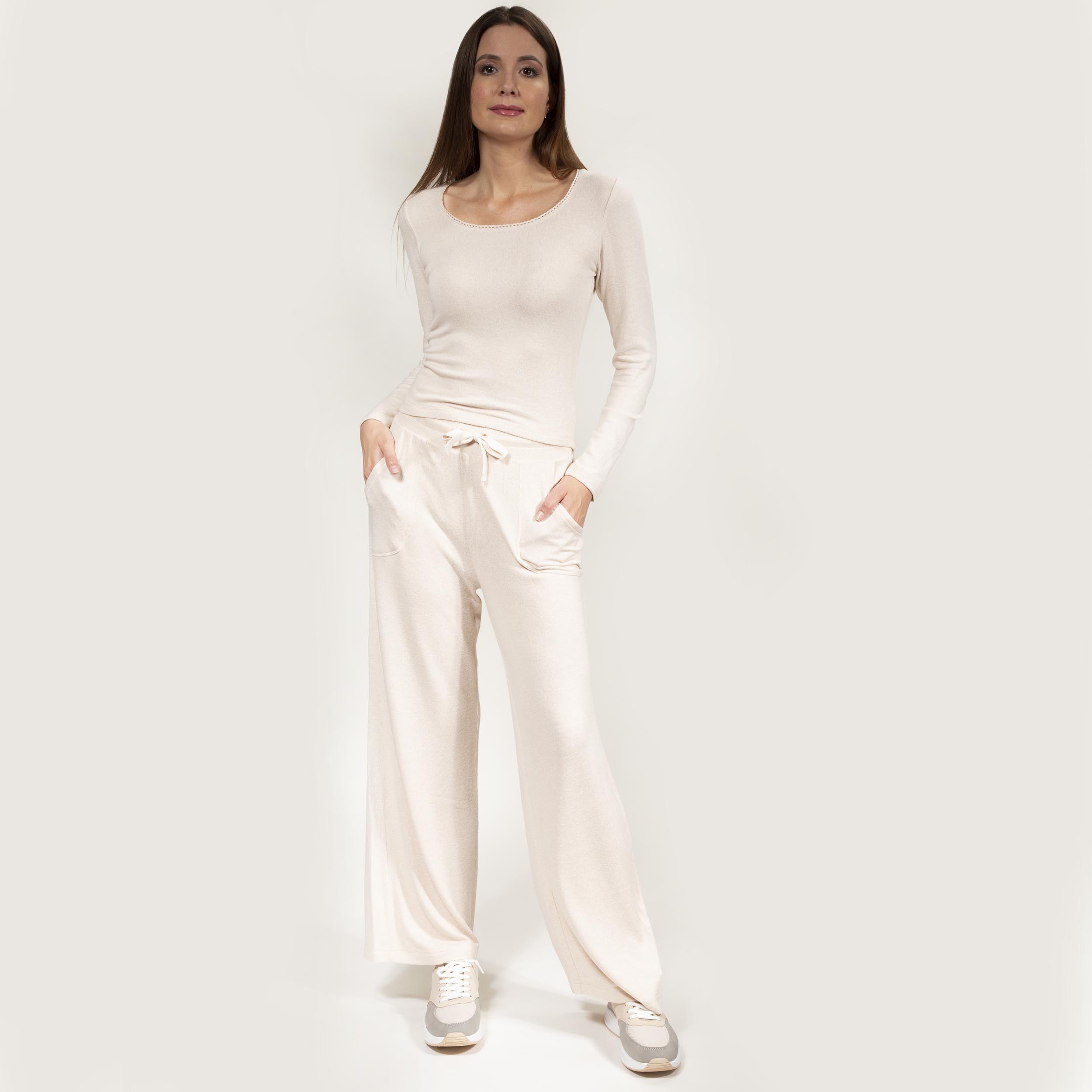 La nouvelle ligne homewear Isotoner ultra douce est composée majoritairement de viscose ECOVERO™. Ce pantalon large, beige, au toucher incroyablement doux allie grand confort et élégance grâce à ses poches, sa taille haute élastiquée et son cordon satiné réglable à la taille.La mannequin mesure 177 cm et porte une taille 34/36.