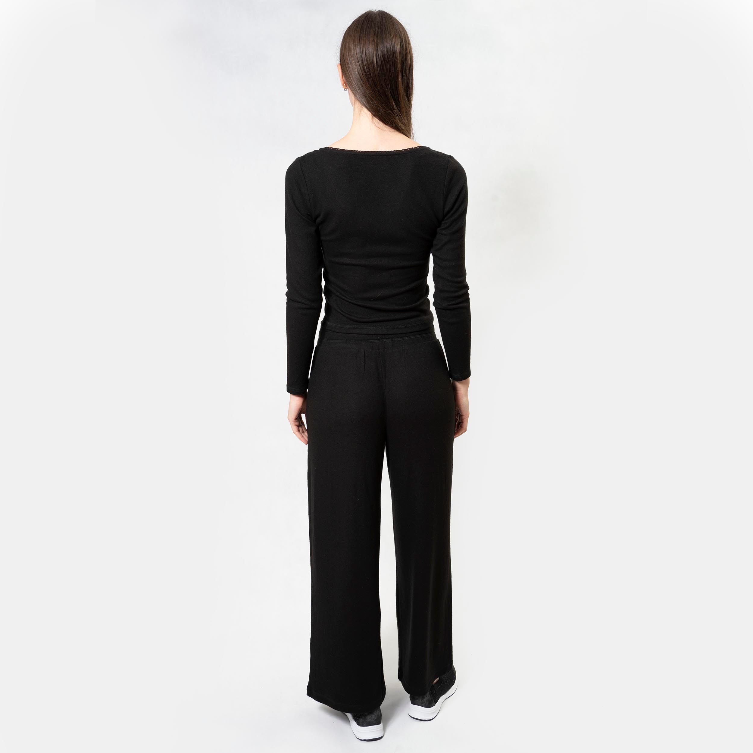 Cet hiver optez pour ce pantalon large femme, de couleur noire composé majoritairement de viscose ECOVERO™. Ce pantalon large, au toucher incroyablement doux, allie confort et élégance. Il est doté de deux poches sur les côtés, d'une taille haute élastiquée et d'un cordon satiné réglable à la taille. La mannequin mesure 177 cm et porte une taille 34/36.