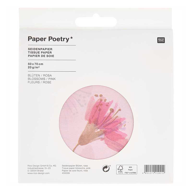 Réalisez vos travaux de papeterie et de carterie avec ce beau papier de soie aux motifs fleurs de cerisier. Le papier de soie est connu pour son utilisation comme emballage ou d'accessoire de création pour enfant. Il peut aussi être utilisé pour des réalisations de scrapbooking et de carterie. Sa touche transparente et chic mais également douce au toucher apportera de l'élégance et de la légèreté à vos travaux. Vous pouvez également retrouver des accessoires de papeterie dans le même motif comme : un bullet journal, un bloc note ou encore un masking tape. Ce produit, de la marque Rico Design, contient 5 feuilles de 50 x 70 cm. Les motifs sont des fleurs de cerisier.
