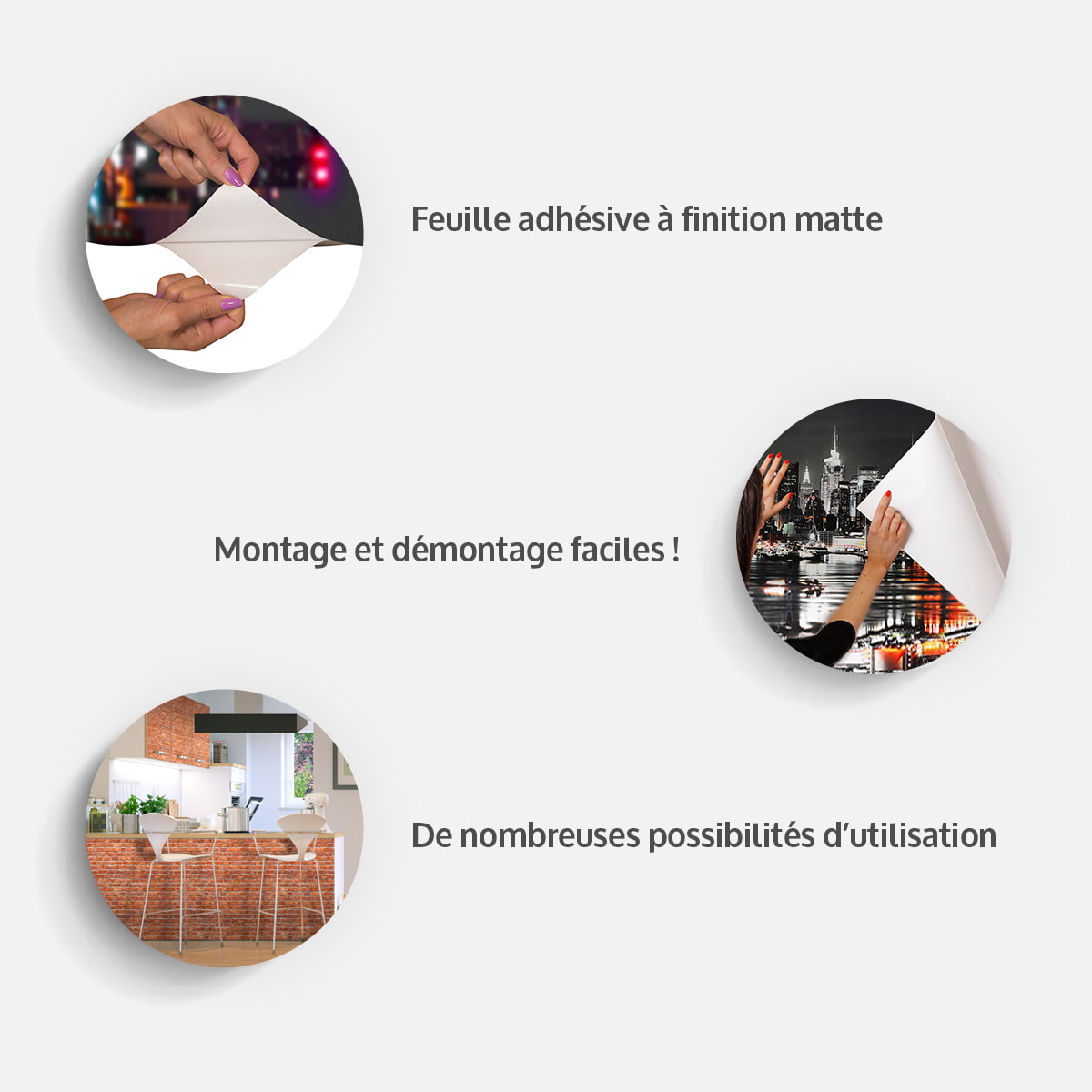 Nos papiers peints adhésifs sont une proposition parfaite pour tous ceux qui souhaitent transformer leurs intérieurs sans grand effort et obtenir l’effet de métamorphose spectaculaire de l’intérieur! Rapidement, sans faire appel à des spécialistes et sans accessoires supplémentaires, vous pouvez rénover tout seul votre appartement ou bureau. Le papier peint adhésif bien choisi, permet de créer une impression d’espace, et les nombreuses dimensions et motifs disponibles répondront aux besoins même des clients les plus exigeantsLes papiers peints adhésifs sont universels, ils peuvent être utilisés avec succès sur toute la surface du mur ou sur une partie seulement, p.ex. la cloison, le bar, l’îlot central et même sur… les meubles, car les papiers peints adhésifs peuvent également remplir la fonction de placage pour meuble. Grâce à toutes ces possibilités, vous pouvez profiter de votre motif préféré dans tout l’appartement et sur différentes surfaces ! Impression de la plus haute qualité ! Le papier peint adhésif "Papier peint adhésif - Energy of Passion" est imprimé en technologie HD à une résolution jusqu’à 600 dpi, ce qui assure des couleurs vives et des détails parfaitement rendus, indépendamment des dimensions du papier peint adhésif. L’impression se fait sur une feuille adhésive à finition matte et au grammage de 50 g/m². La matière tout comme l’impression sont résistantes à l’eau et aux rayons UV, ce qui empêche les couleurs de s’estomper, même après une longue exposition au soleil. Des matières sûres Le papier peint adhésif est fabriqué en des matières sûres et inodores, ce qui convient parfaitement à toute pièce, la chambre à coucher et la chambre d’enfant aussi. Montage facile Avant le montage, assurez-vous que la surface (le mur, les meubles) est bien préparée et dégraissée, que les aspérités, poussières, peintures soient éliminées, etc. Collez le papier peint adhésif par des bandes, en décollant progressivement à partir du haut la couche de film protecteur et en éliminant les bulles d’air qui peuvent se former. Rapidement, facilement, sans difficultés supplémentaires. Le démontage est aussi facile ! Téléchargez le mode d’emploi Emballage sûr Le papier peint adhésif est livré en rouleau d’une largeur de 49 cm, à découper individuellement. À chaque rouleau est joint un mode d’emploi. Le rouleau est protégé par un film de protection et emballé dans un carton. Papiers peints adhésifs – décoration universelle Notre offre comporte de nombreuses propositions qui satisferont les goûts aussi bien des amateurs d’un style moderne qu'aux traditionalistes. Les papiers peints adhésifs peuvent décorer chaque pièce, non seulement le salon ou la chambre à coucher, mais également la cuisine et la salle de bains. Veillez cependant à ne pas les installer dans des endroits à forte humidité ou au contact direct avec l’eau. Dimensions des panneaux:98x70: 49x70 49x70343x245: 49x245 49x245 49x245 49x245 49x245 49x245 49x245392x280: 49x280 49x280 49x280 49x280 49x280 49x280 49x280 49x280441x315: 49x315 49x315 49x315 49x315 49x315 49x315 49x315 49x315 49x315294x210: 49x210 49x210 49x210 49x210 49x210 49x210245x175: 49x175 49x175 49x175 49x175 49x175147x105: 49x105 49x105 49x105196x140: 49x140 49x140 49x140 49x140