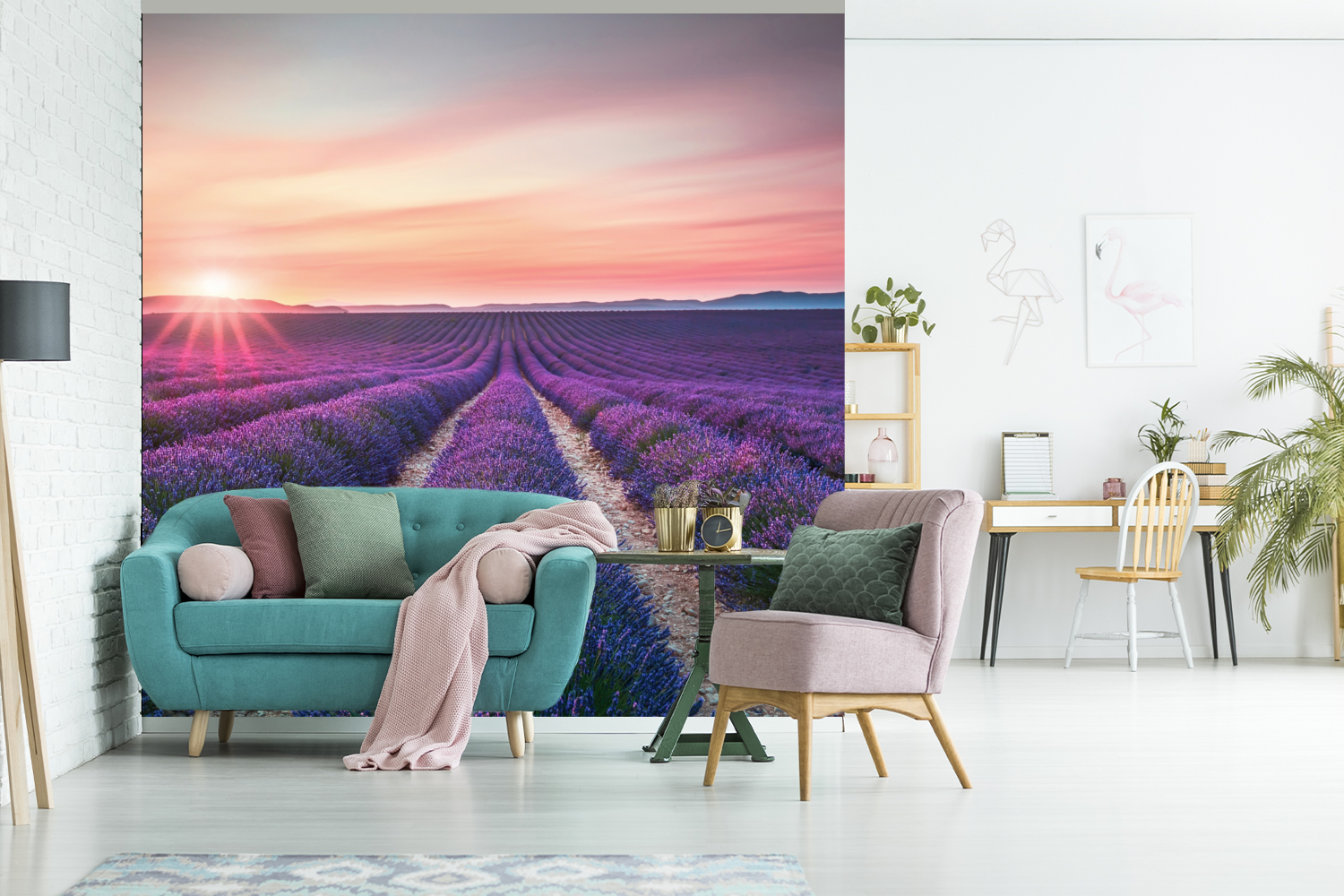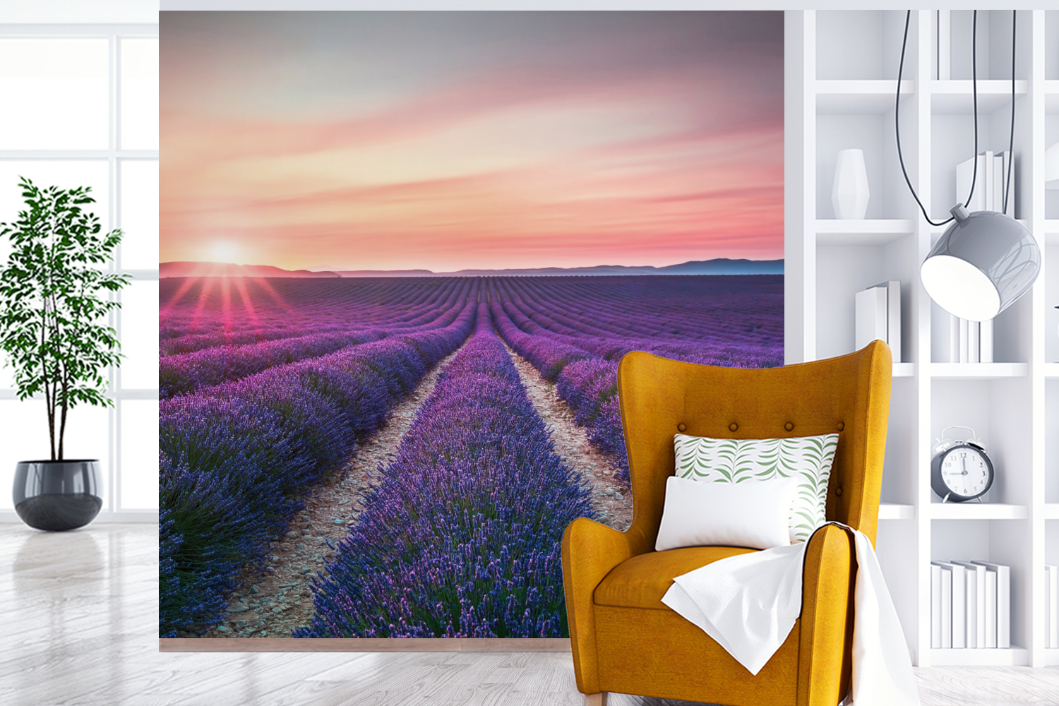 Des rangées infinies de fleurs de lavande au lever du soleil.
