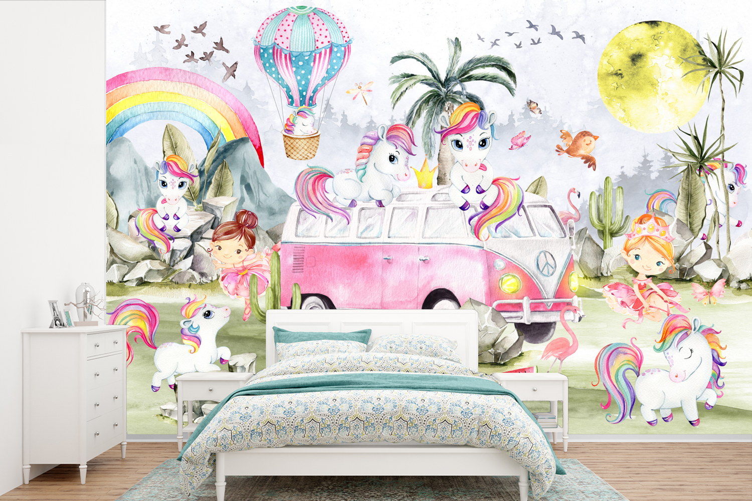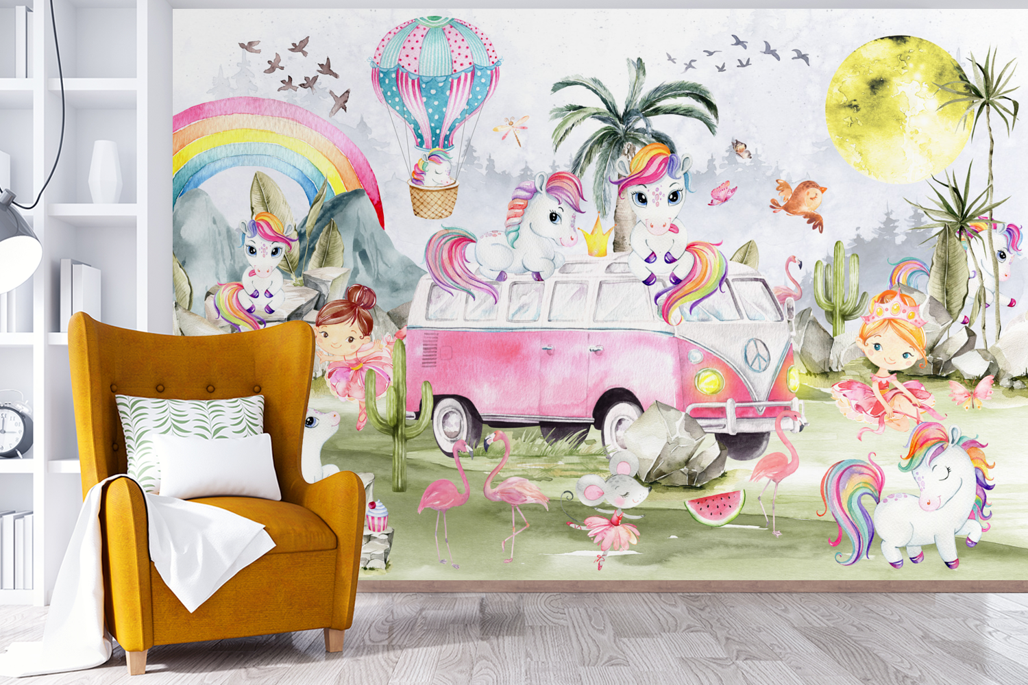 Passer le carrousel d'imagesUn groupe de licornes près d'un van Volkswagen vintage.