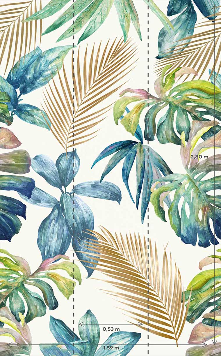 DIMENSIONS: Le rouleau fait 0,53 x 8,40 mètres. Il est composé de 3 lés qui mesure chacune 0,53 x 2,80 mètres. La dimension totale du motif fait 1,59 x 2,80 mètre de hauteur. Si votre mur fait longueur 3m x hauteur 2,5m : il vous faut 2 rouleaux. Si votre mur fait 4m x hauteur 2,8m : il vous faut 3 rouleaux. CARACTÉRISTIQUE: Papier intissé de qualité, nos papiers peints ne se déforment pas et des bulles d'air n'y apparaissent pas. FACILE À POSER: Rapide et simple! Il suffit de poser la colle directement sur le mur, d'appliquer les lés de papier peint l'une à côté de l'autre en l'appuyant contre le mur et c'est fini. Arrachage facile pour changer de déco. Instruction de montage incluse.| Libellé | Papier peint palme d'or et feuilles exotiques |