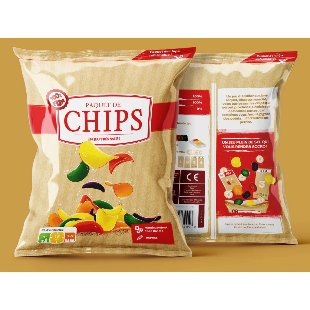 | La boîte contient | 36 cartes objectifs, 4 cartes tirage, 25 chips, 16 jetons roi de la chips, 1 paquet de chips, 1 aide de jeu, 1 livret de règles |