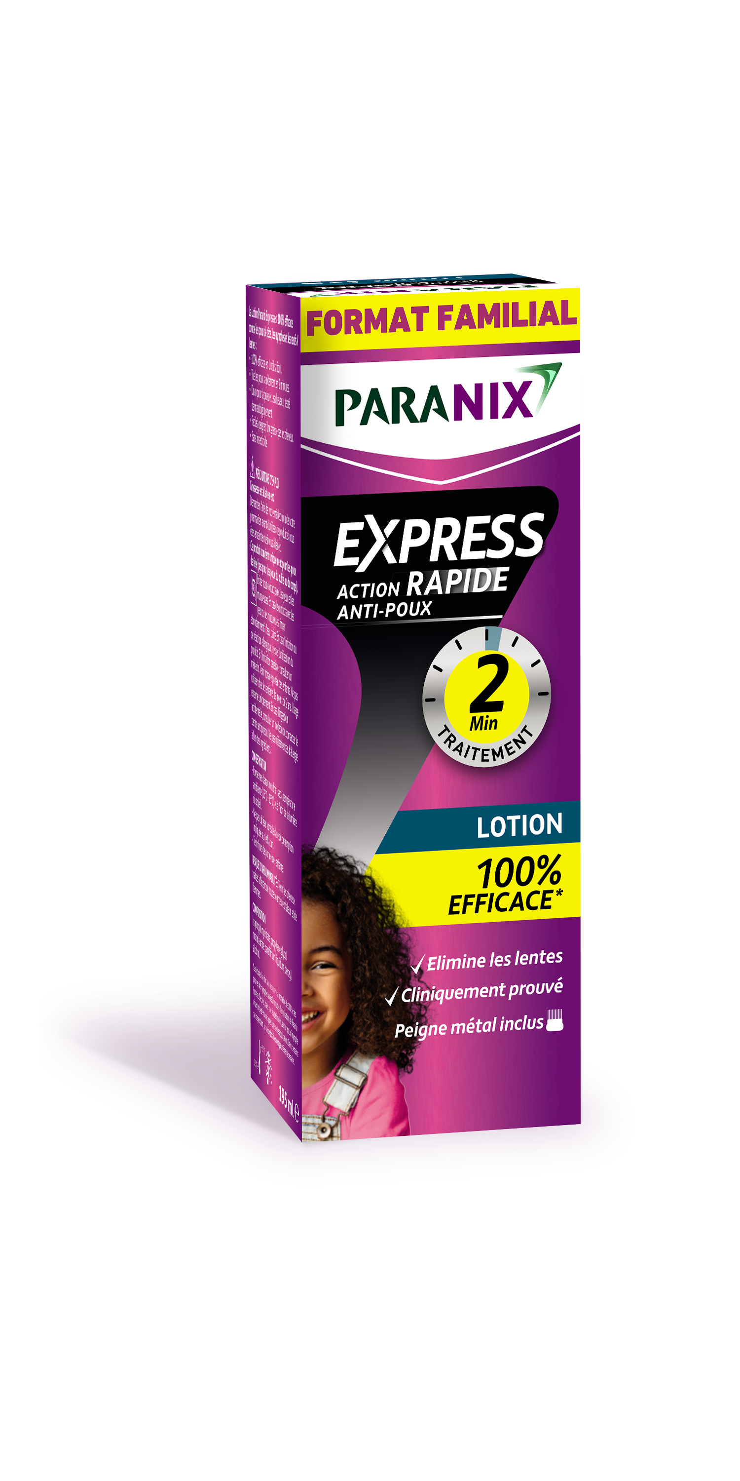 Paranix Express Lotion est 100% efficace contre les poux de tête, les nymphes & les œufs / lentes : • 100% efficace en 1 utilisation*. • Tue les poux rapidement en 2 minutes. • Doux pour la peau et les cheveux, testé dermatologiquement. • Facile à peigner, il ne graisse pas les cheveux. • Sans insecticide. * Les études in-vitro ont démontré la mortalité de 100 % des poux et des nymphes après 2 minutes d'application de Paranix Express. De plus, dans une étude in-vivo, aucun pou ni nymphe vivant n'a été trouvé après une seule application. Dans certains cas cependant, un second traitement peut être nécessaire.