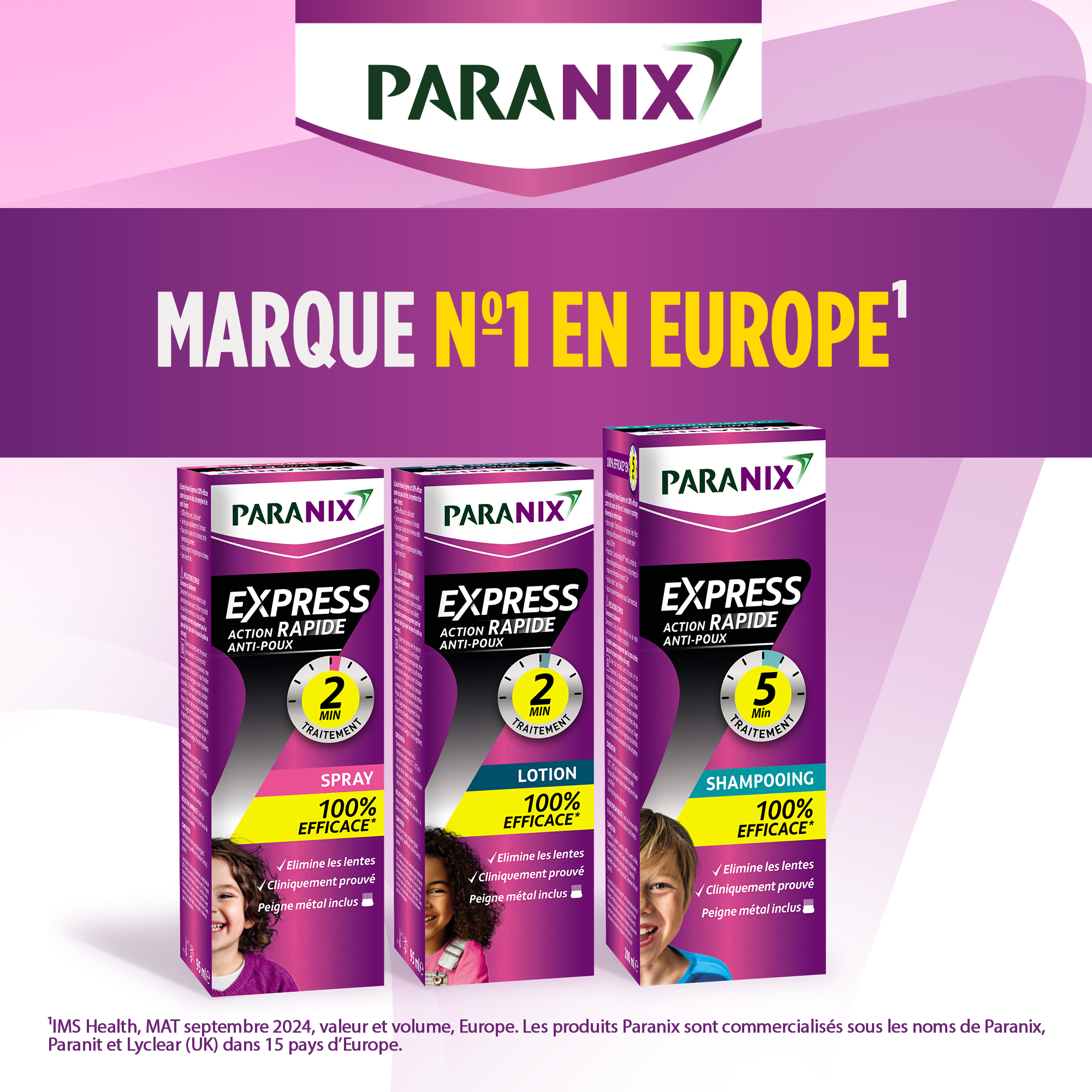 Le Shampooing Paranix Express est 100% efficace contre les poux de tête en 5 minutes et protège d'éventuelles réinfestations. • Action rapide : Traite les poux de tête en 5 min. Pour traiter plus efficacement les lentes, laisser poser jusqu'à 10 min. • Protection : La technologie LPF® rend la surface du cheveu désagréable pour les poux, ce qui protège du risque de réinfestation pendant 72h*. • Facile à rincer : Sans silicone. • Aucun risque de résistance des poux : Sans insecticide. *La protection de la technologie LPF® et l'efficacité pédiculicide ont été démontrées par des études ex vivo. Le Shampooing Paranix Express tue 100% des poux de tête et près de 100% des lentes. Utiliser une dose suffisante de produit et peigner soigneusement pour retirer toutes les lentes. En cas de réinfestation ou d'infestation importante, le traitement doit être répété.