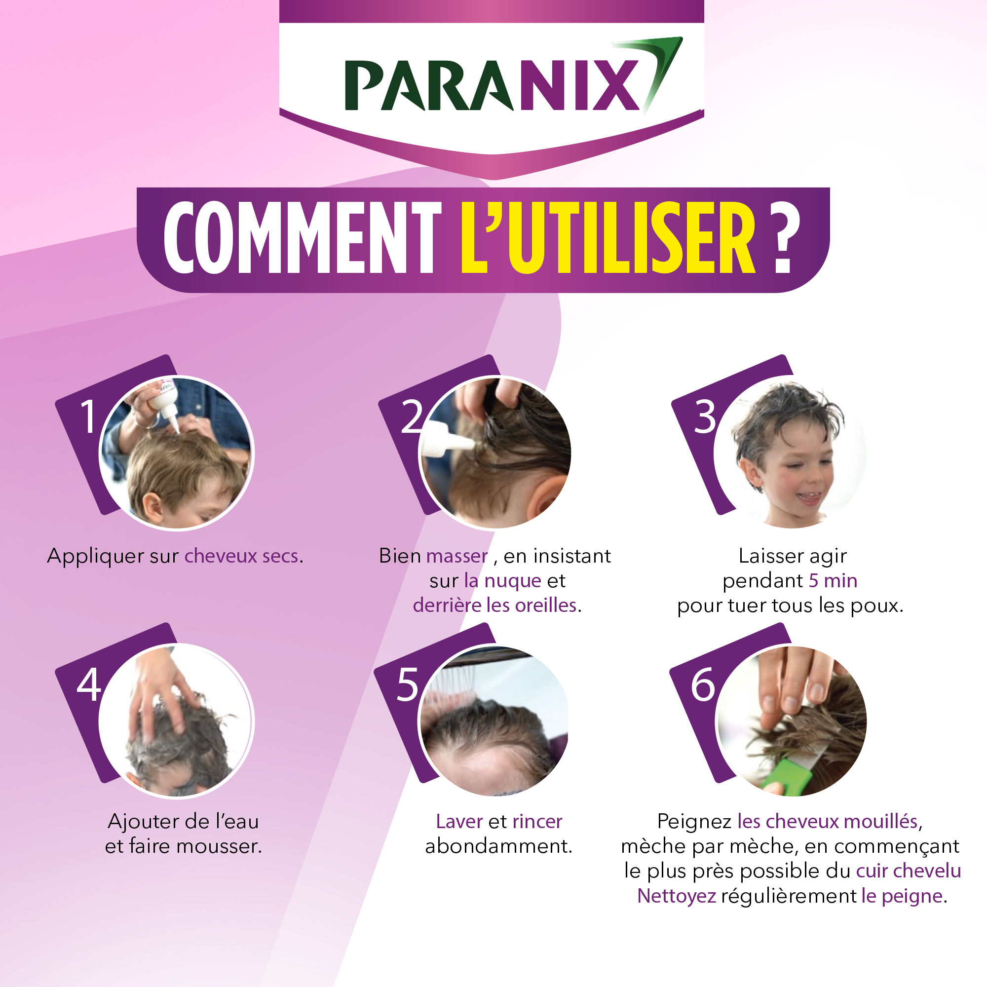 1. Inspecter mèche à mèche les cheveux secs en utilisant le peigne à dents fines en métal inclus dans la boîte. 2. Déposer une quantité suffisante de Shampooing Paranix Express directement sur cheveux secs. Veiller à recouvrir l'ensemble des cheveux et du cuir chevelu. Laisser agir pendant 5 minutes pour éliminer les poux. Pour traiter plus efficacement les lentes, laisser poser jusqu'à 10 minutes. 3. Ajouter un peu d'eau, suffisamment pour faire mousser le shampooing. 4. Laver les cheveux et rincer abondamment. Veiller à bien rincer les cheveux. 5. Avant de sécher les cheveux, passer minutieusement le peigne anti-poux Paranix pour éliminer poux et lentes. Nettoyer régulièrement le peigne.