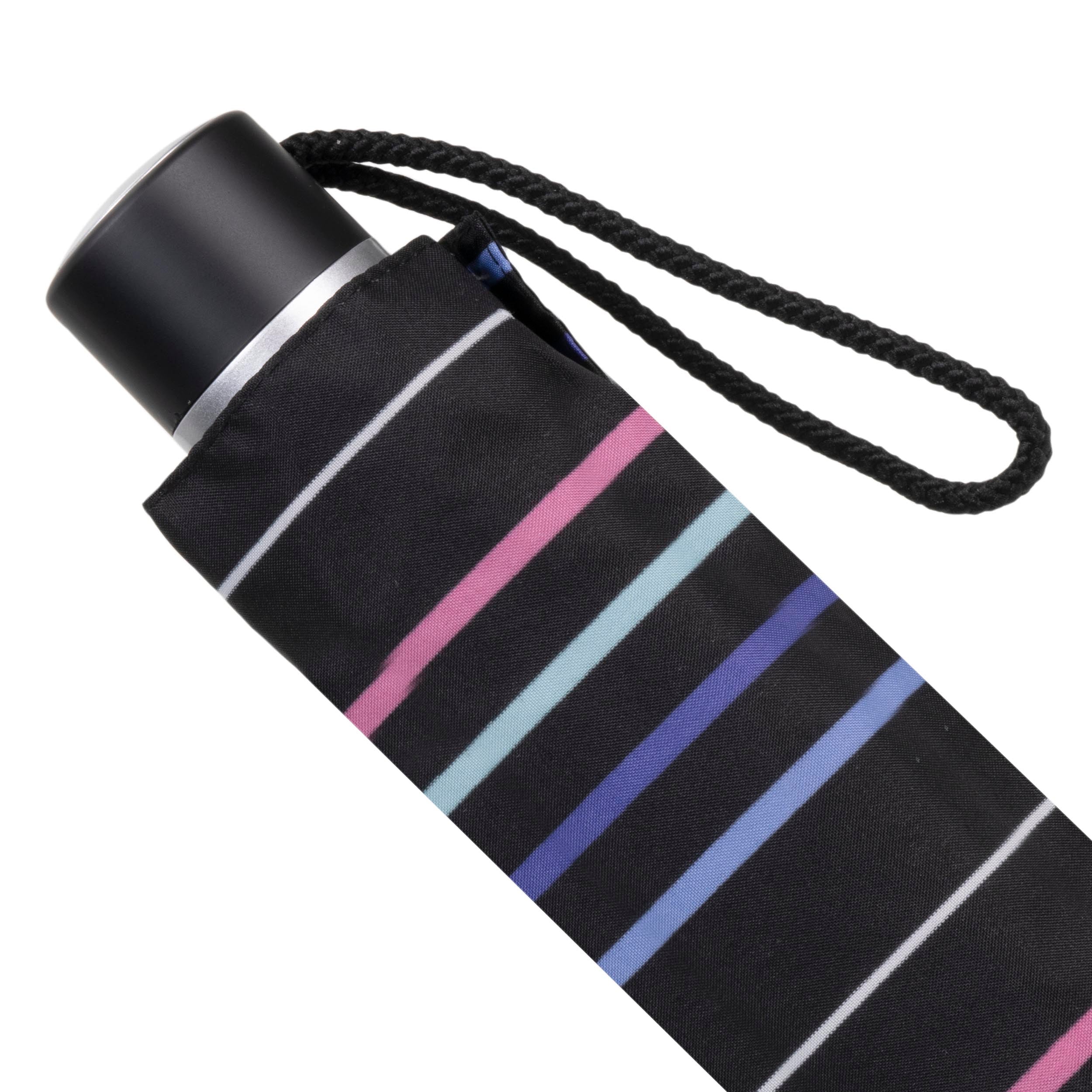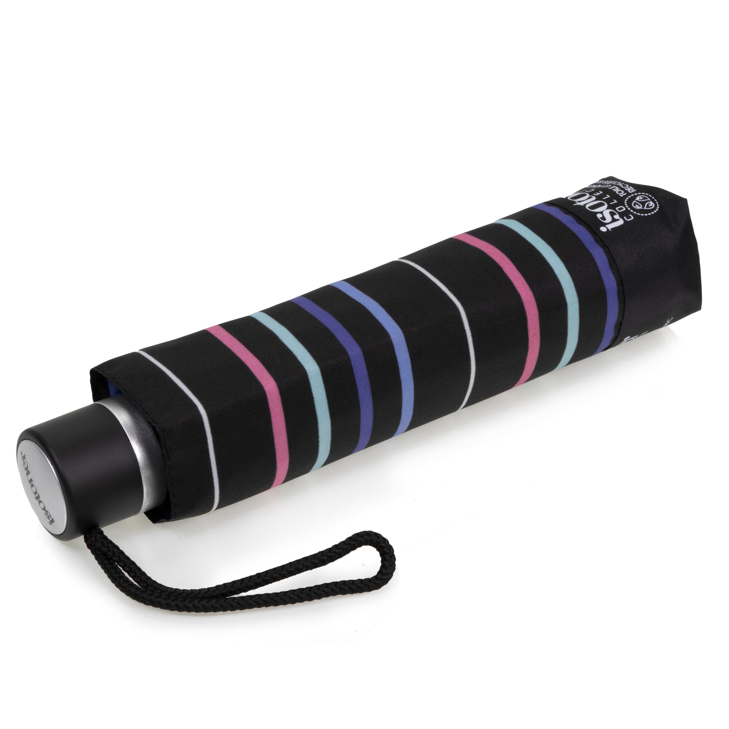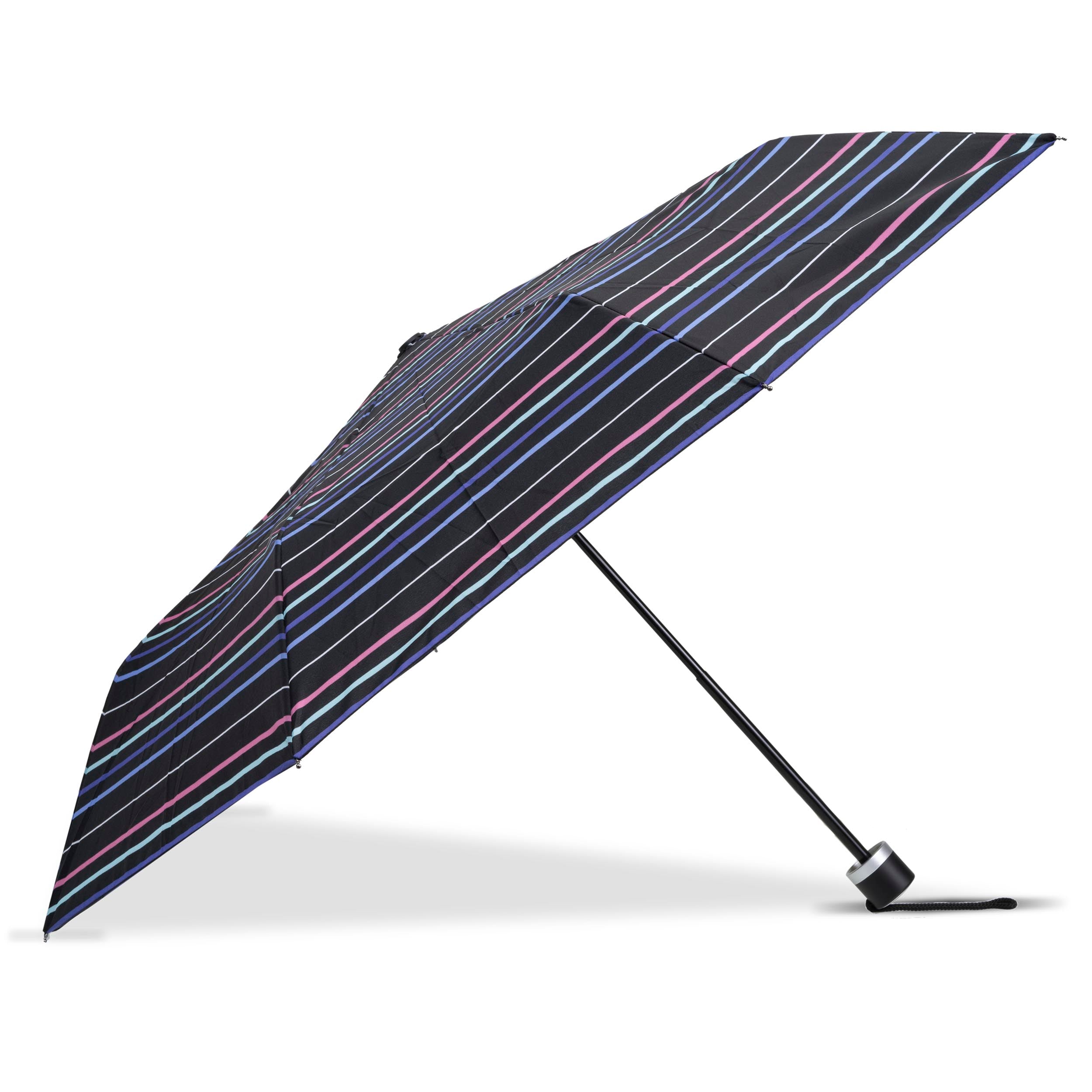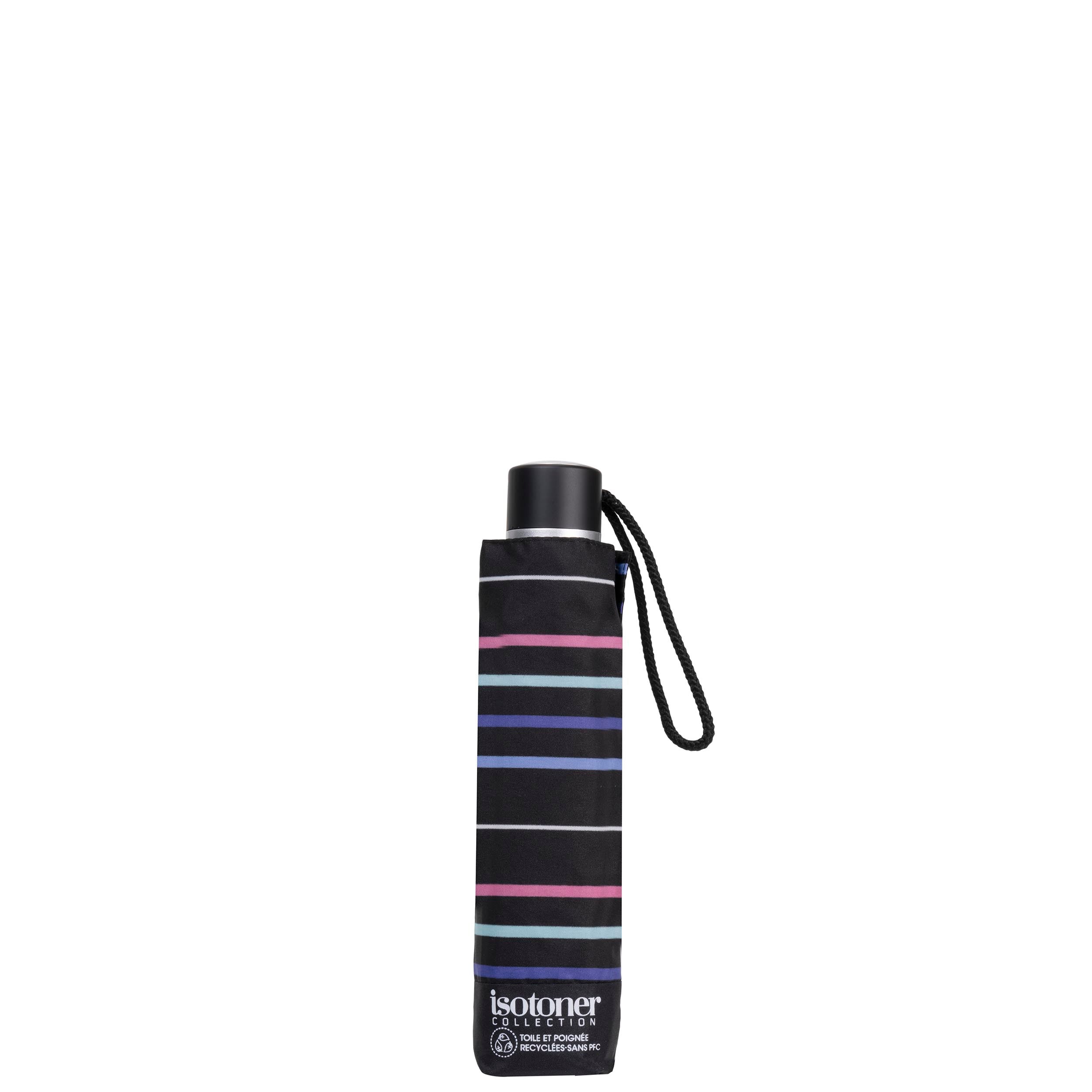 Ce parapluie décoré avec un imprimé à rayures pastel dont le prix défie toute concurrence possède de nombreux atouts. La toile de ce parapluie est ultra déperlante, et permet à l'eau d'être évacuée sans s'infiltrer. De plus, il s'ouvre manuellement avec un mât composé de trois sections et d'une structure de 8 baleines en acier pour la solidité. Il bénéficie également d'un large diamètre de couverture de 90 cm, d'un poids de 300 g, et d'une longueur de 23 cm (ni trop grand, ni trop petit). Un étui pour le ranger complète le tout. Enfin, sa toile et sa poignée 100% recyclées sont conçues à partir de plastique recyclé.