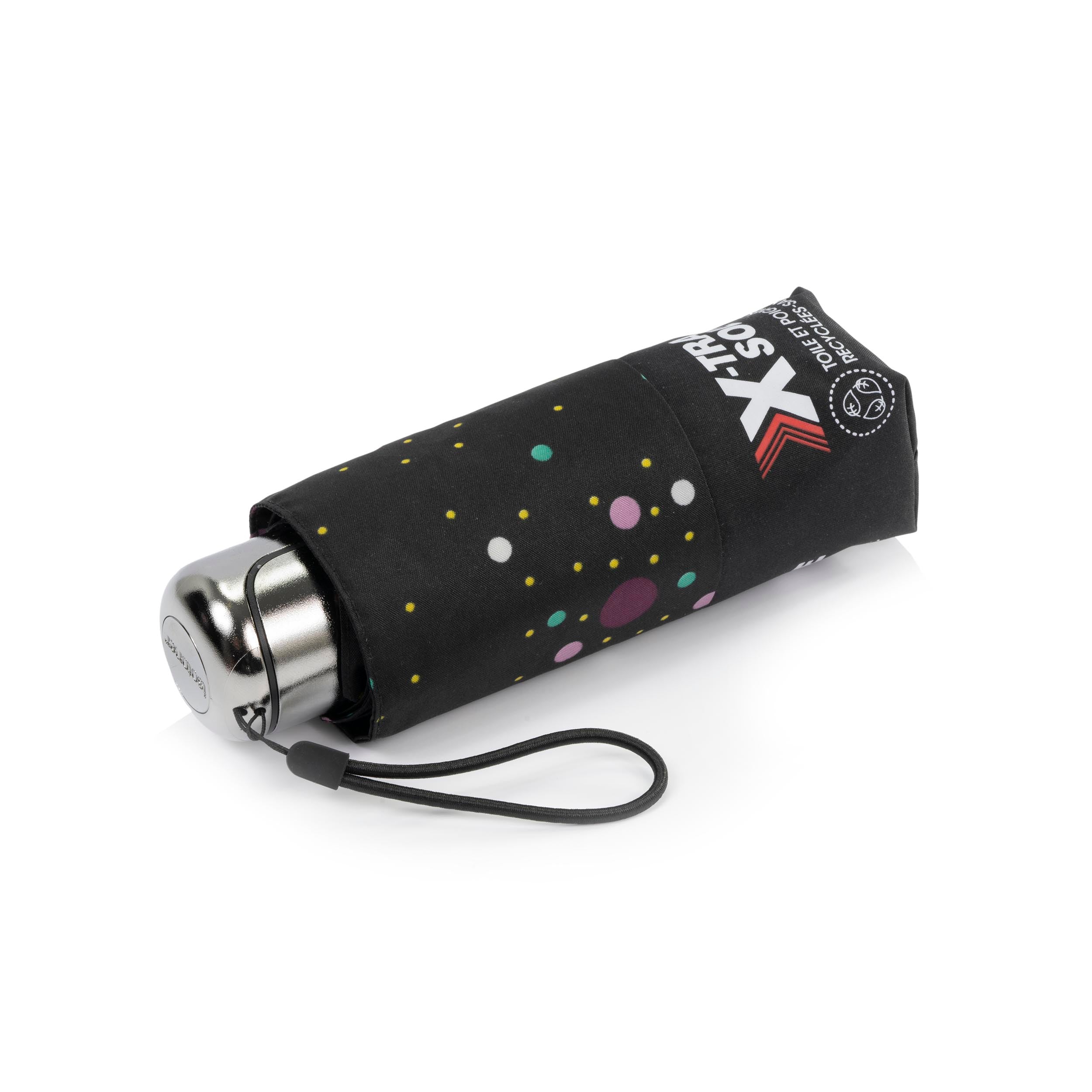 Ce parapluie compact MINI fait partie de notre gamme X-tra solide. Petit mais X-TRA SOLIDE, c'est un excellent compromis pour celles et ceux qui aiment des parapluies à taille réduite. Sa toile ultra déperlante laisse l'eau glisser sur la couverture de 93 cm de diamètre. Un étui permet de ranger le parapluie avant de le glisser dans le sac. Son mât de 5 sections rétractable en font un des parapluies les plus mini : 16,5 cm replié. Il est solide grâce à ses 6 baleines en aluminium, et léger, avec ses seulement 215 grammes Ce petit parapluie à l'ouverture manuelle possède une poignée et une toile 100% recyclées, conçues à partir de plastique recyclé.