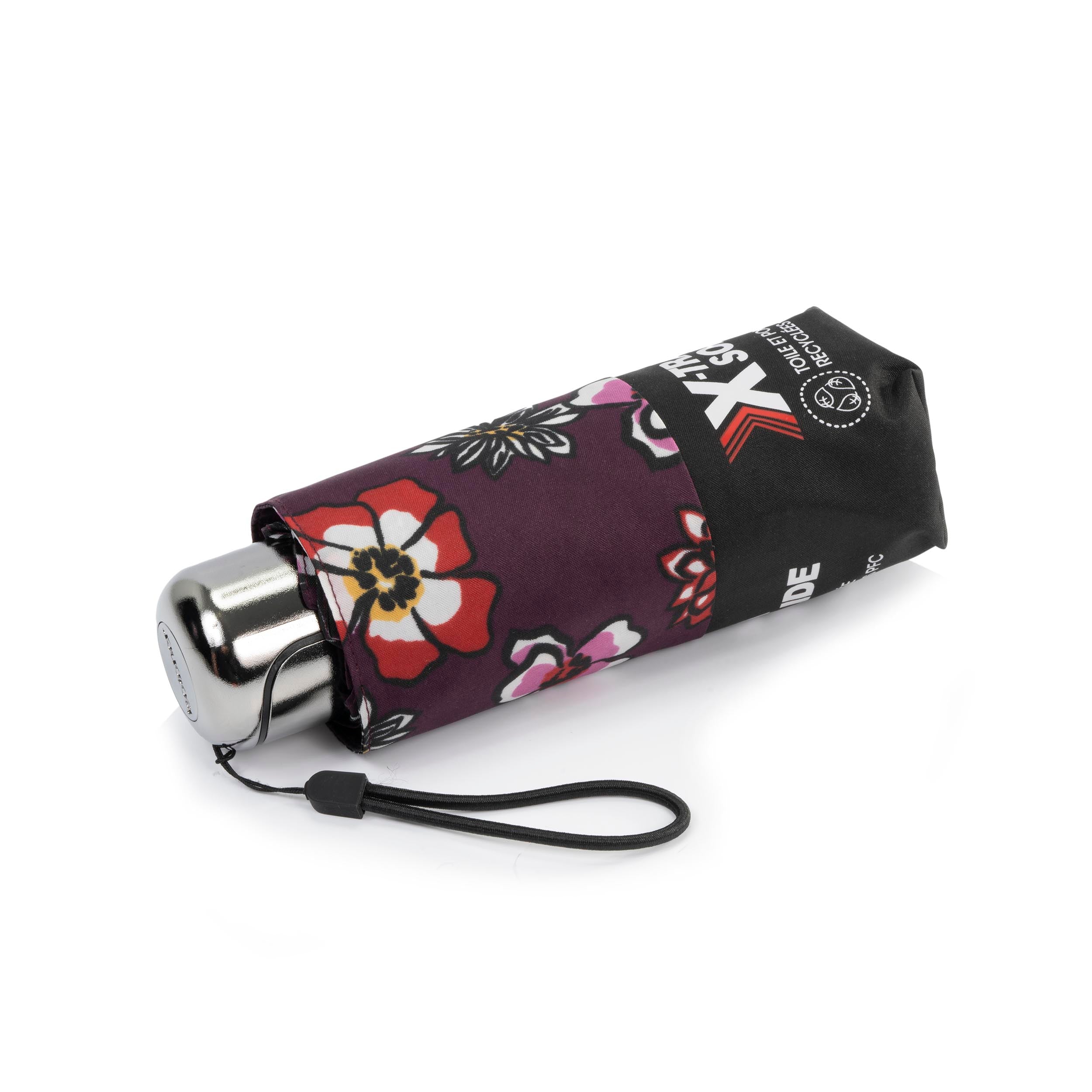Ce parapluie compact MINI de motif Fleurs pensées fait partie de notre gamme X-tra solide. Petit mais X-TRA SOLIDE, c'est un excellent compromis pour celles et ceux qui aiment des parapluies à taille réduite. Sa toile ultra déperlante laisse l'eau glisser sur la couverture de 93 cm de diamètre. Un étui permet de ranger le parapluie avant de le glisser dans le sac. Son mât de 5 sections rétractable en font un des parapluies les plus mini : 16,5 cm replié. Il est solide grâce à ses 6 baleines en aluminium, et léger, avec ses seulement 215 grammes Ce petit parapluie à l'ouverture manuelle bénéficie d'un look moderne et élégant avec son motif Fleurs Pensées ! Poignée et toile 100% recyclées et conçues à partir de plastique recyclé.