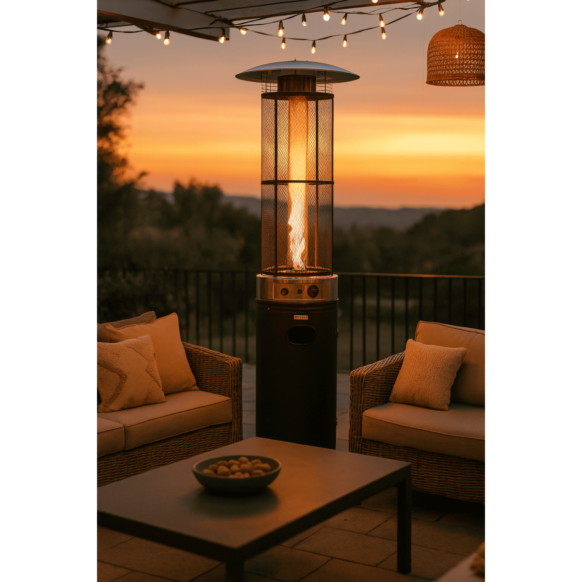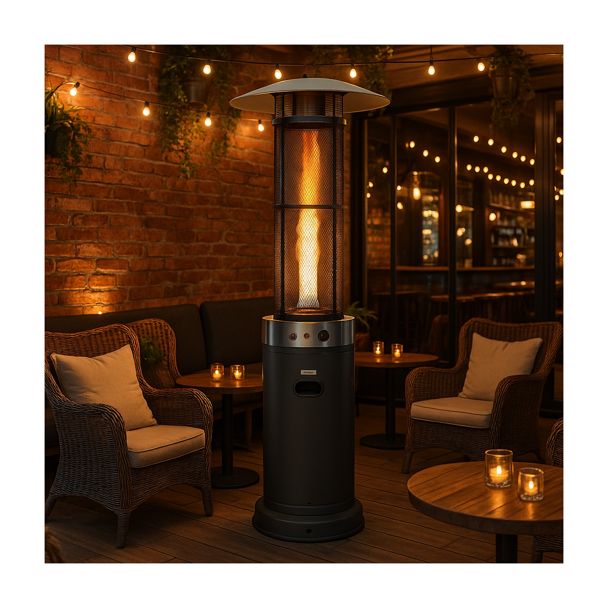 - Puissance 11 kW avec diffusion à 360° : chaleur homogène et enveloppante sur toute la zone, jusqu'à 92 m² couverts pour vos terrasses ou jardins.