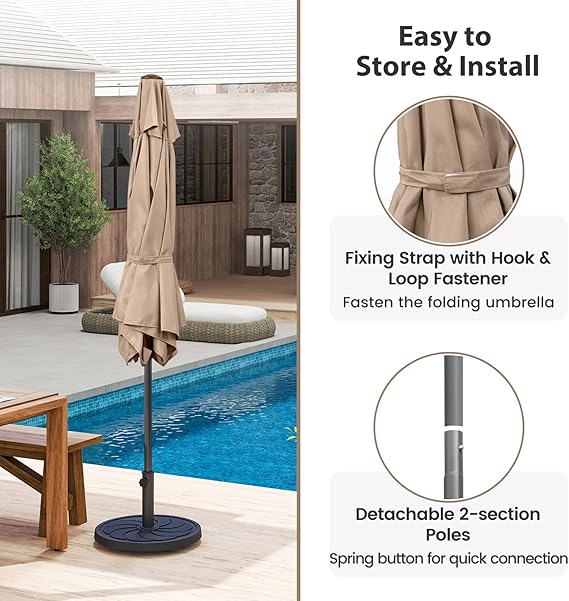 - RANGEMENT ET INSTALLATION SIMPLES : Le parasol se compose de deux mâts facilement détachables pour un rangement et un transport aisés. Lorsqu'ils ne sont pas utilisés, les mâts et les sangles de fixation peuvent être rangés de manière compacte pour créer un espace extérieur propre et organisé.