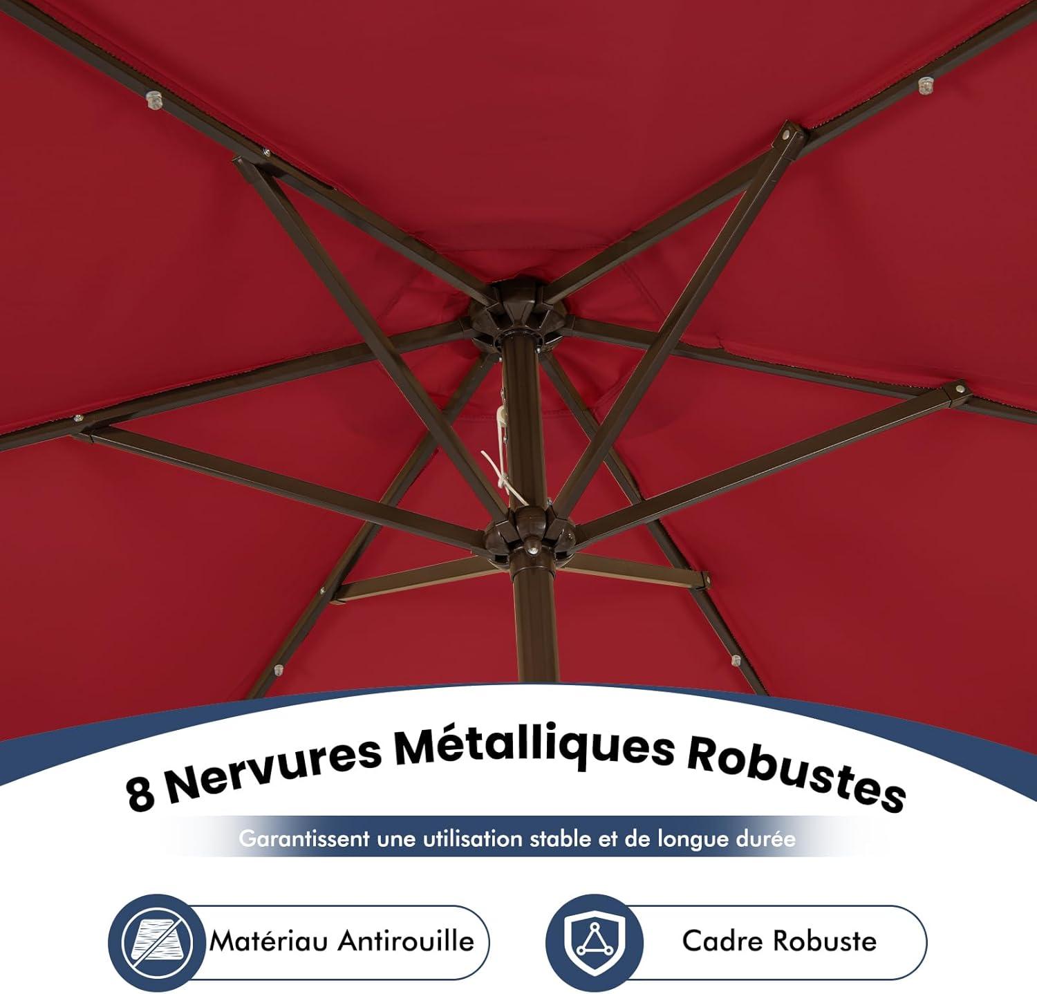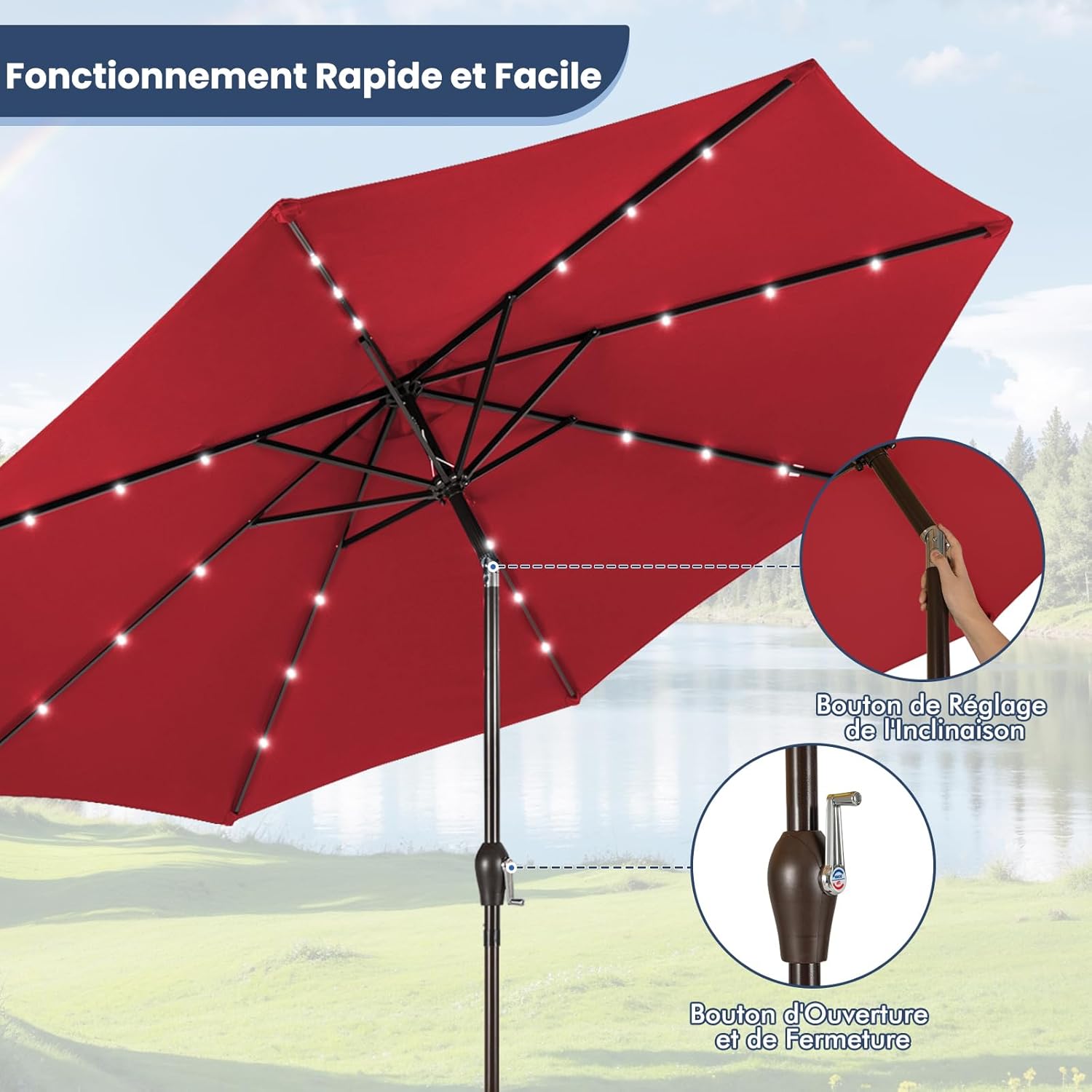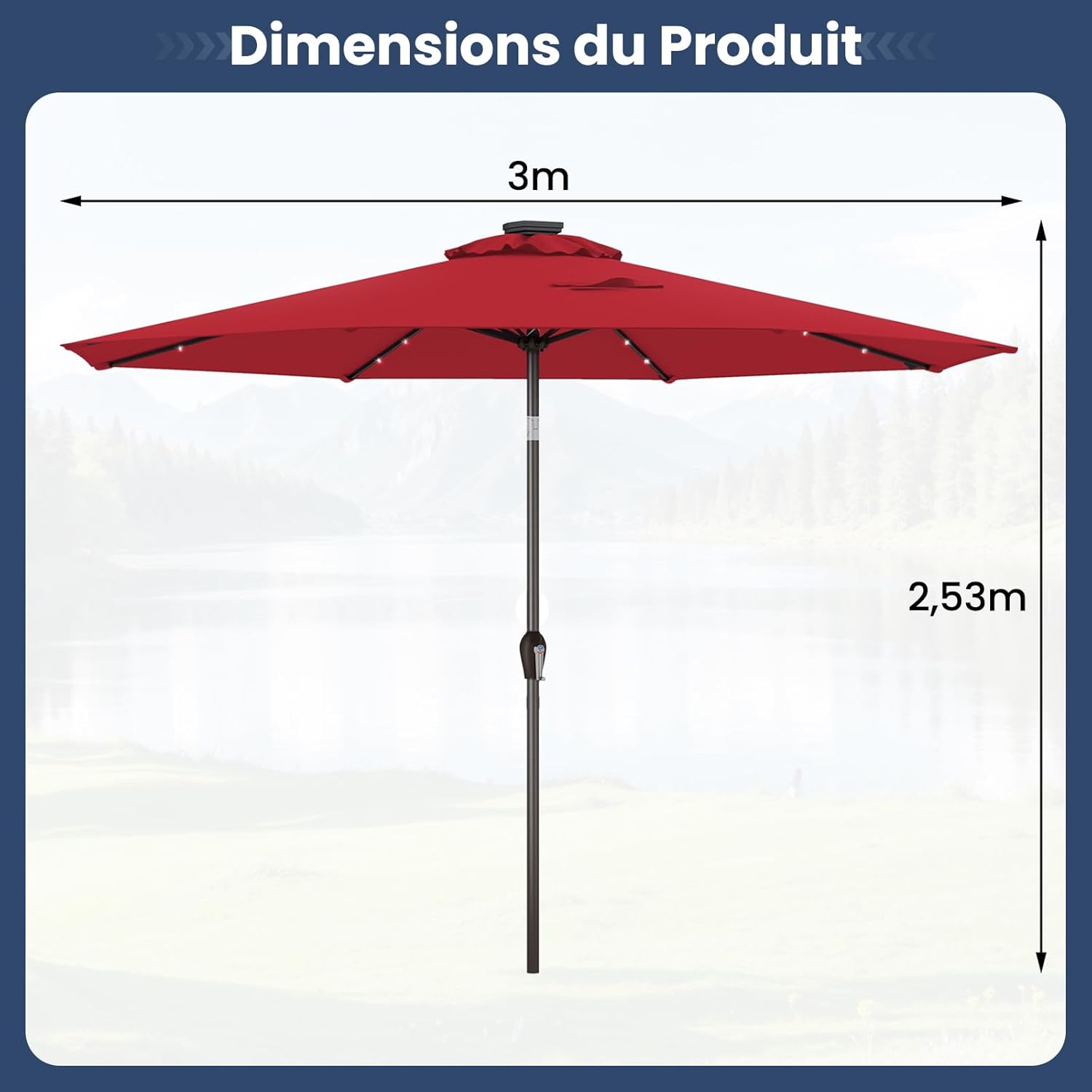 | Libellé | Parasol de jardin exterieur 3m, parasol inclinable 8 baleines, lumineux solaire 24 led, manivelle,rouge |