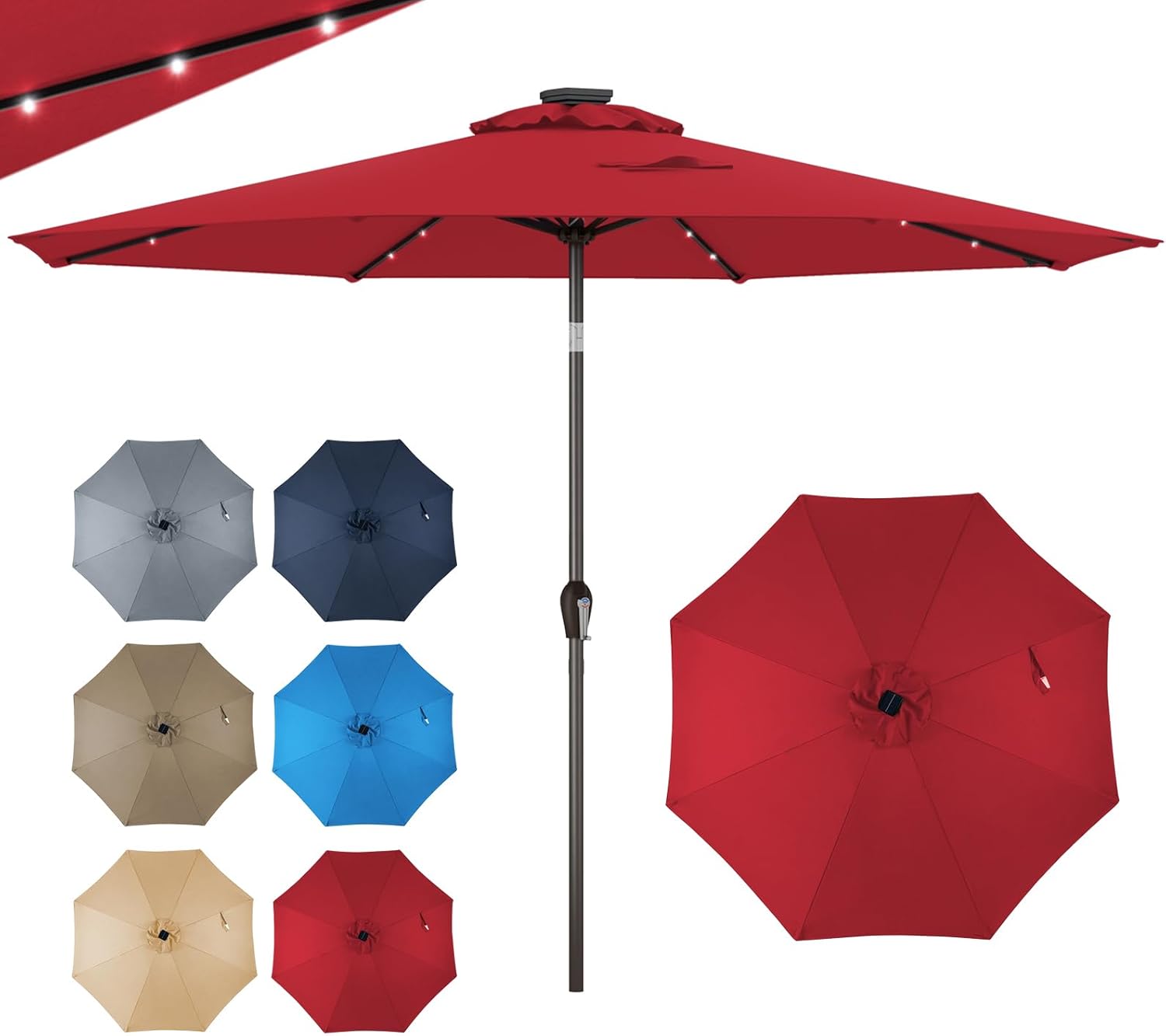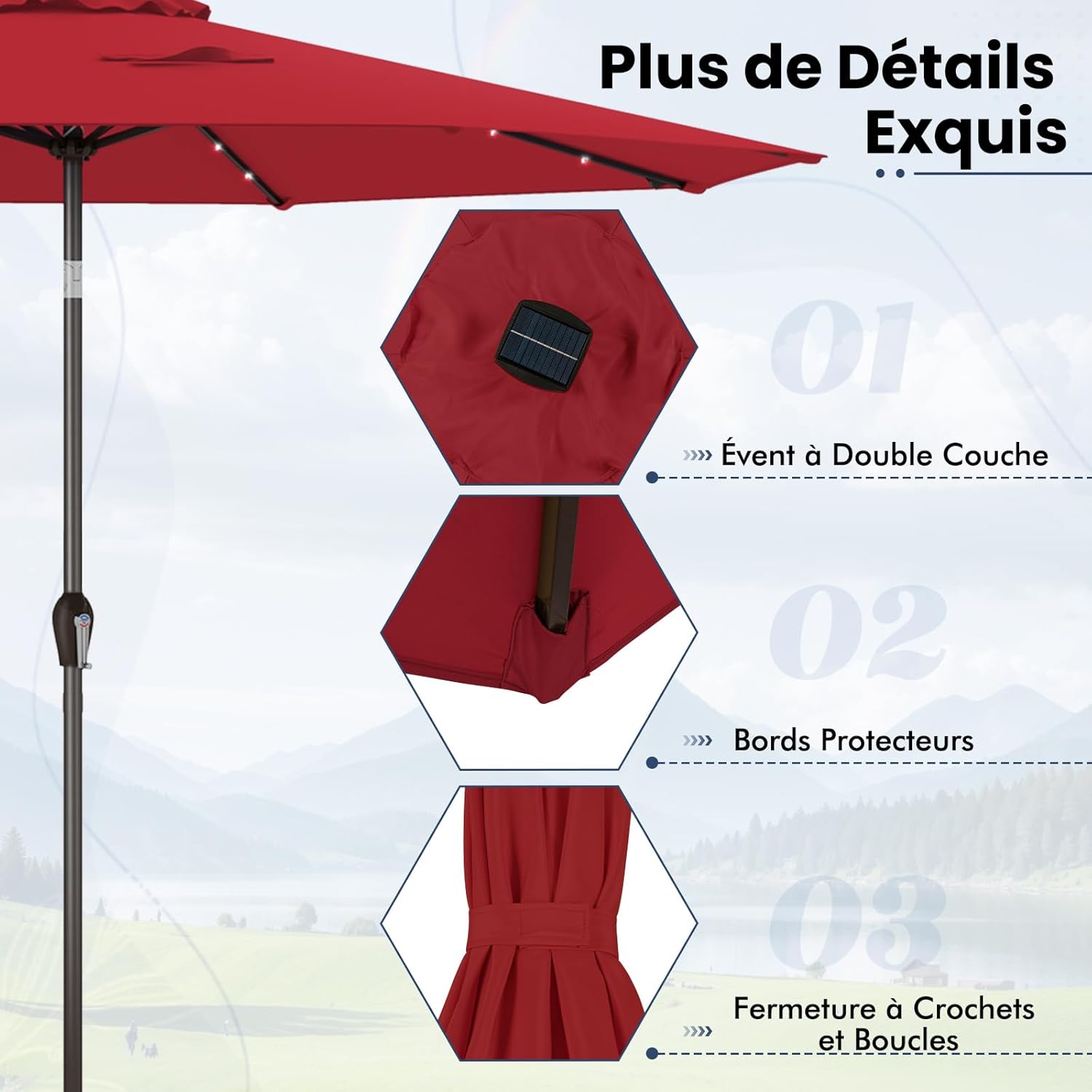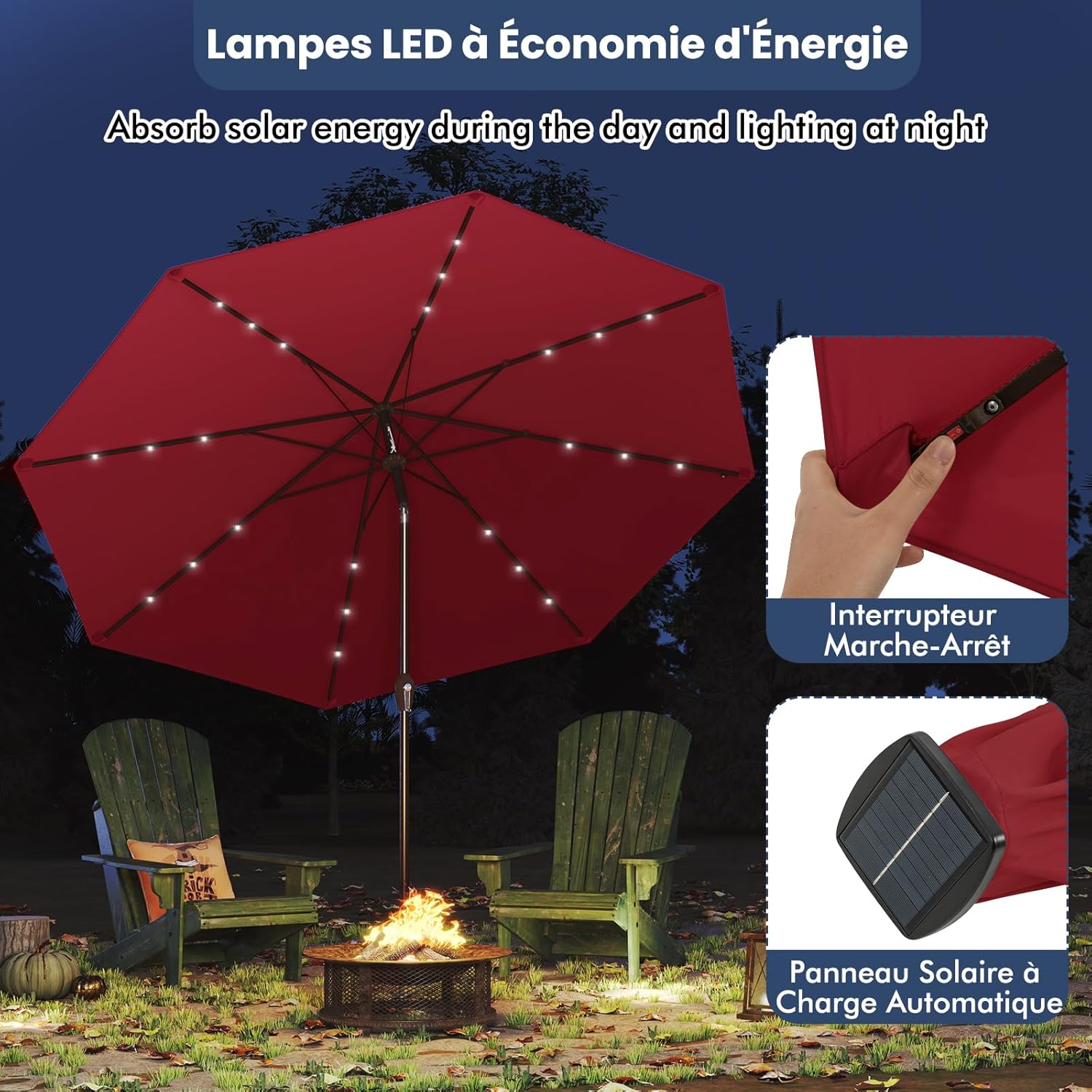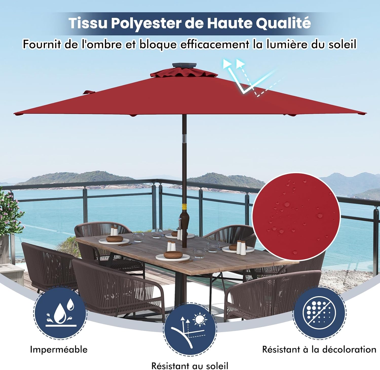 | Libellé | Parasol de jardin exterieur 3m, parasol inclinable 8 baleines, lumineux solaire 24 led, manivelle,rouge |
