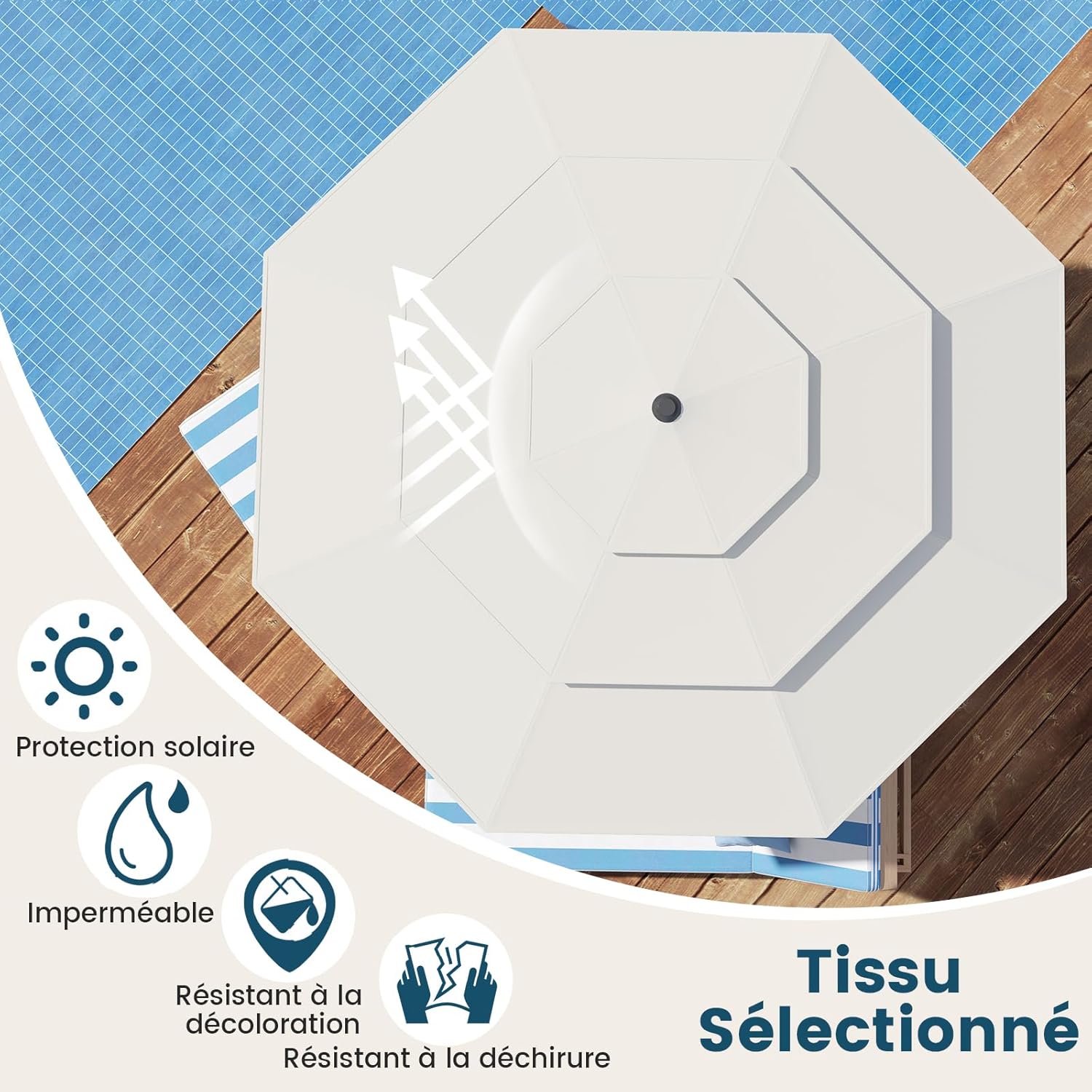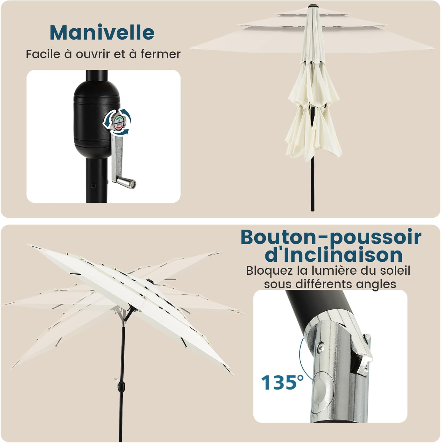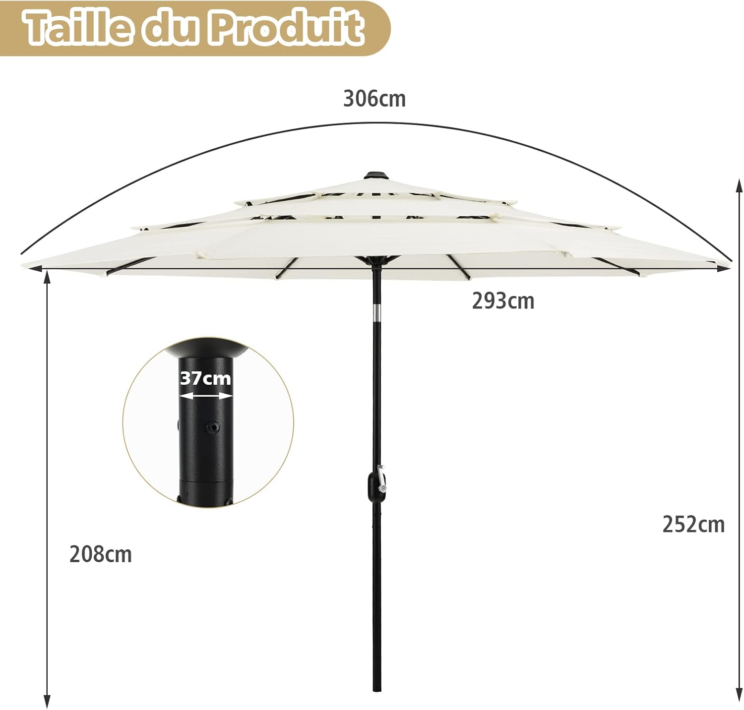 | Libellé | Parasol de jardin exterieur à 3 niveaux, évents doubles, 3m parasol inclinable avec poteau en métal beige |