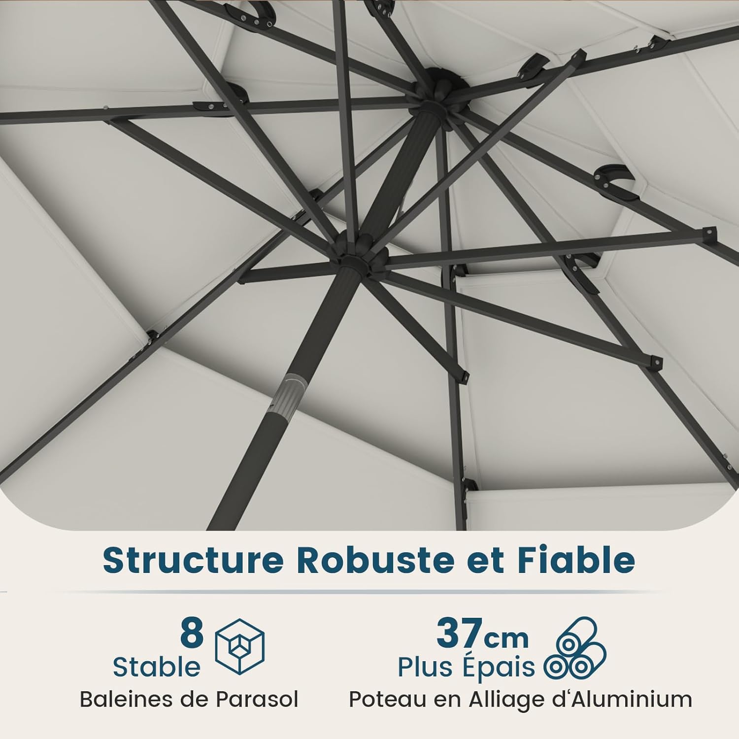 - Meilleur Protection Solaire : Notre parasol de patio est équipé d’une toile de protection 3 mètres afin de créer un bel espace d’ombrage. Vous pourrez passer un agréable moment à l'ombre avec votre famille et vos amis sans craindre les coups de soleil !