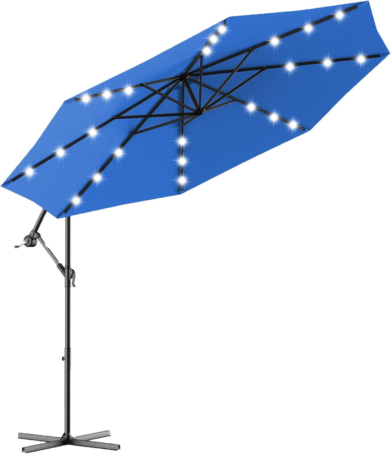 Parasol de jardin exterieur avec 24 led solaire, 3m parasol deporte avec manivelle,base non incluse bleu