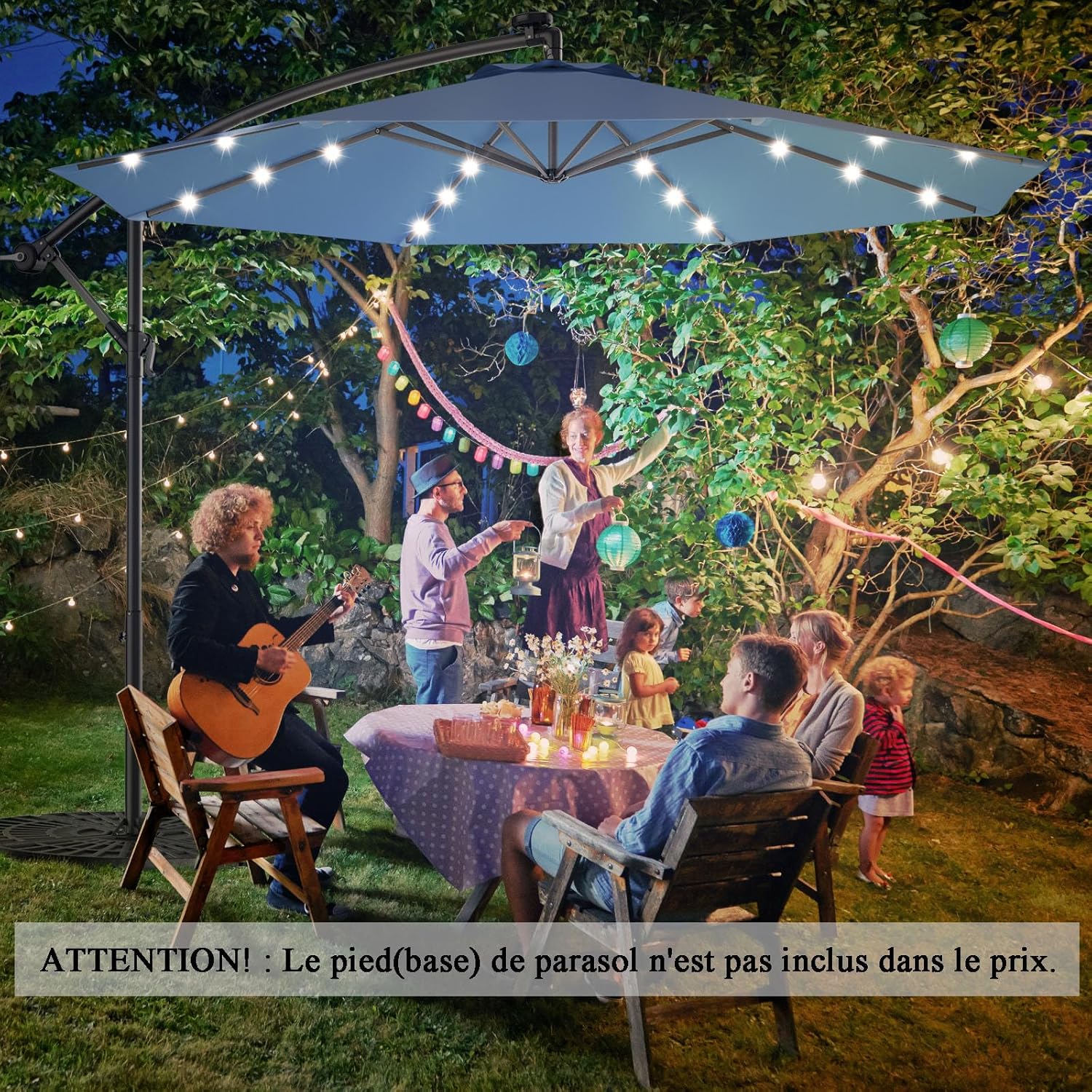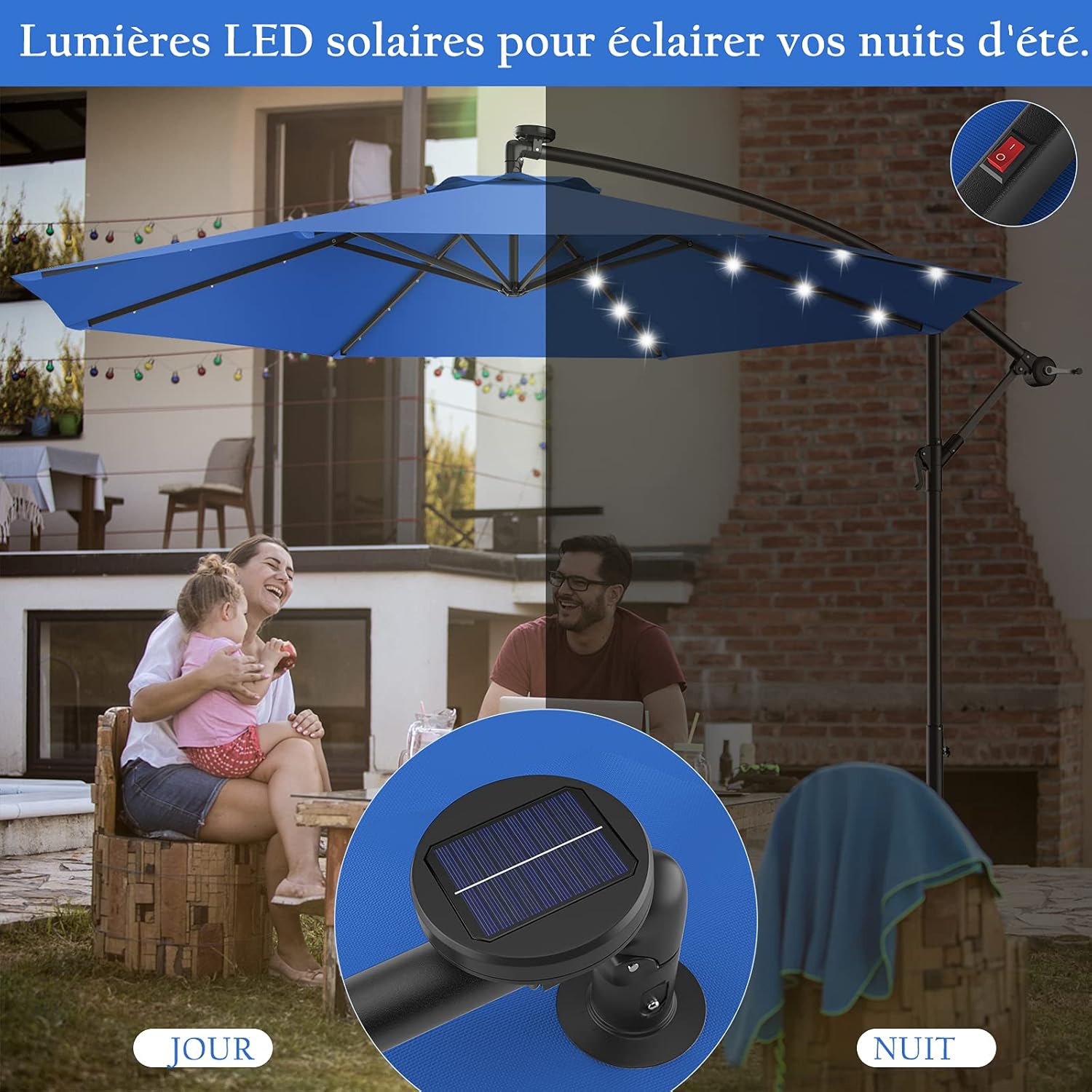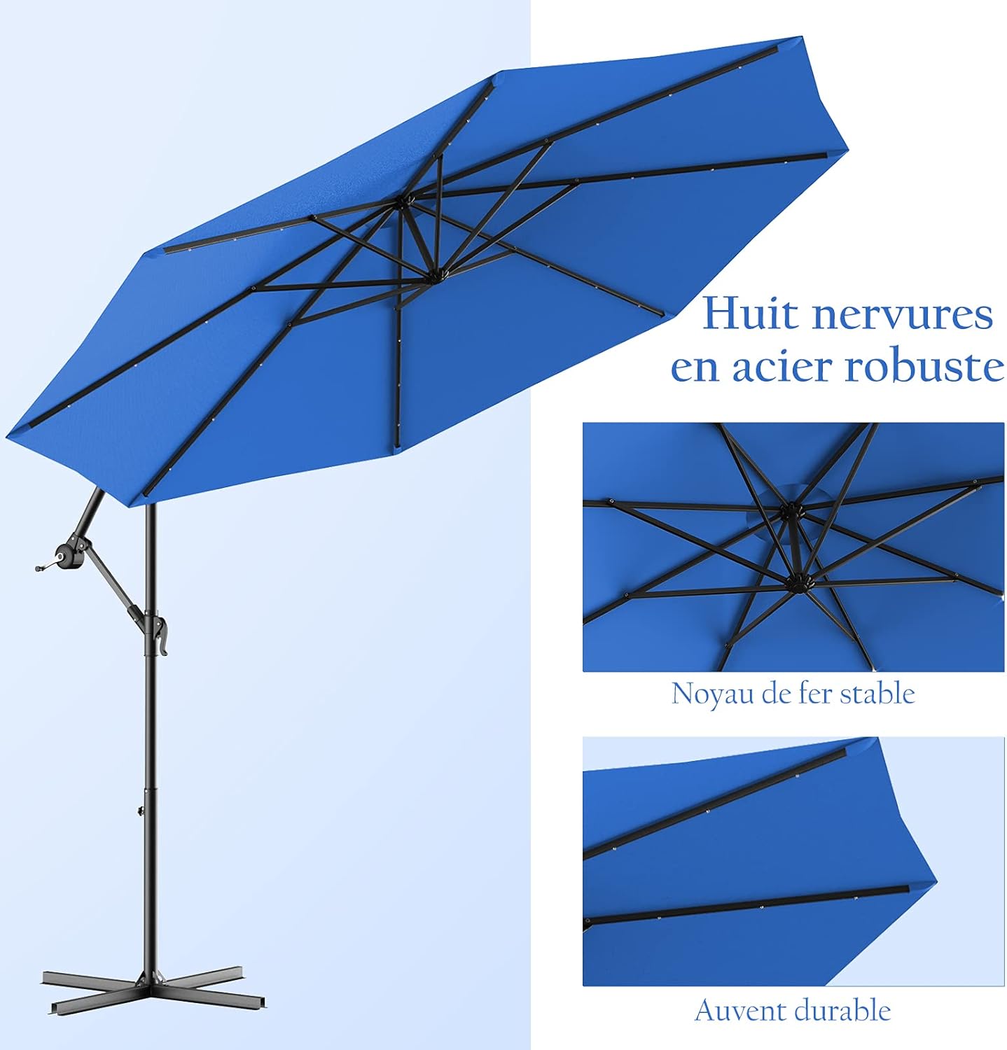 | Libellé | Parasol de jardin exterieur avec 24 led solaire, 3m parasol deporte avec manivelle,base non incluse bleu |