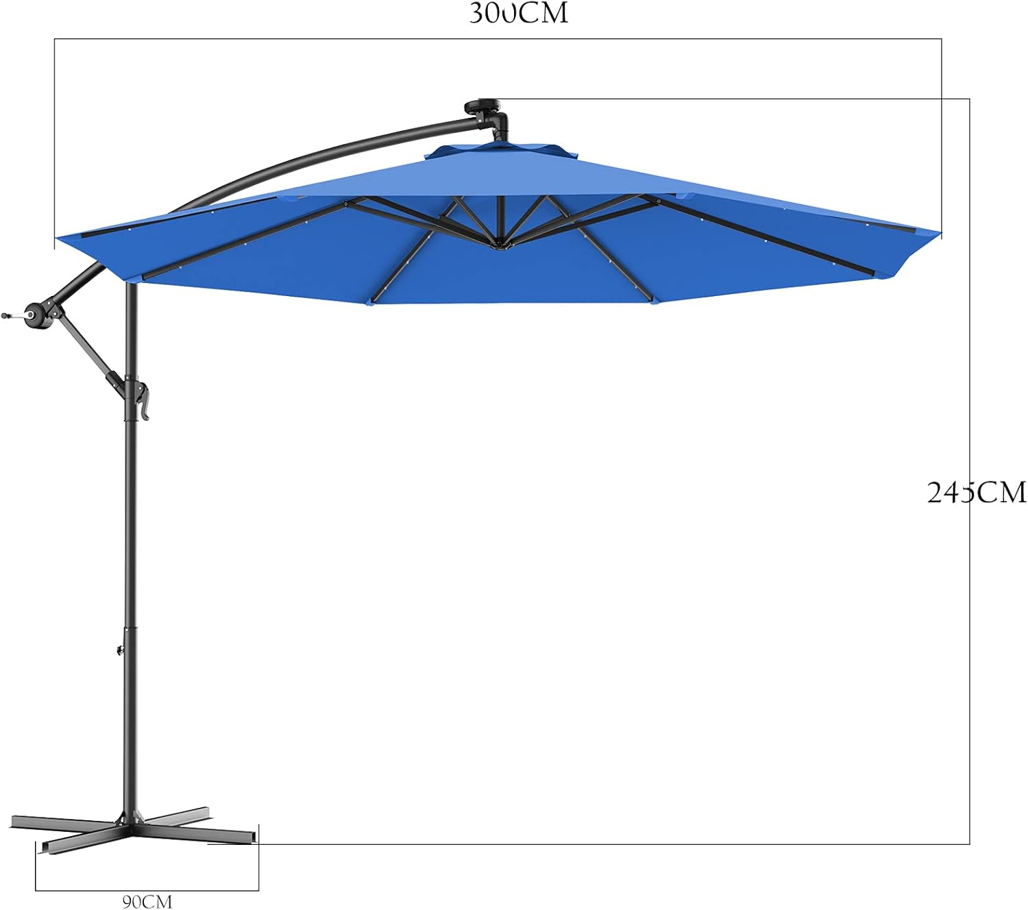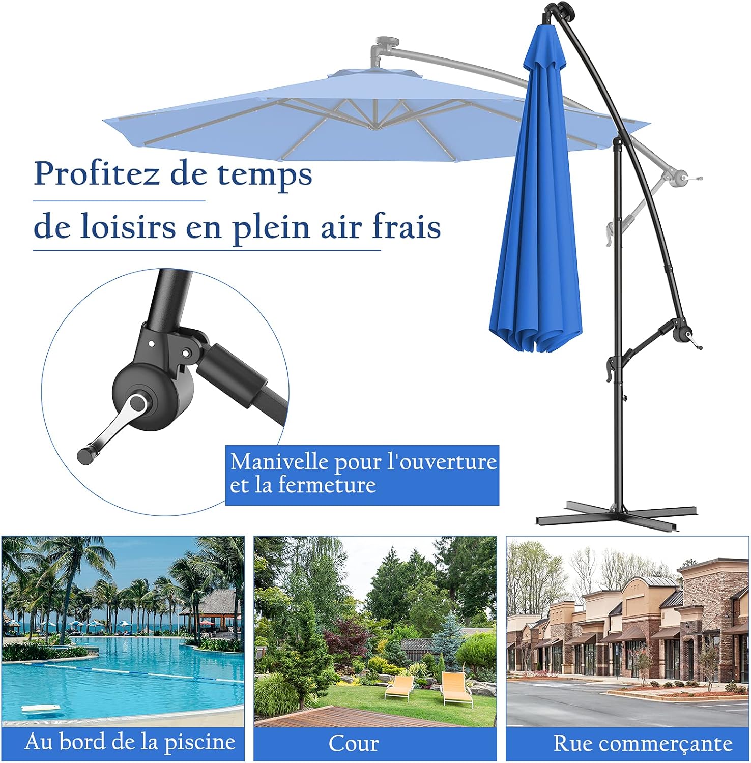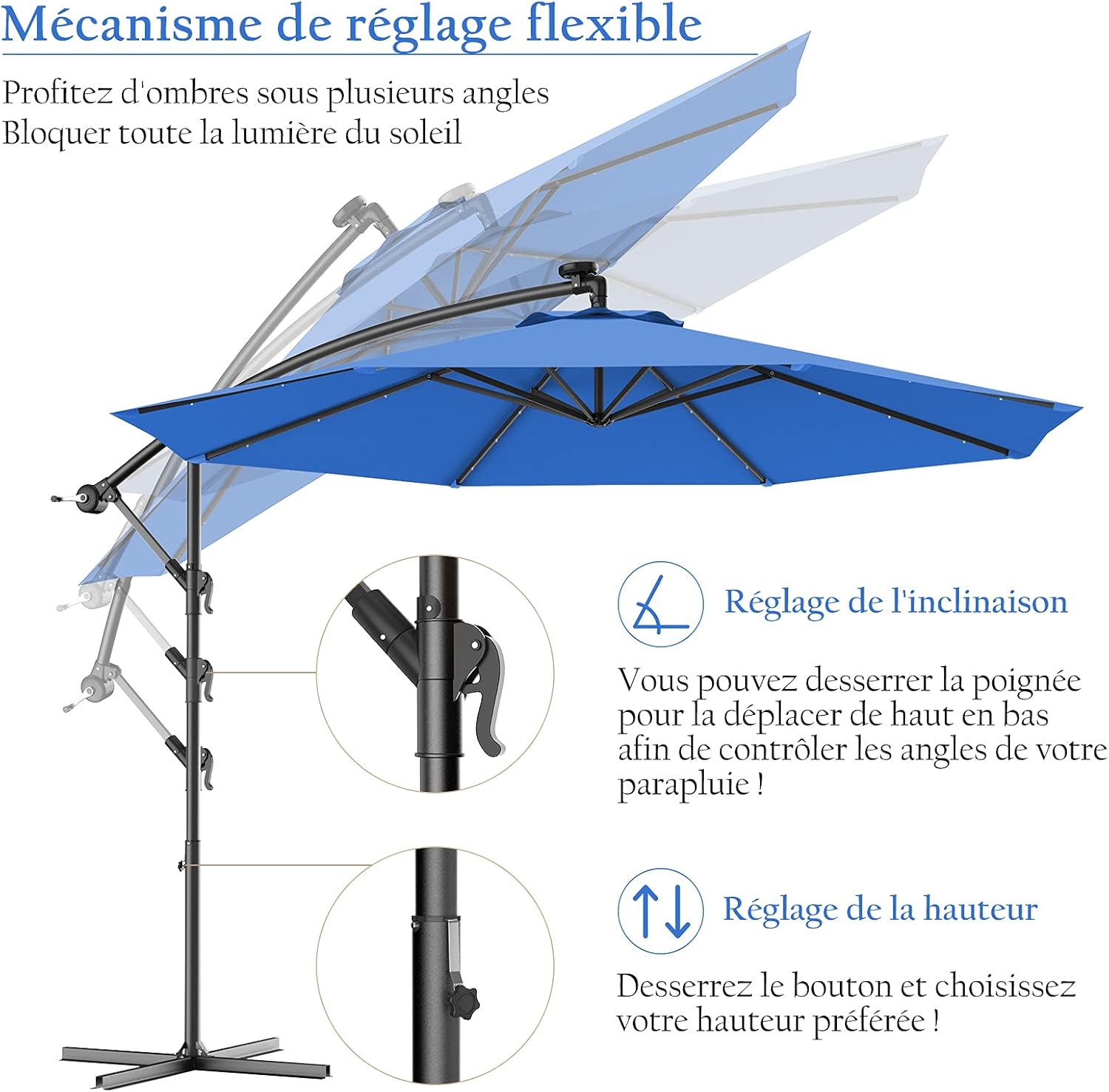| Libellé | Parasol de jardin exterieur avec 24 led solaire, 3m parasol deporte avec manivelle,base non incluse bleu |
