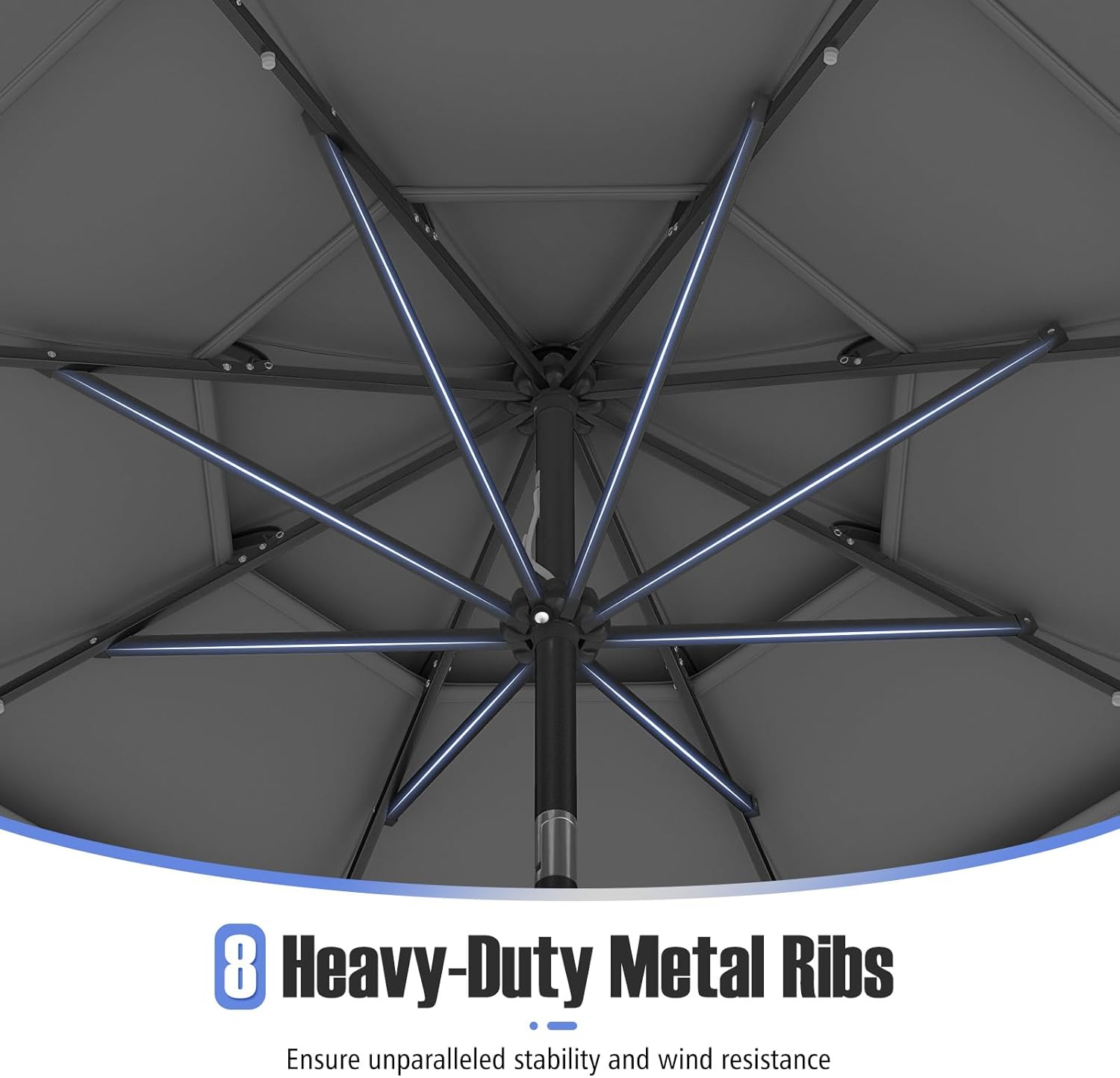 Parasol de jardin exterieur avec 32 lumières led, 3m parasol balcon inclinable avec toit à 3 niveaux,gris