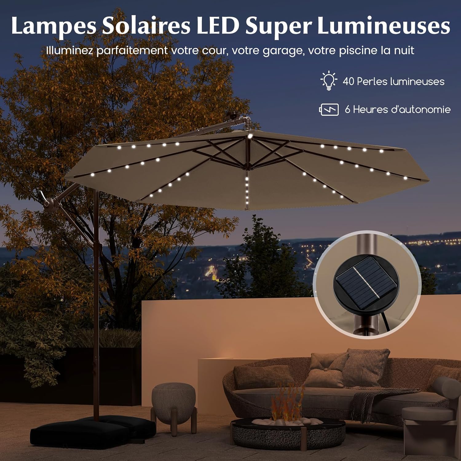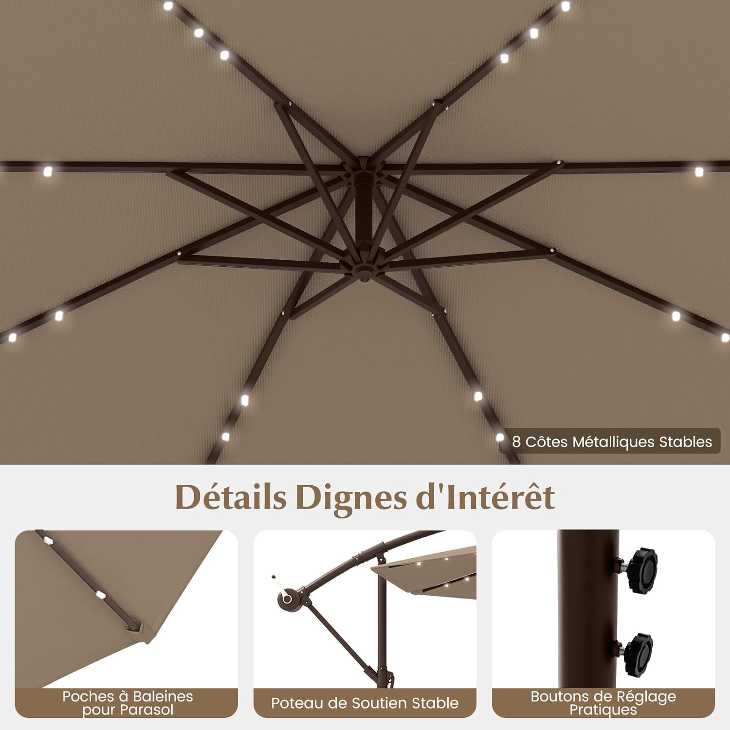 Parasol de jardin extérieur avec pied,parasol déporté inclinable, avec 8 baleines 32 lampes solaires,café