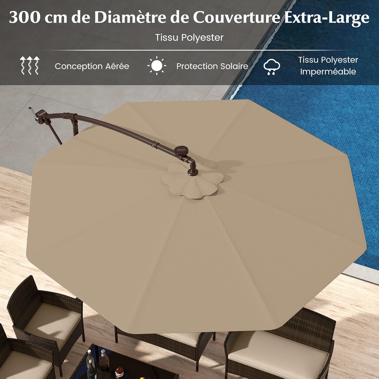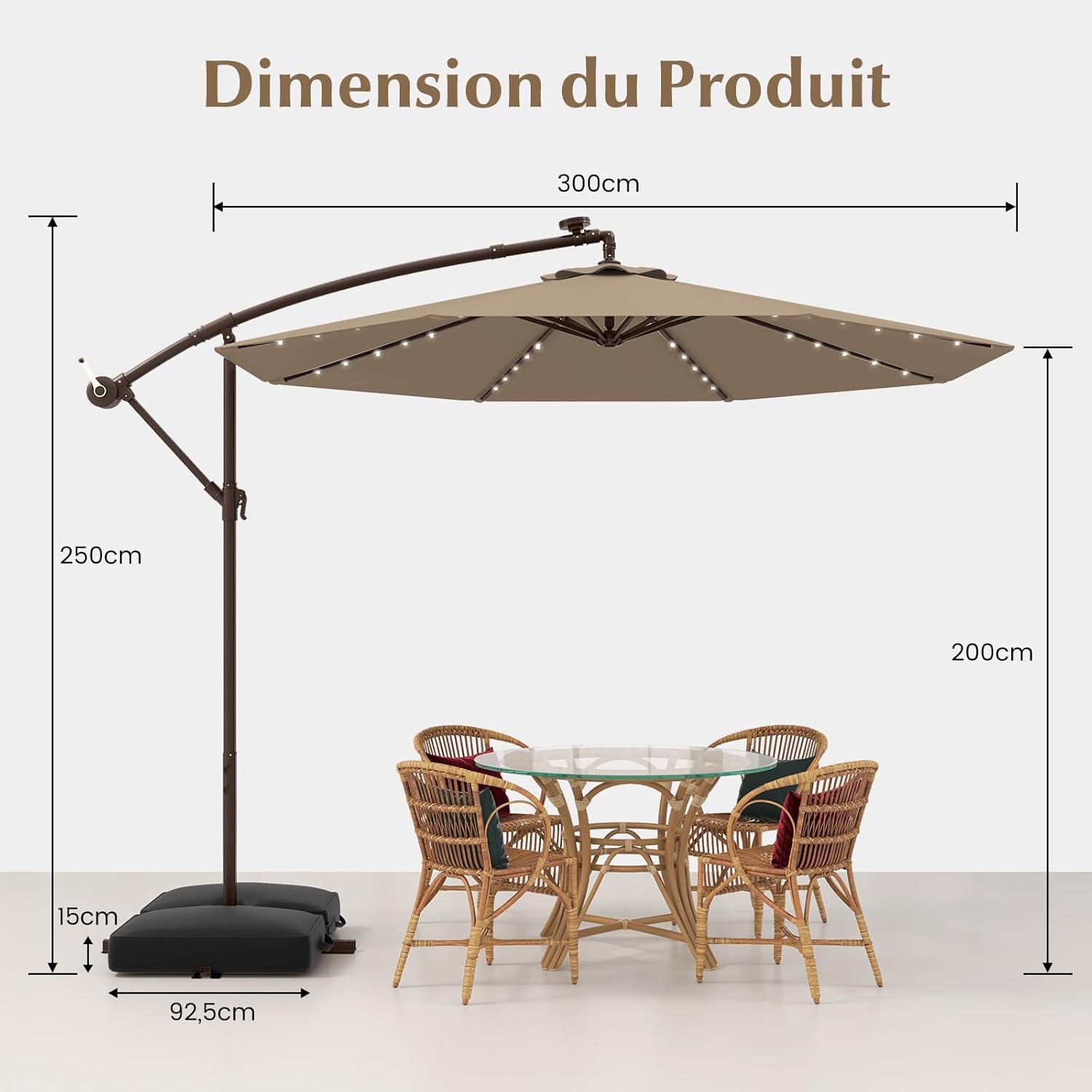 | Libellé | Parasol de jardin extérieur avec pied,parasol déporté inclinable, avec 8 baleines 32 lampes solaires,café |