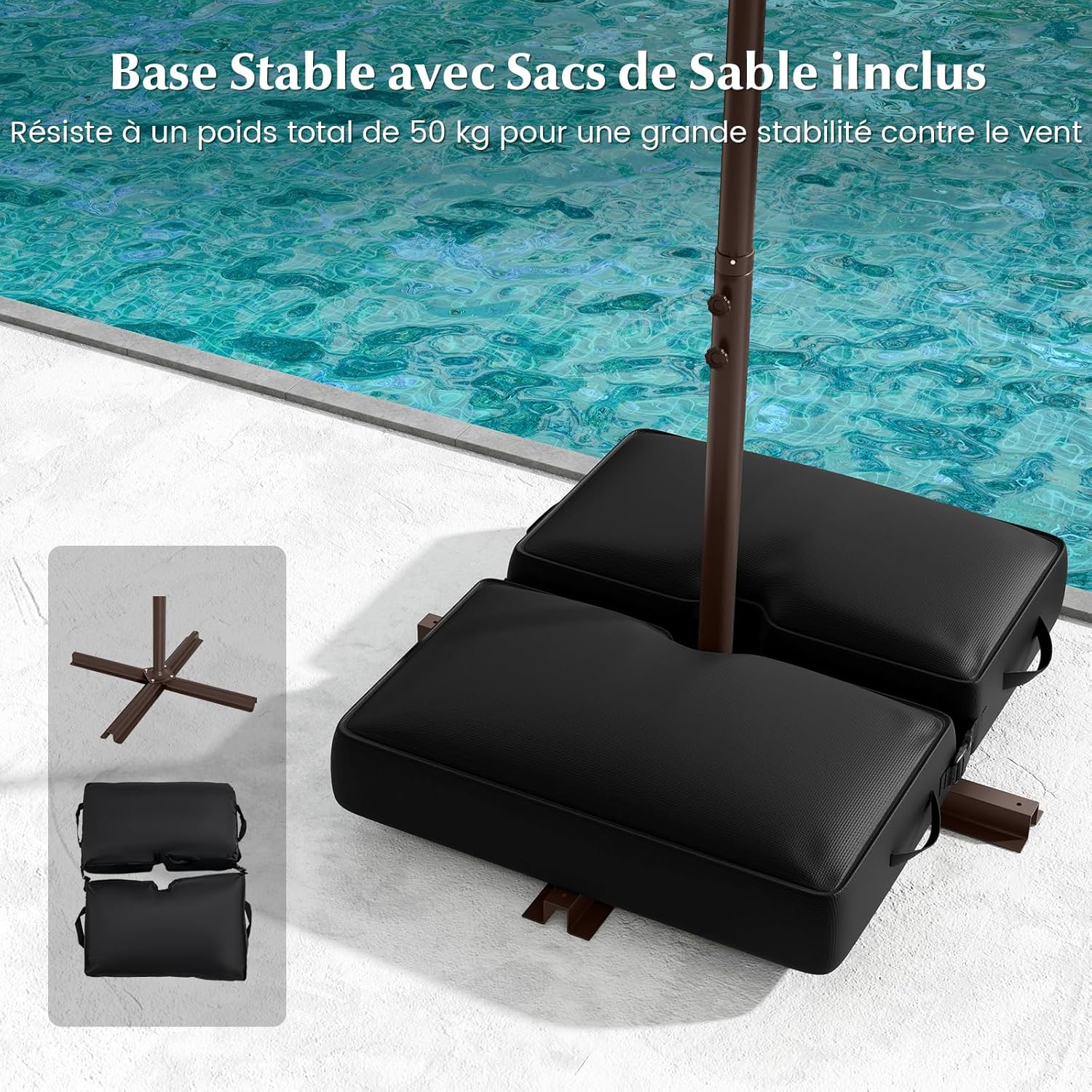 - 𝐒𝐚𝐜𝐬 𝐝𝐞 𝐒𝐚𝐛𝐥𝐞 𝐒𝐨𝐥𝐢𝐝𝐞𝐬 & 𝐋𝐚𝐫𝐠𝐞 𝐀𝐩𝐩𝐥𝐢𝐜𝐚𝐭𝐢𝐨𝐧 : Le parasol est livré avec 2 sacs de sable vides (chacun contenant 50 kg de sable). Vous n'avez donc pas à vous soucier de l'inclinaison ou de l'effondrement du parasol, même en cas de vent. Vous pouvez l’utiliser en toute sécurité sur la terrasse, le jardin, au bord de la piscine ou même sur la plage.
