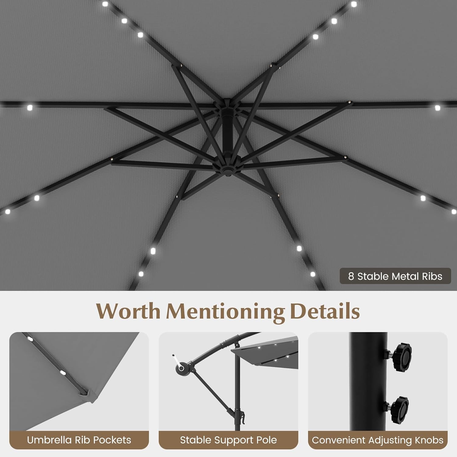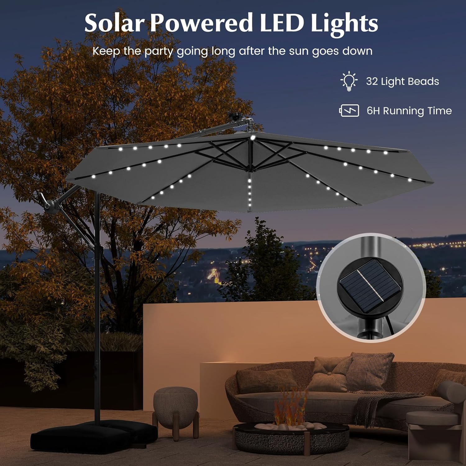 Parasol de jardin extérieur avec pied, parasol déporté inclinable avec 8 baleines 32 lampes solaires,gris