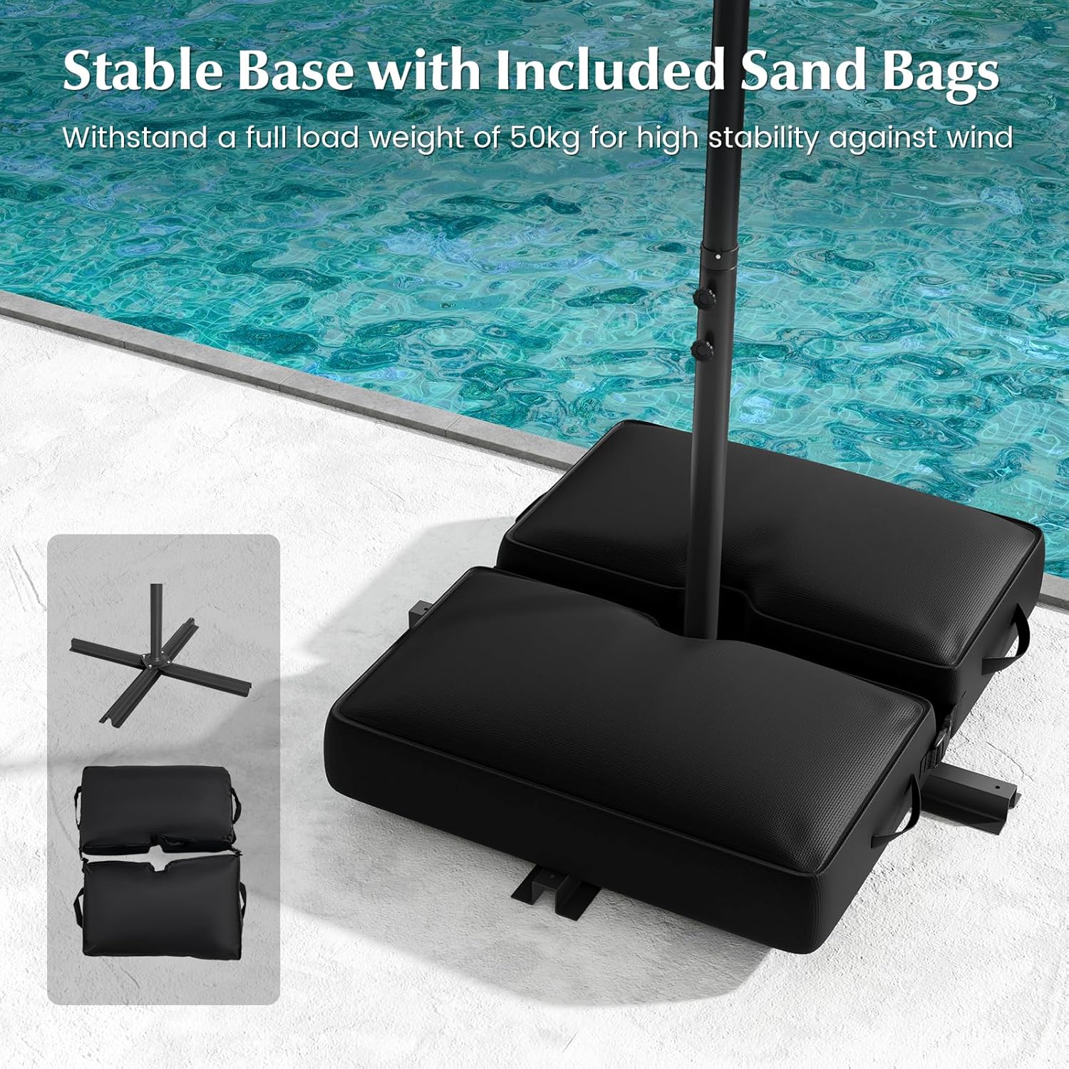 - 𝐒𝐚𝐜𝐬 𝐝𝐞 𝐒𝐚𝐛𝐥𝐞 𝐒𝐨𝐥𝐢𝐝𝐞𝐬 & 𝐋𝐚𝐫𝐠𝐞 𝐀𝐩𝐩𝐥𝐢𝐜𝐚𝐭𝐢𝐨𝐧 : Le parasol de patio est livré avec 2 sacs de sable vides (chacun contenant 50 kg de sable). Vous n'avez donc pas à vous soucier de l'inclinaison ou de l'effondrement du parasol, même en cas de vent. Vous pouvez l’utiliser en toute sécurité sur la terrasse, le jardin, au bord de la piscine ou même sur la plage.