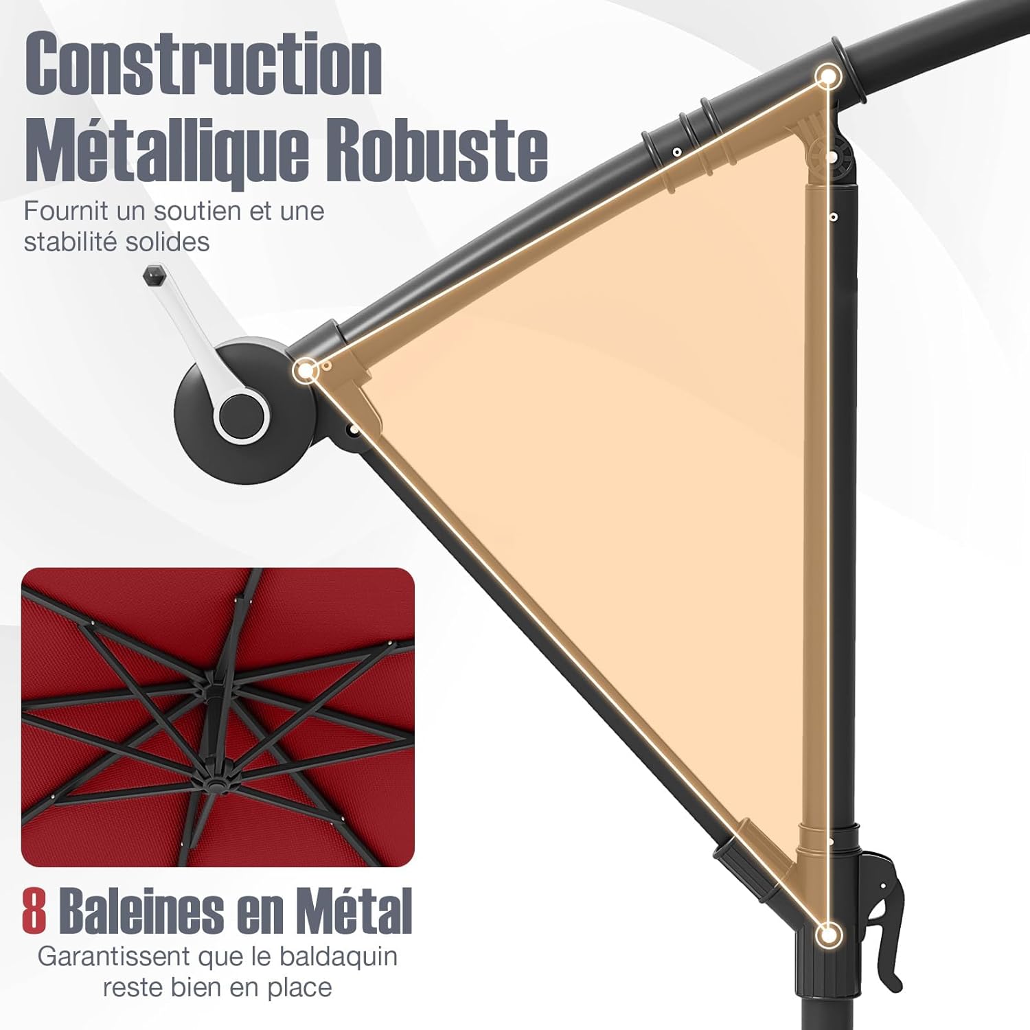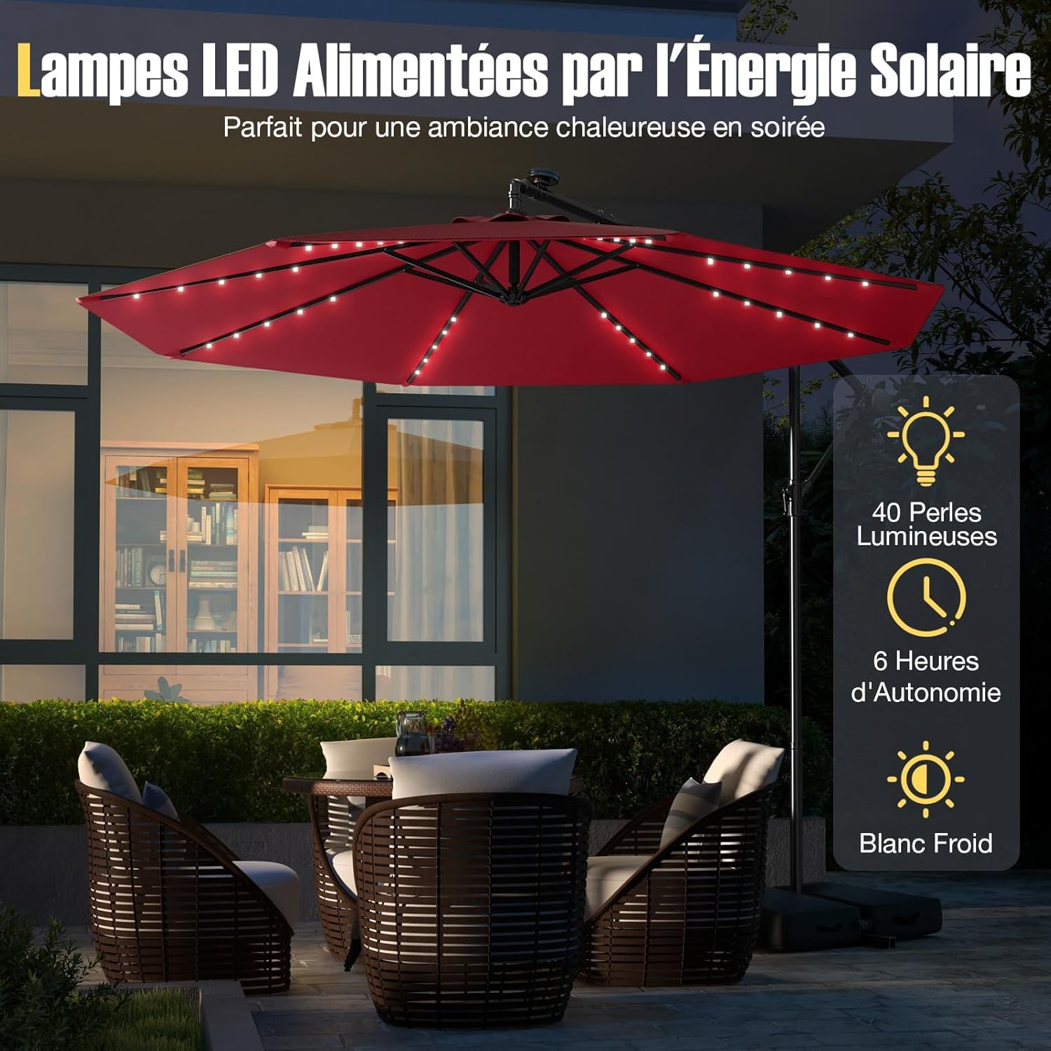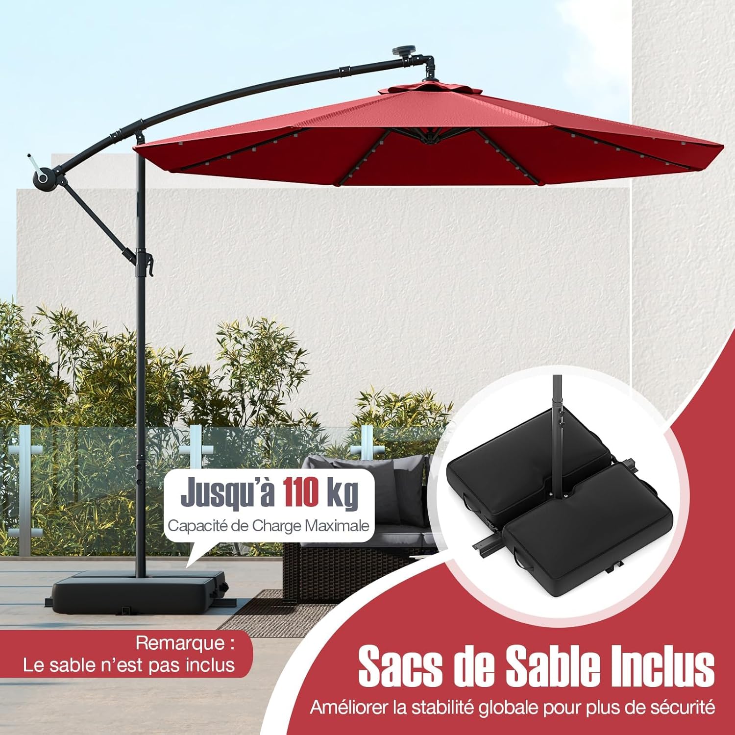 Parasol de jardin extérieur avec pied, parasol déporté inclinable, avec 8 baleines 40 lampes led rouge
