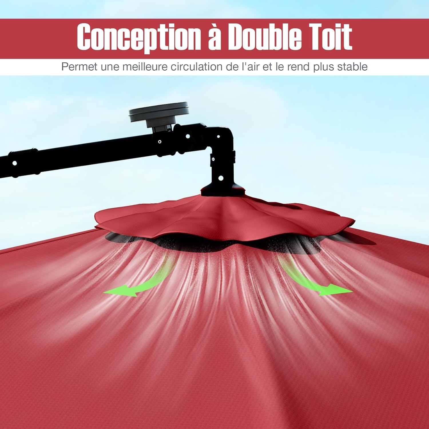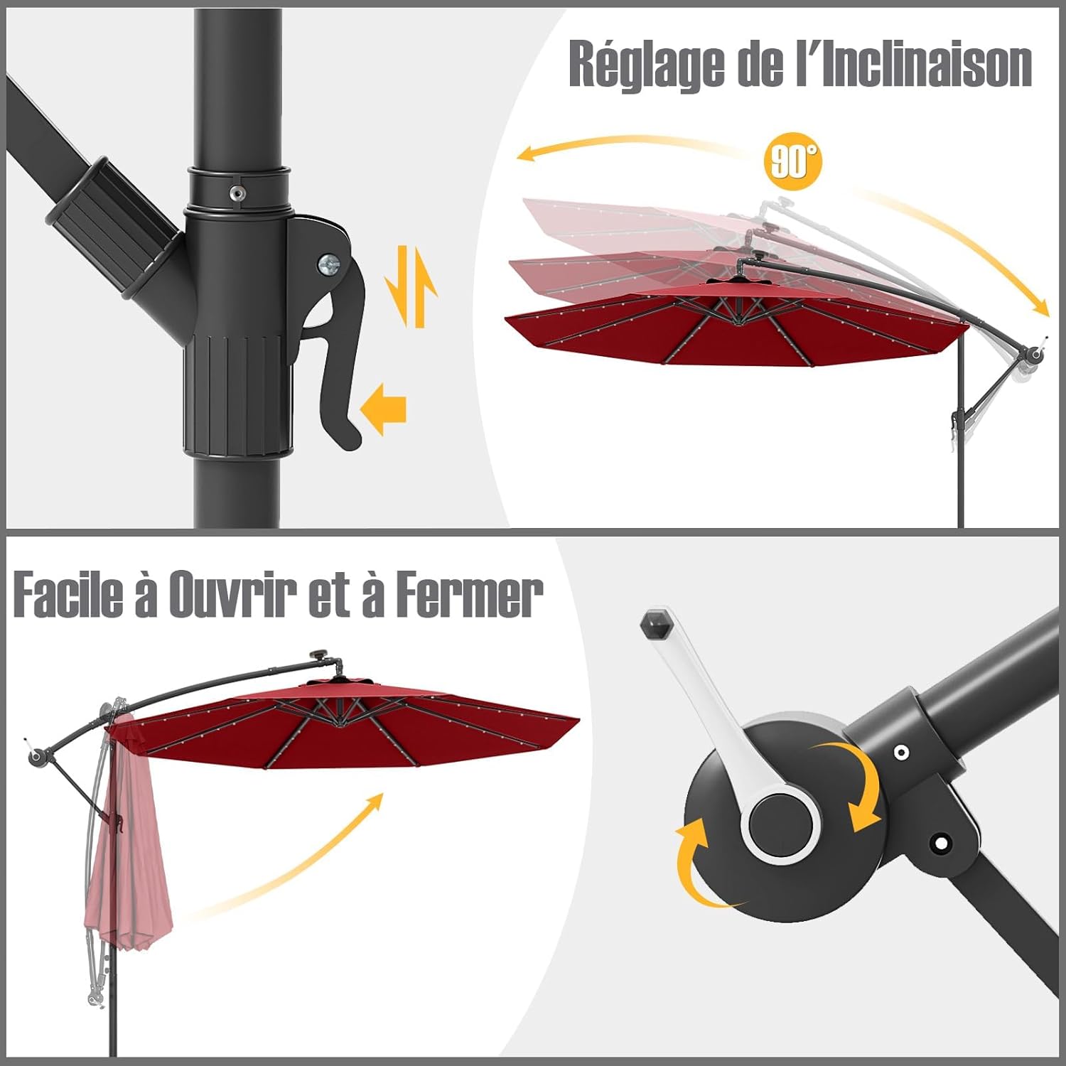 | Libellé | Parasol de jardin extérieur avec pied, parasol déporté inclinable, avec 8 baleines 40 lampes led rouge |