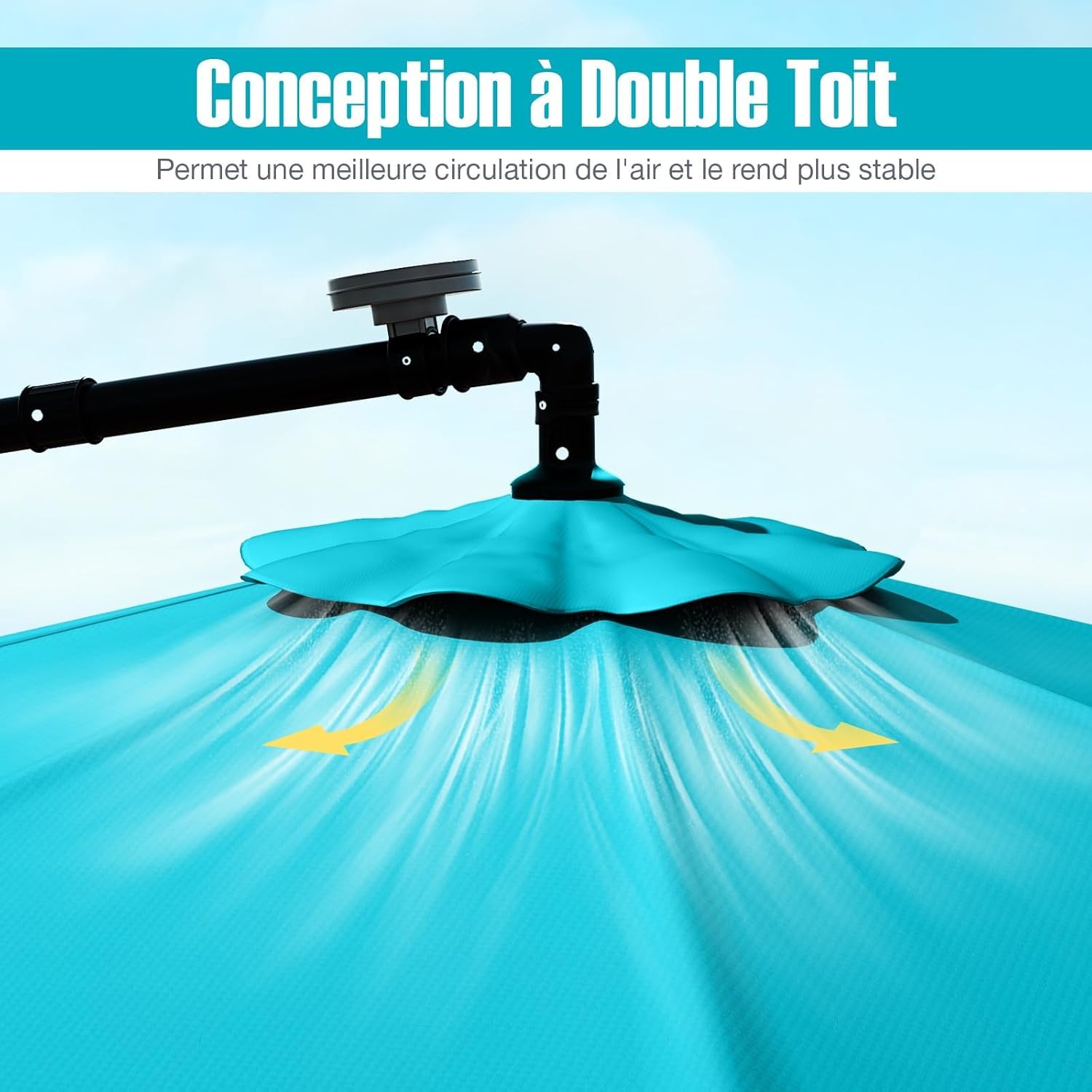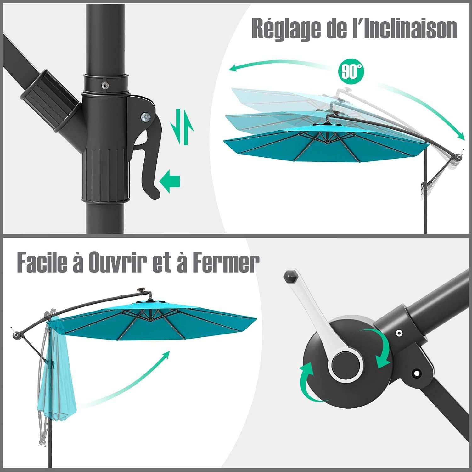 | Libellé | Parasol de jardin extérieur avec pied, parasol déporté inclinable avec 8 baleines 40 lampes led turquoise |